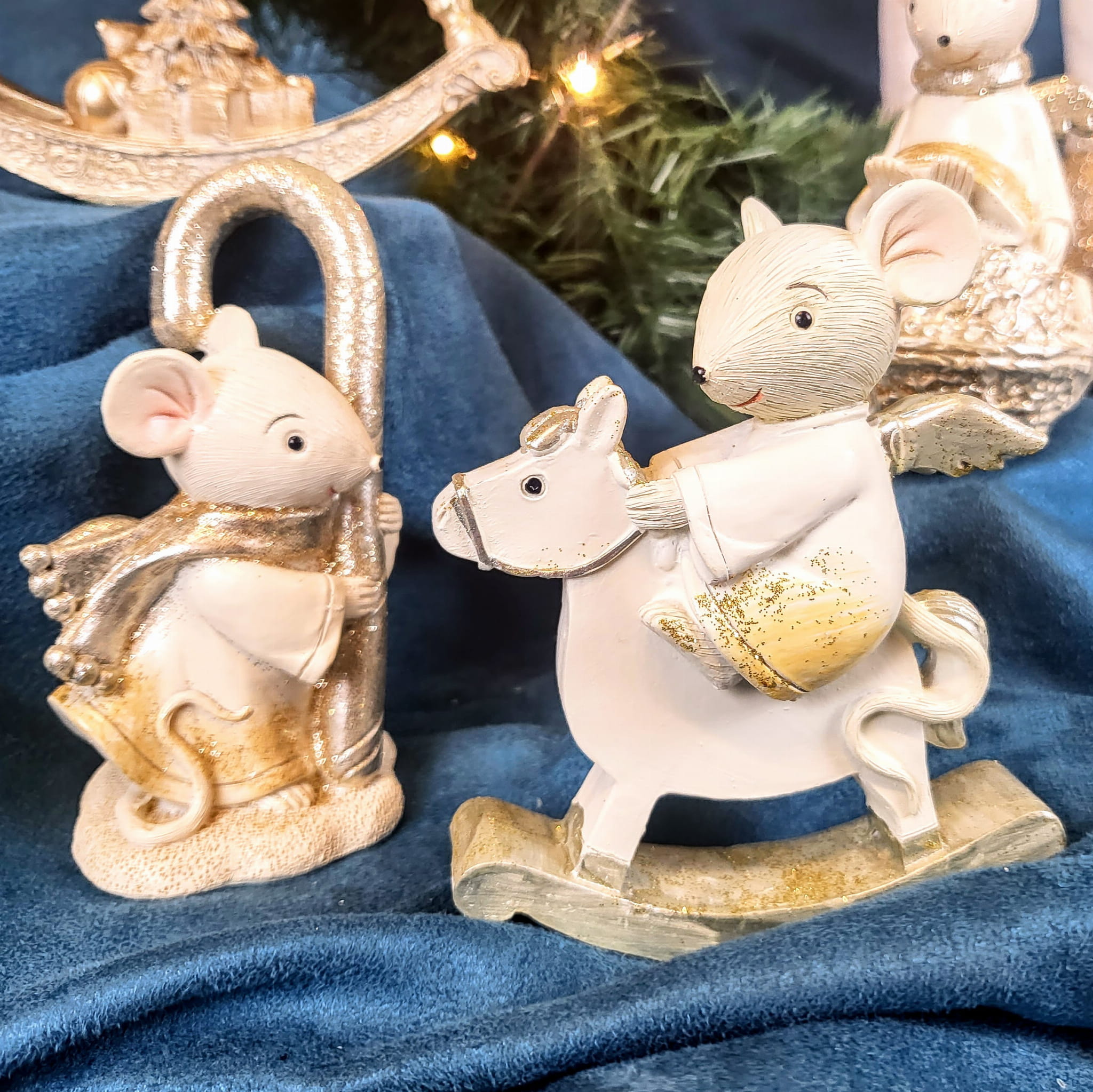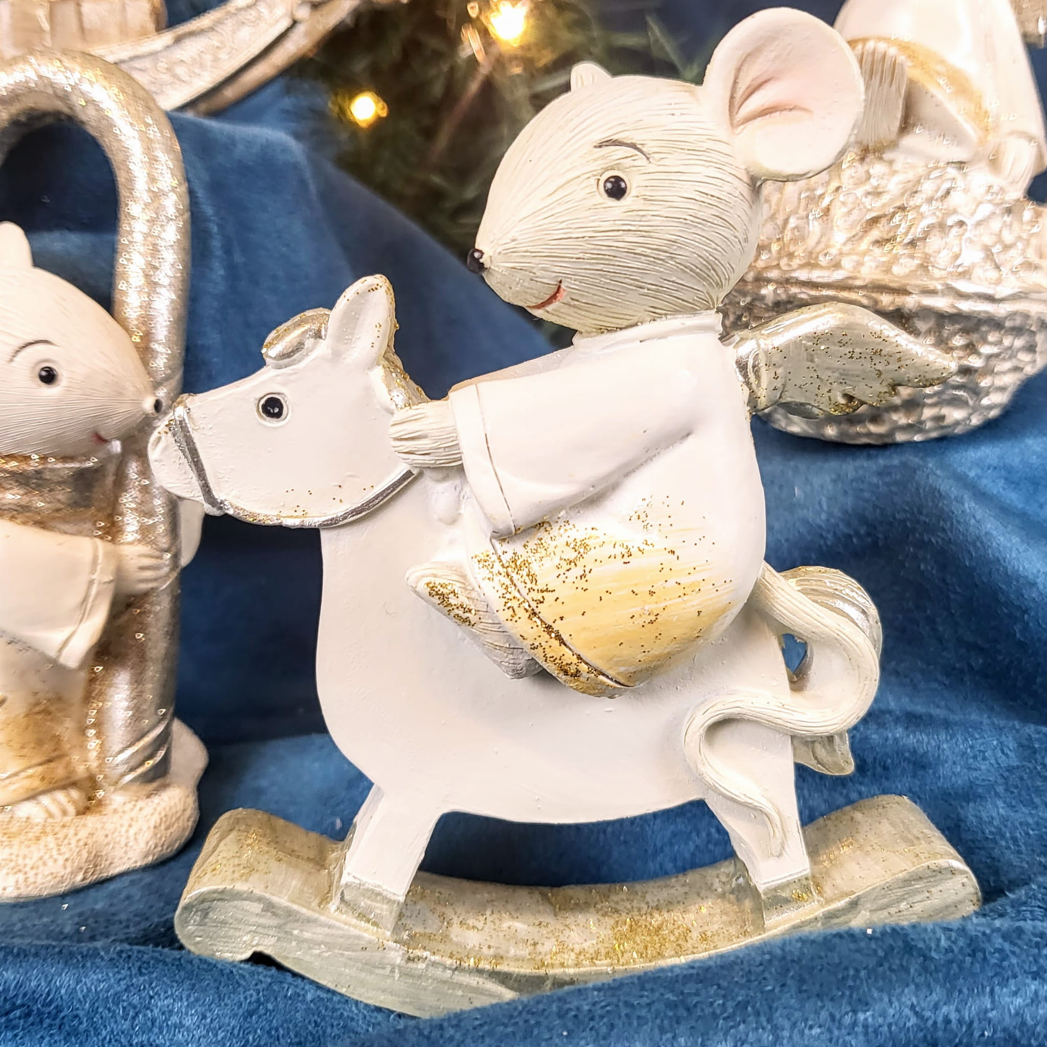 Figurka myszka w świątecznych kolorach na koniku będzie perfekcyjnym akcentem jako ozdoba komody, stołu i w innym dowolnym miejscu w okresie świąt bożonarodzeniowych.