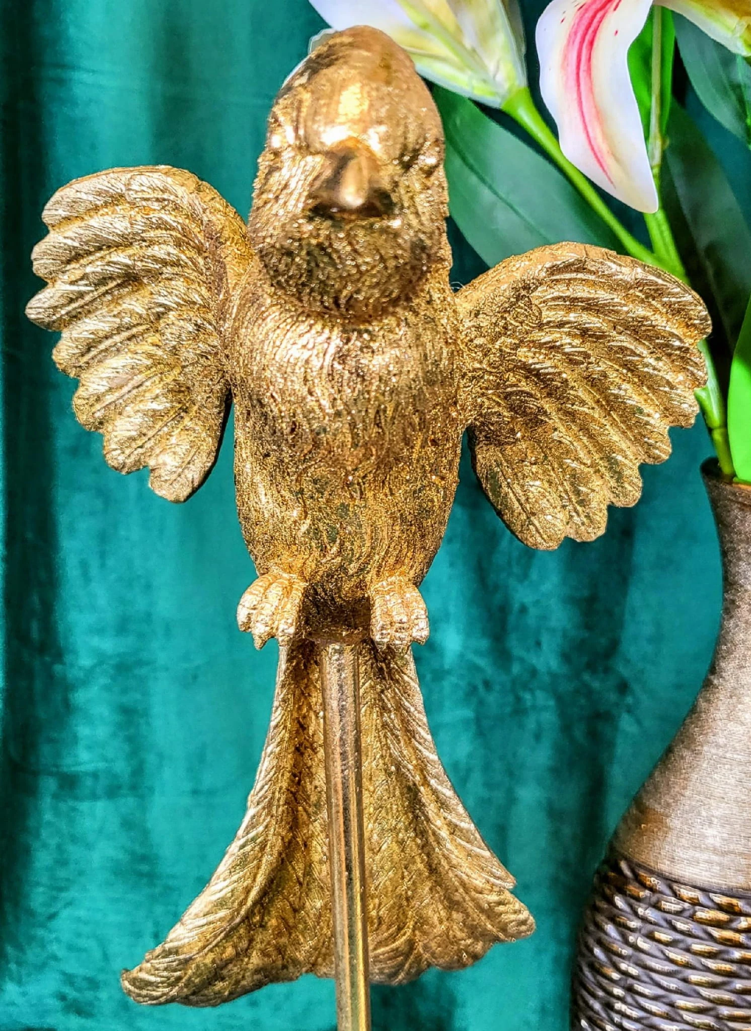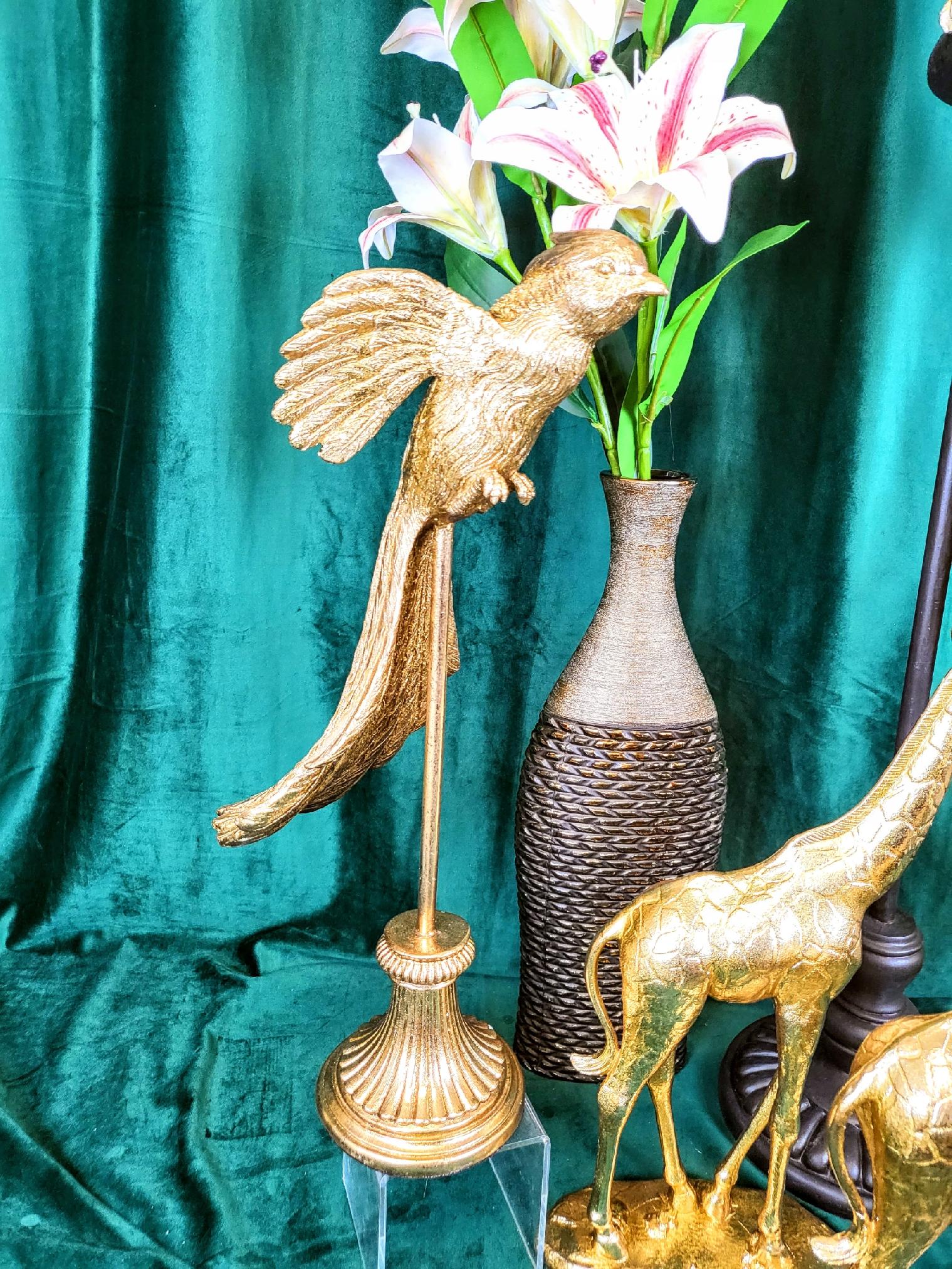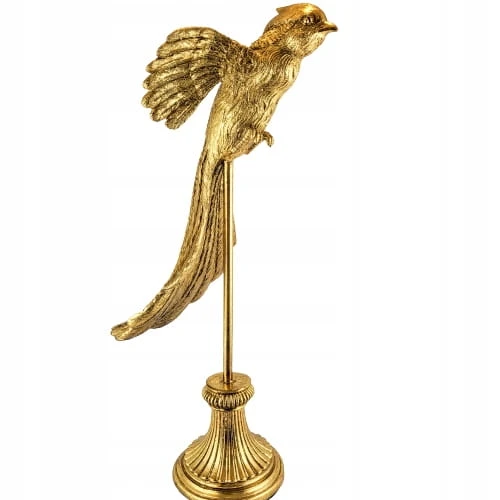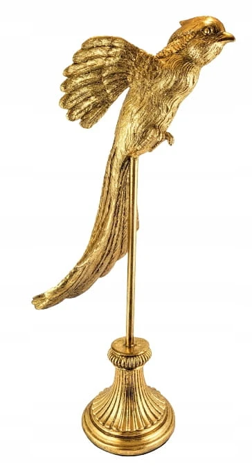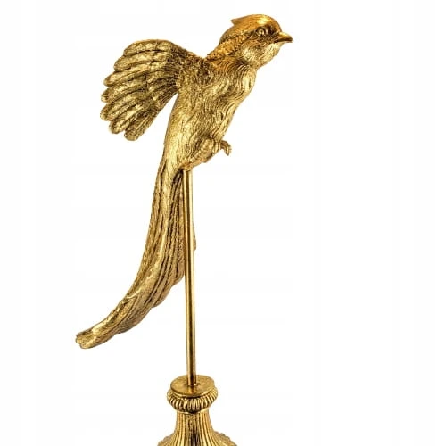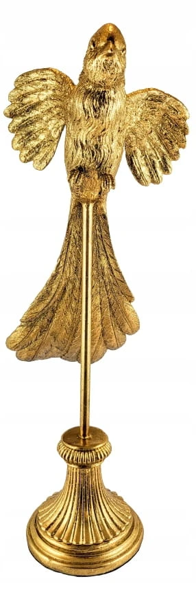 Złota figurka papugi wykonana z dbałością o szczegóły z trwałego tworzywa. Dekoracyjna papuga ozdobi biuro, salon czy sypialnię. Realistyczna rzeźba jest idealnym elementem dekoracyjnym dla miłośników przyrody i oryginalnych dekoracji. Figurka papugi to także doskonały prezent dla ornitologa.
