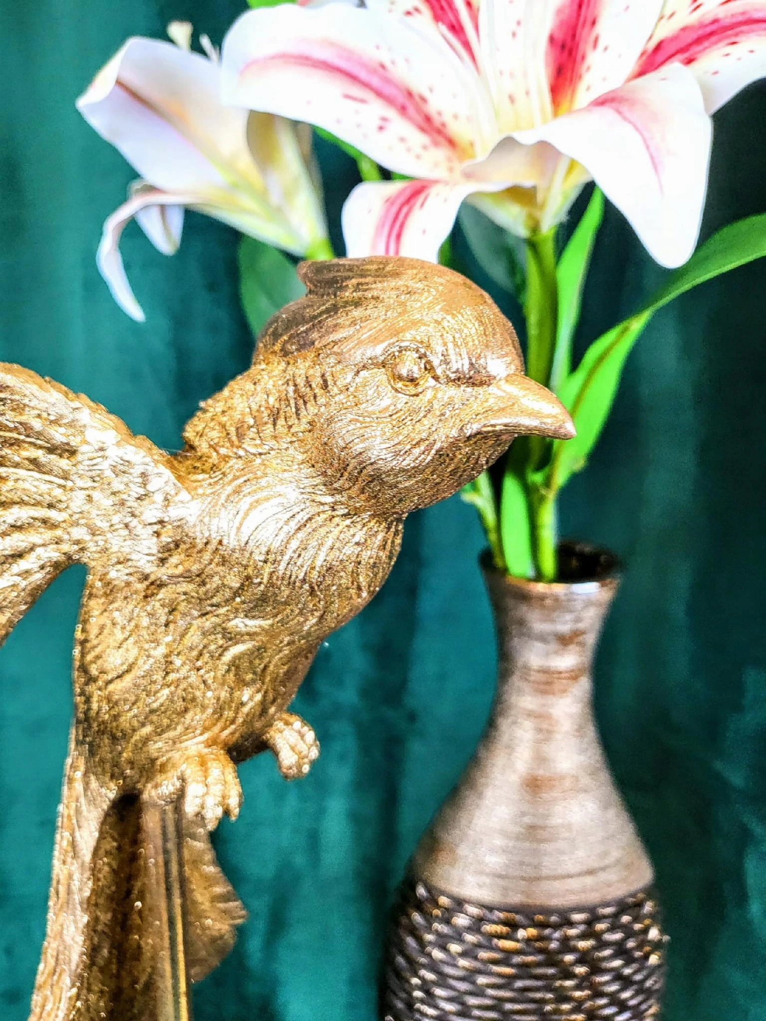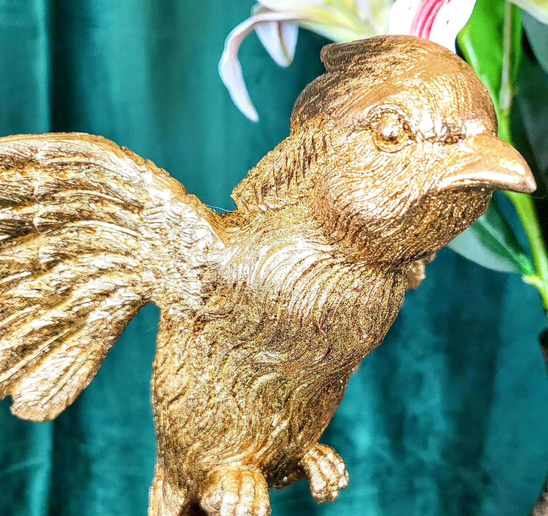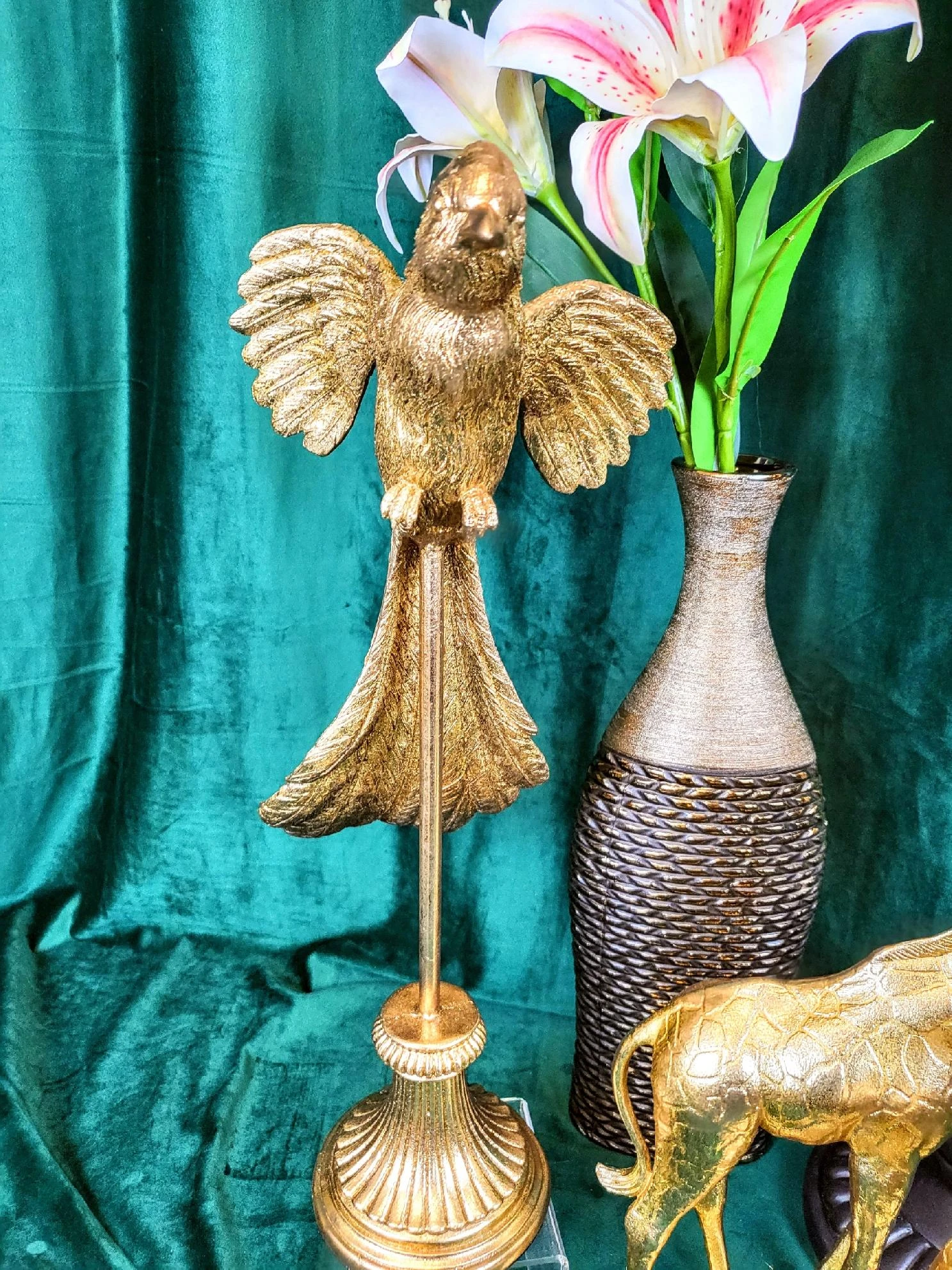Złota figurka papugi wykonana z dbałością o szczegóły z trwałego tworzywa. Dekoracyjna papuga ozdobi biuro, salon czy sypialnię. Realistyczna rzeźba jest idealnym elementem dekoracyjnym dla miłośników przyrody i oryginalnych dekoracji. Figurka papugi to także doskonały prezent dla ornitologa.
