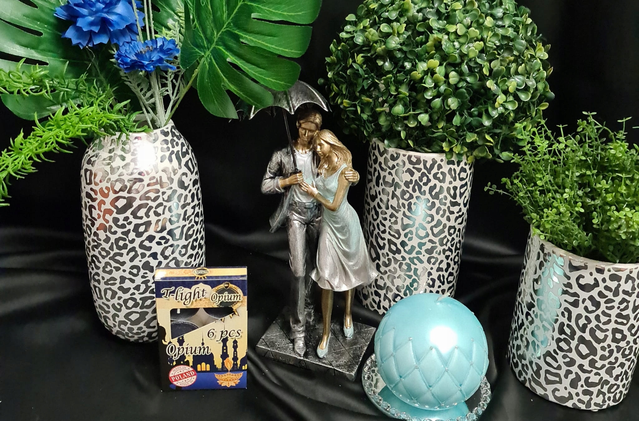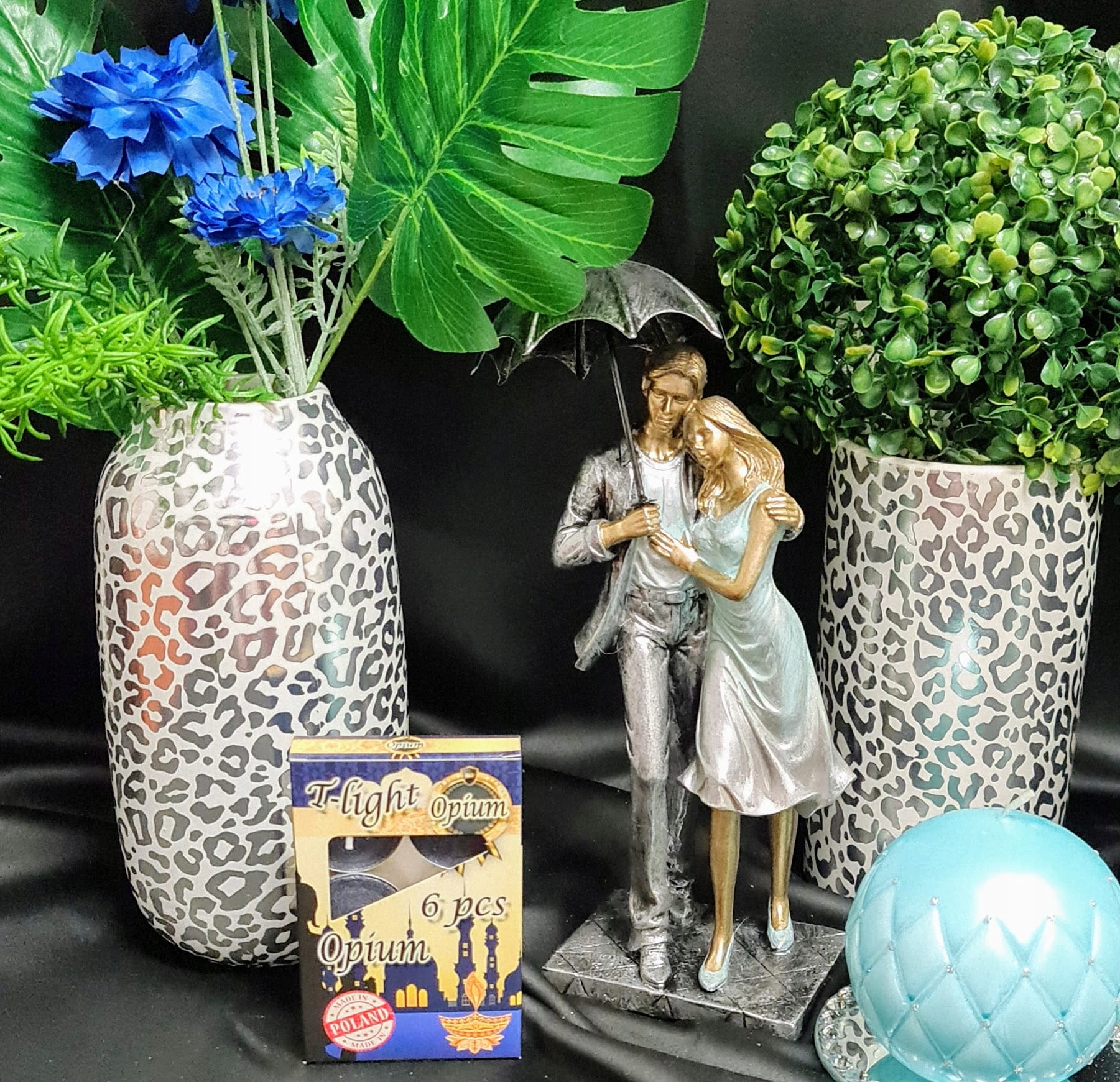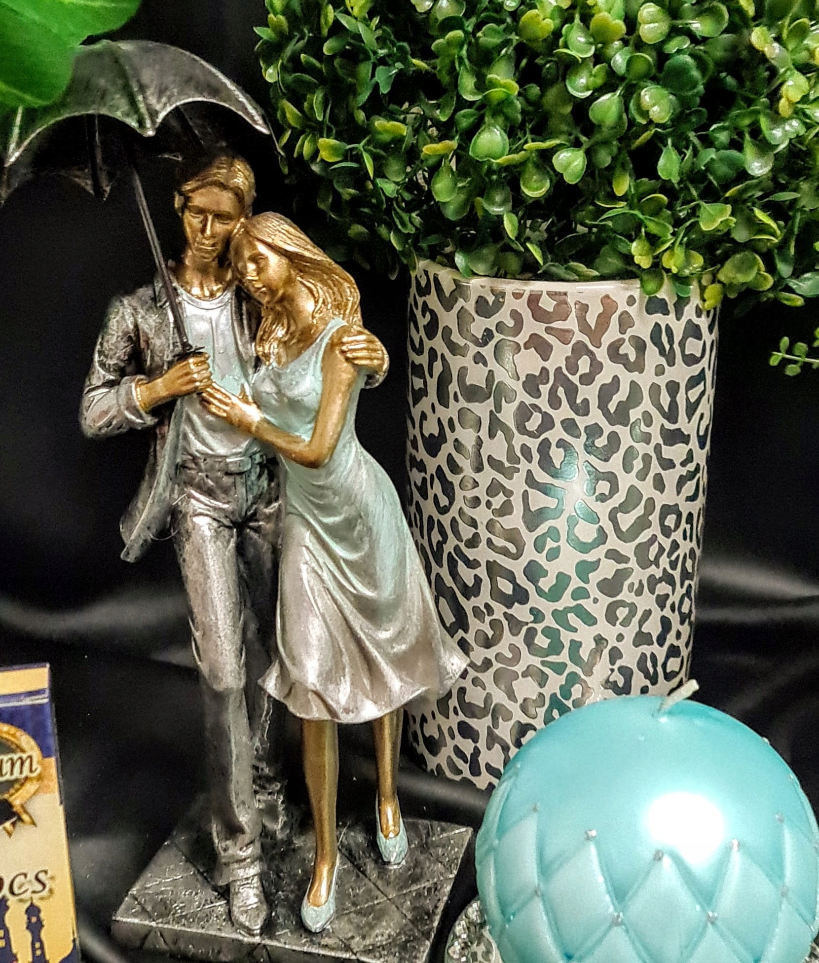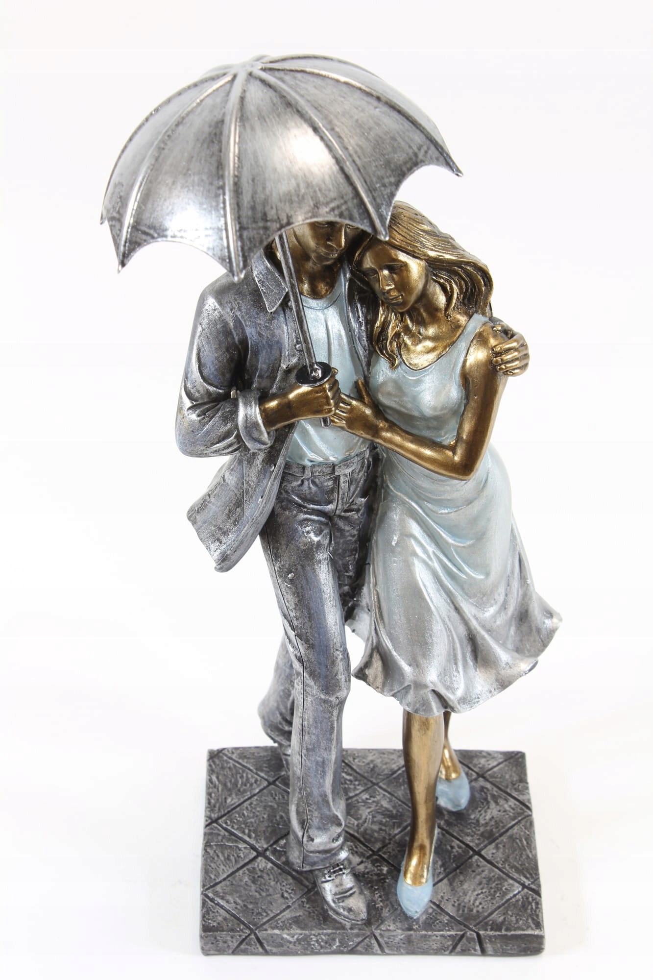 Oryginalna figurka z wizerunkiem kochającej się pary pod parasolem w kolorze srebra, złota i błękitu. Sprawdzi się jako ozdoba mieszkania w stylu klasycznym, jak i nowoczesnym. Jej niepowtarzalny design sprawi że nikt nie przejdzie obok niej obojętnie. Doskonały ślubny prezent.