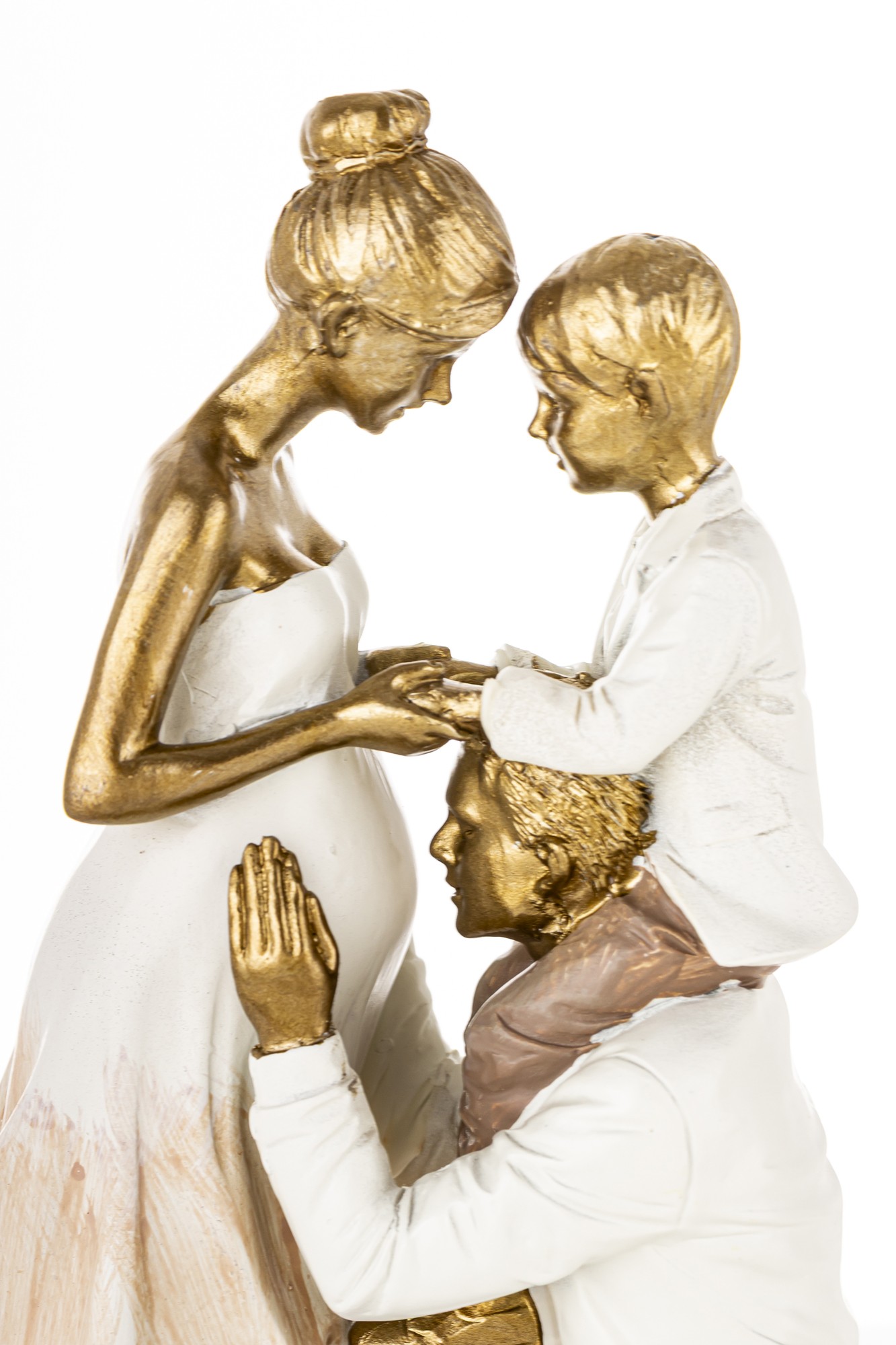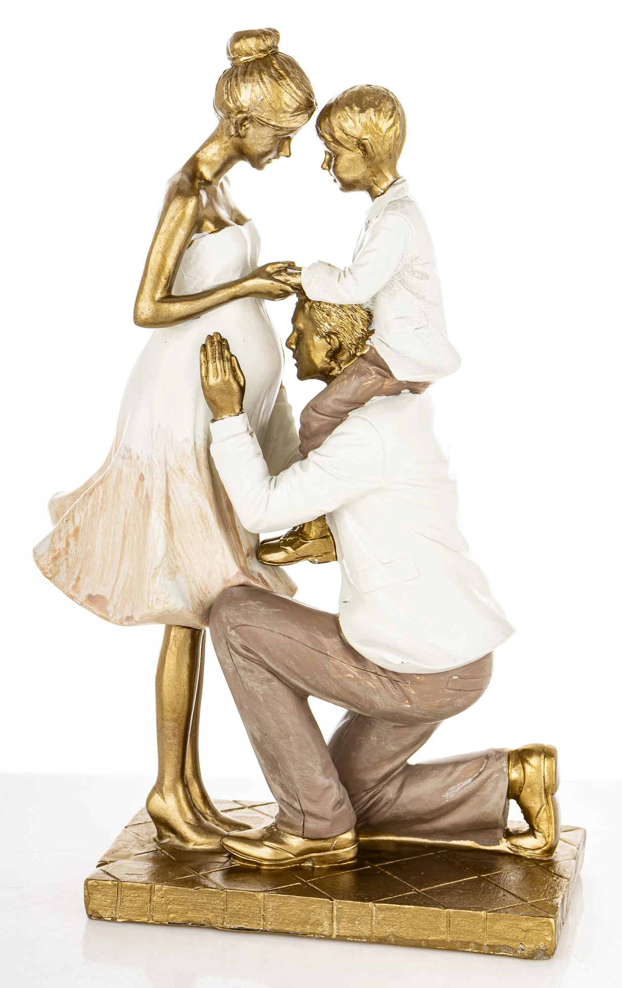 Figurka została zaprojektowana w nowoczesnym stylu, łączącym matowe powierzchnie ubrań z połyskującymi, złotymi detalami postaci. Postać mężczyzny klęczącego z dzieckiem na barkach przed kobietą w ciąży tworzy stabilną, trójkątną kompozycję, która przyciąga wzrok i zachęca do refleksji nad wartością więzi rodzinnych. Całość została osadzona na eleganckiej, złotej podstawie o subtelnej teksturze.