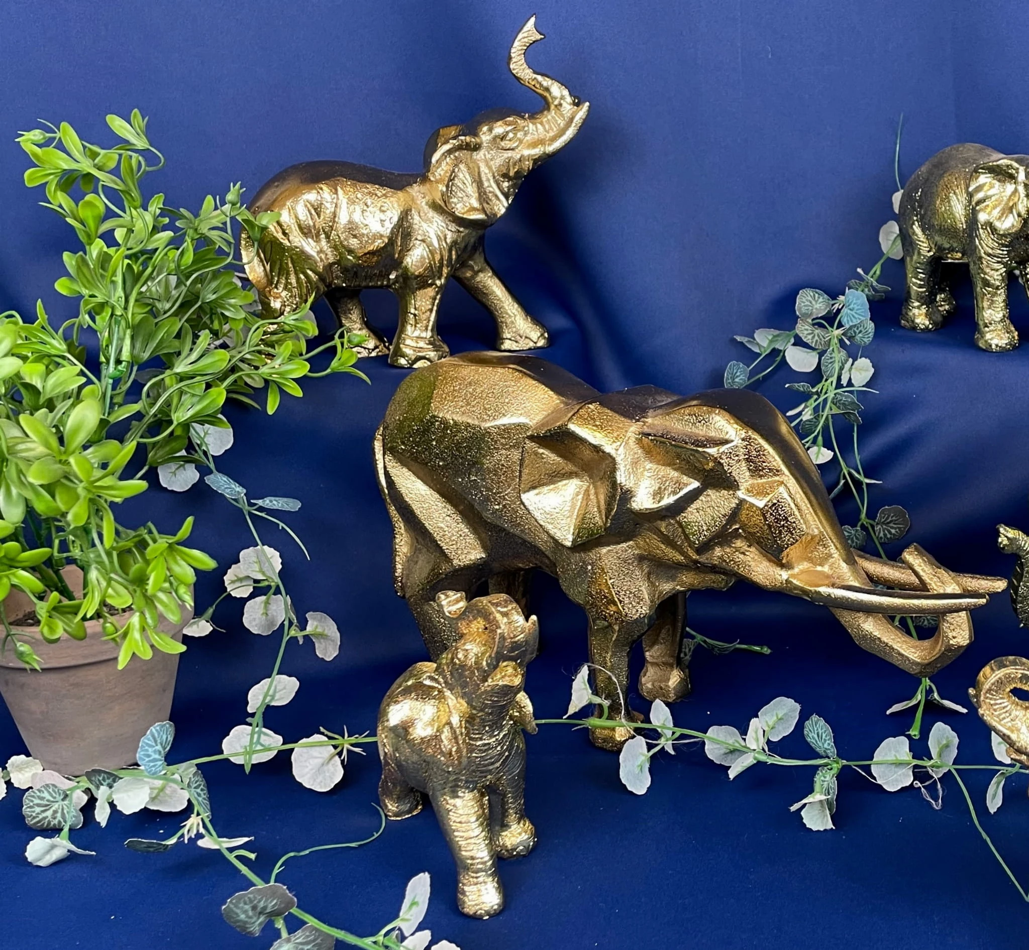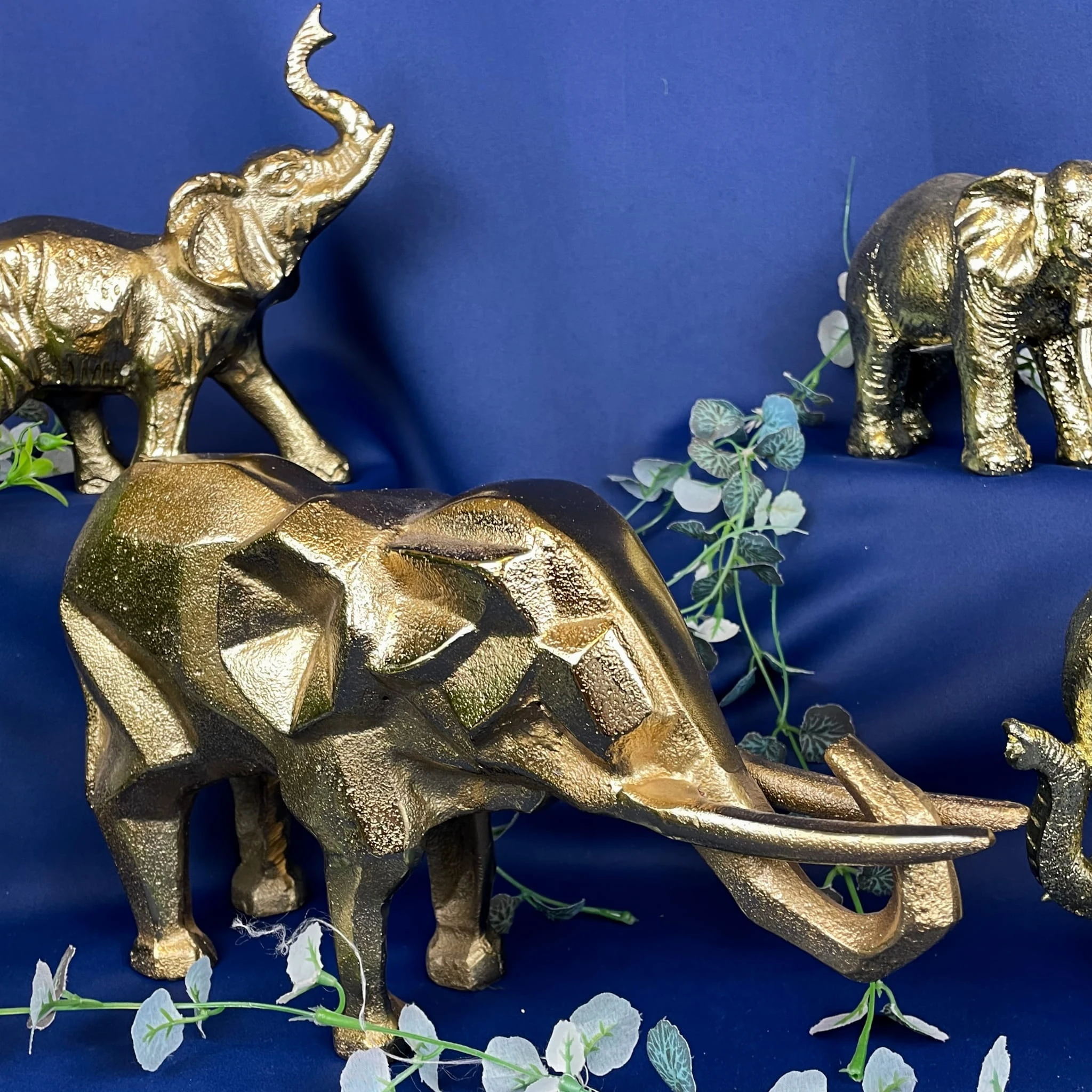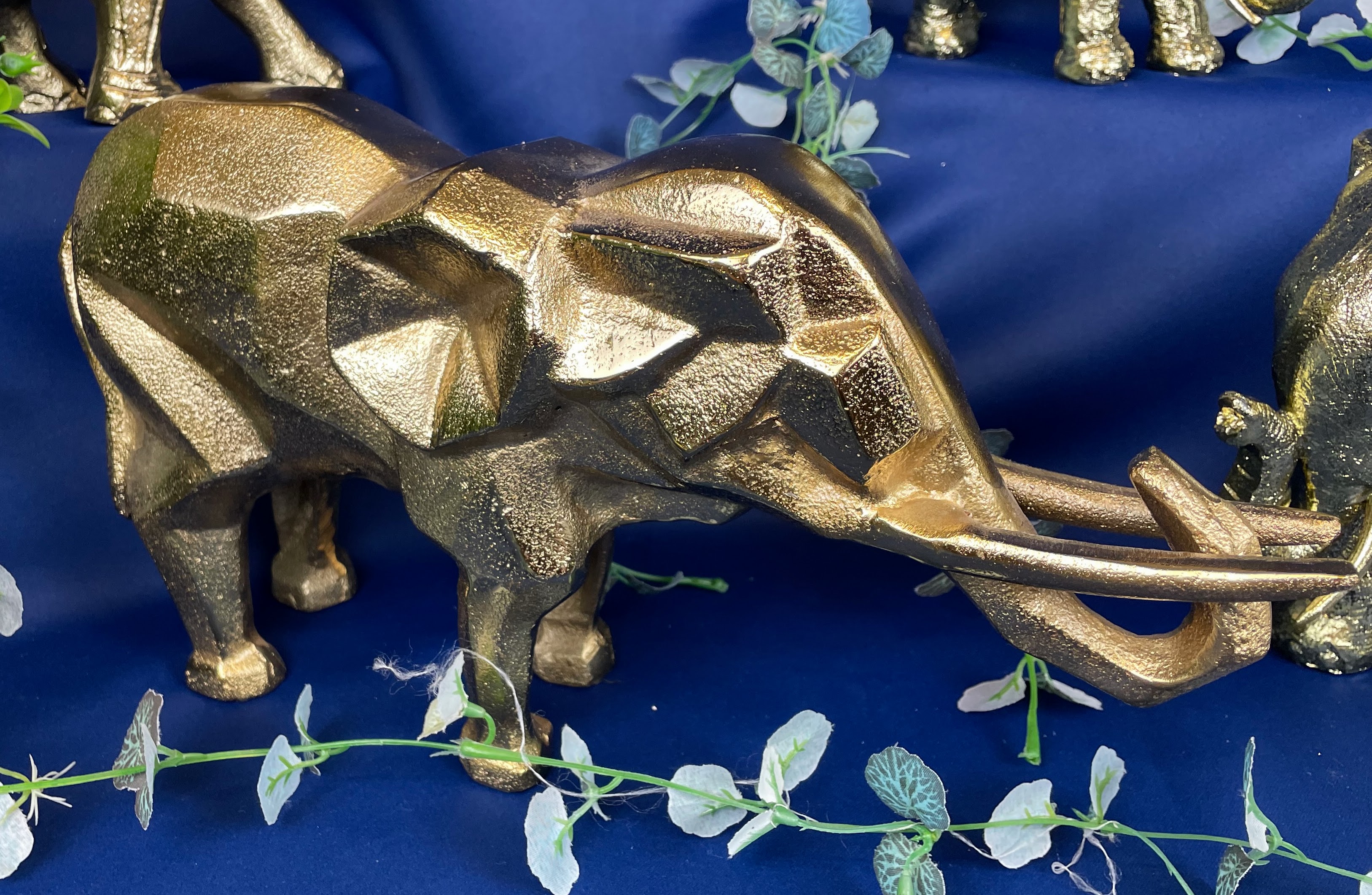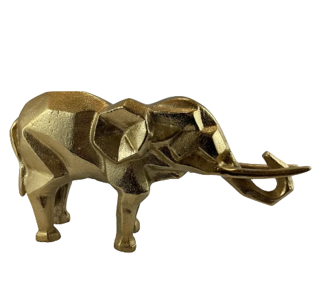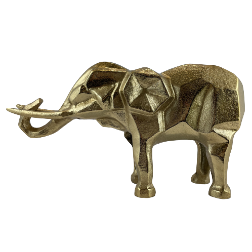 Geometryczna figurka słonia w złotym kolorze i uniesioną trąbą na szczęście, to ozdoba, którą postawisz na stoliku, biurku w domu lub biurze.