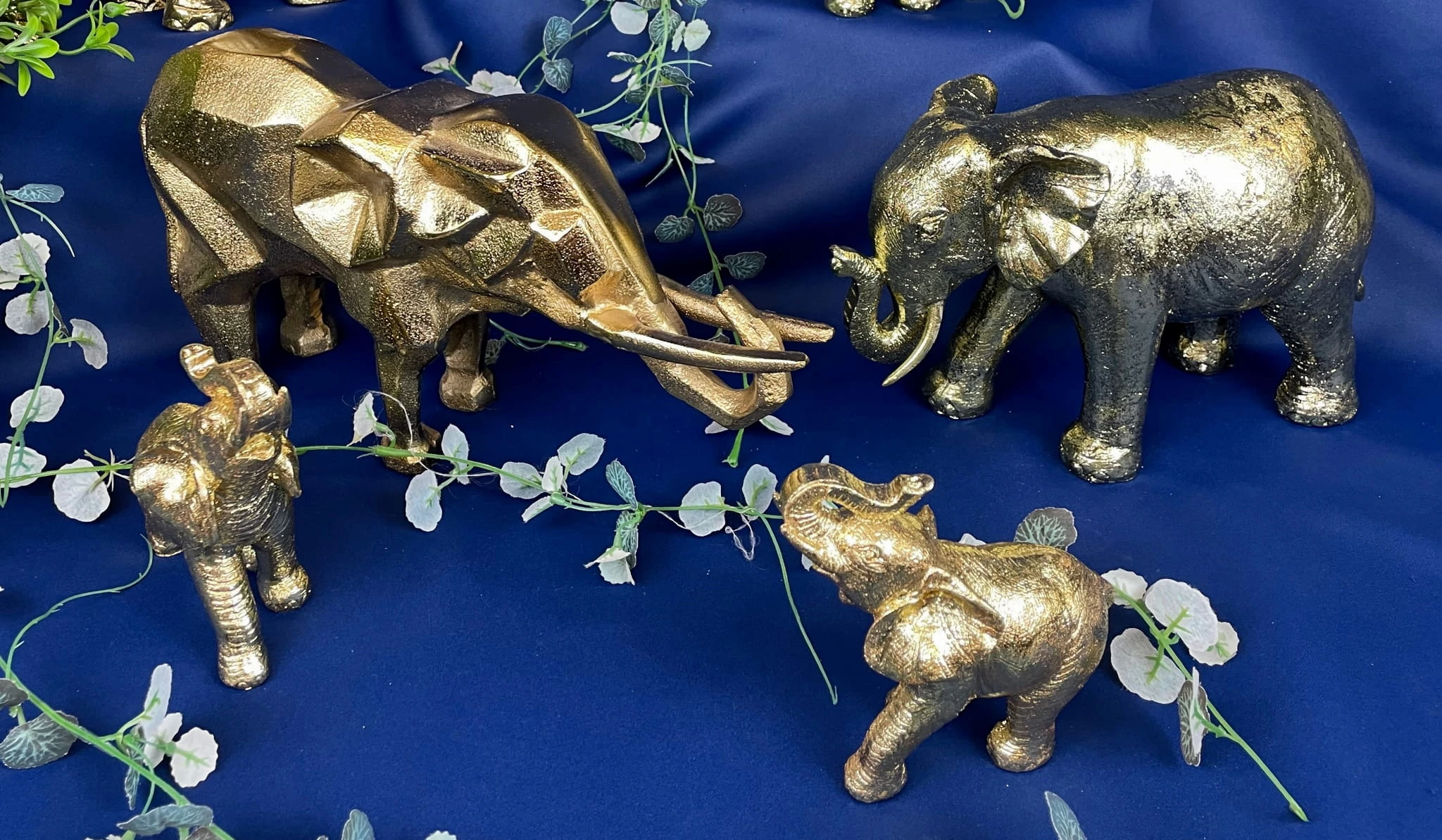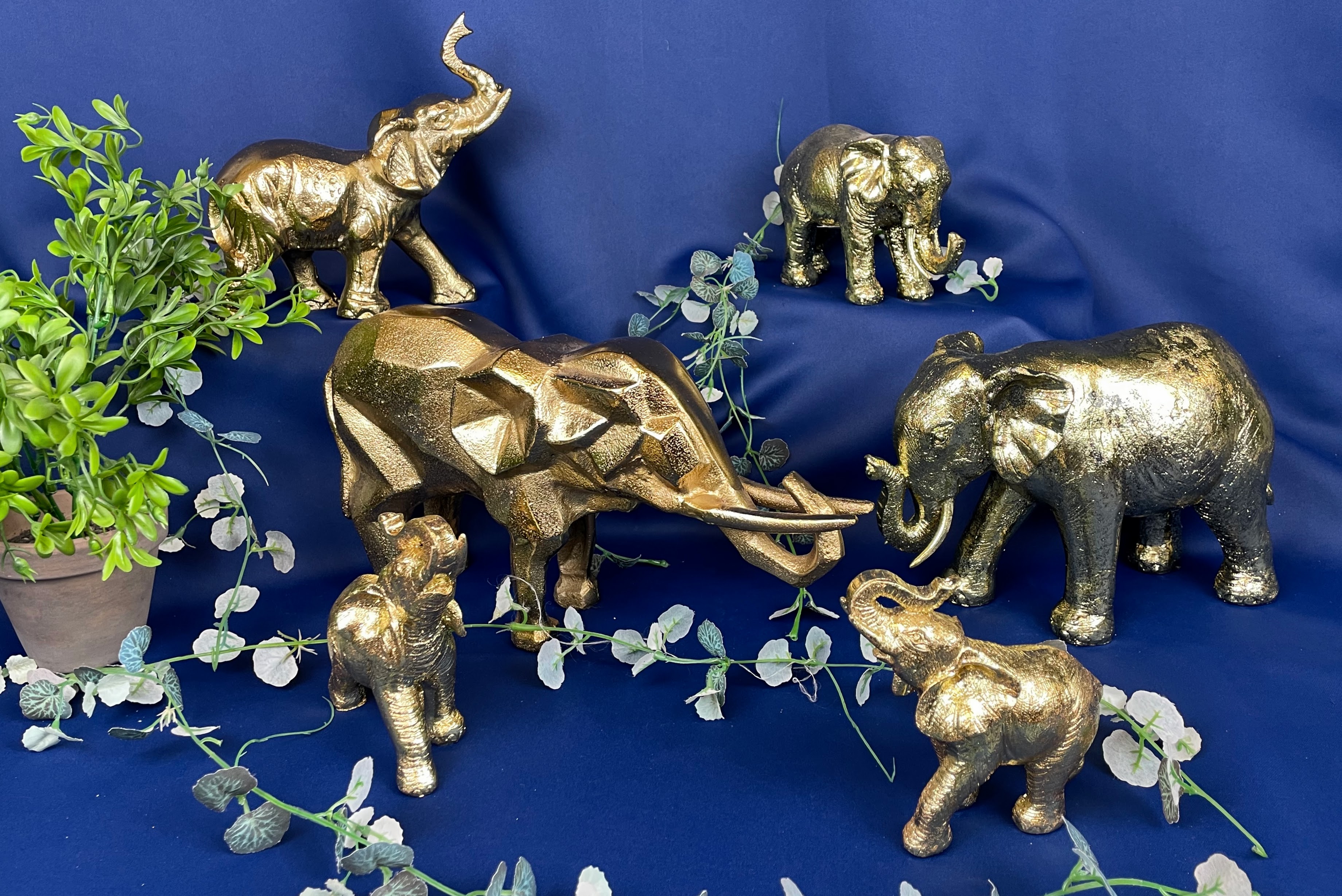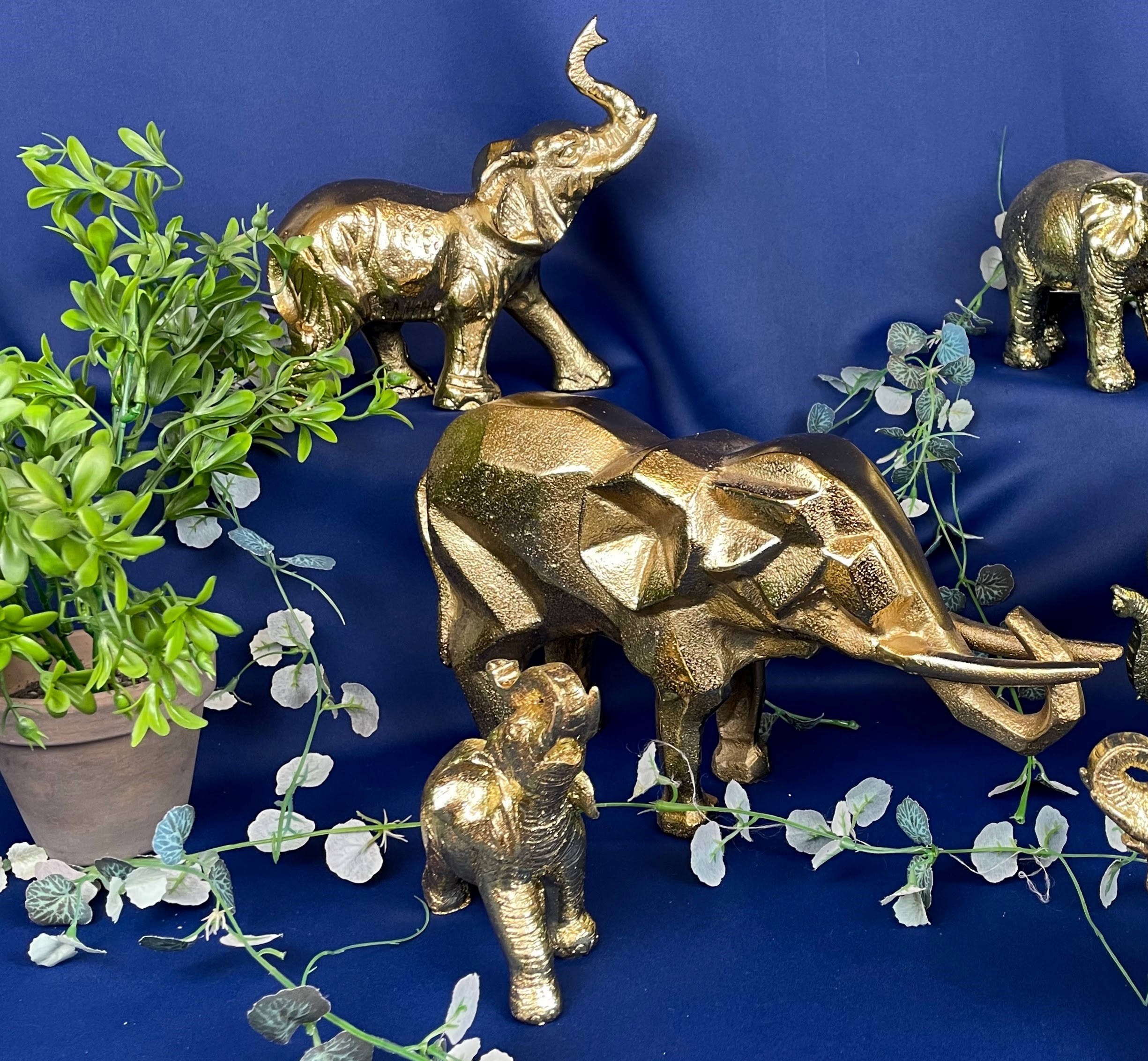Geometryczna figurka słonia w złotym kolorze i uniesioną trąbą na szczęście, to ozdoba, którą postawisz na stoliku, biurku w domu lub biurze.