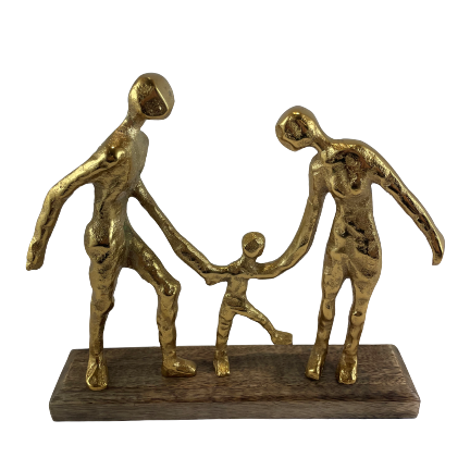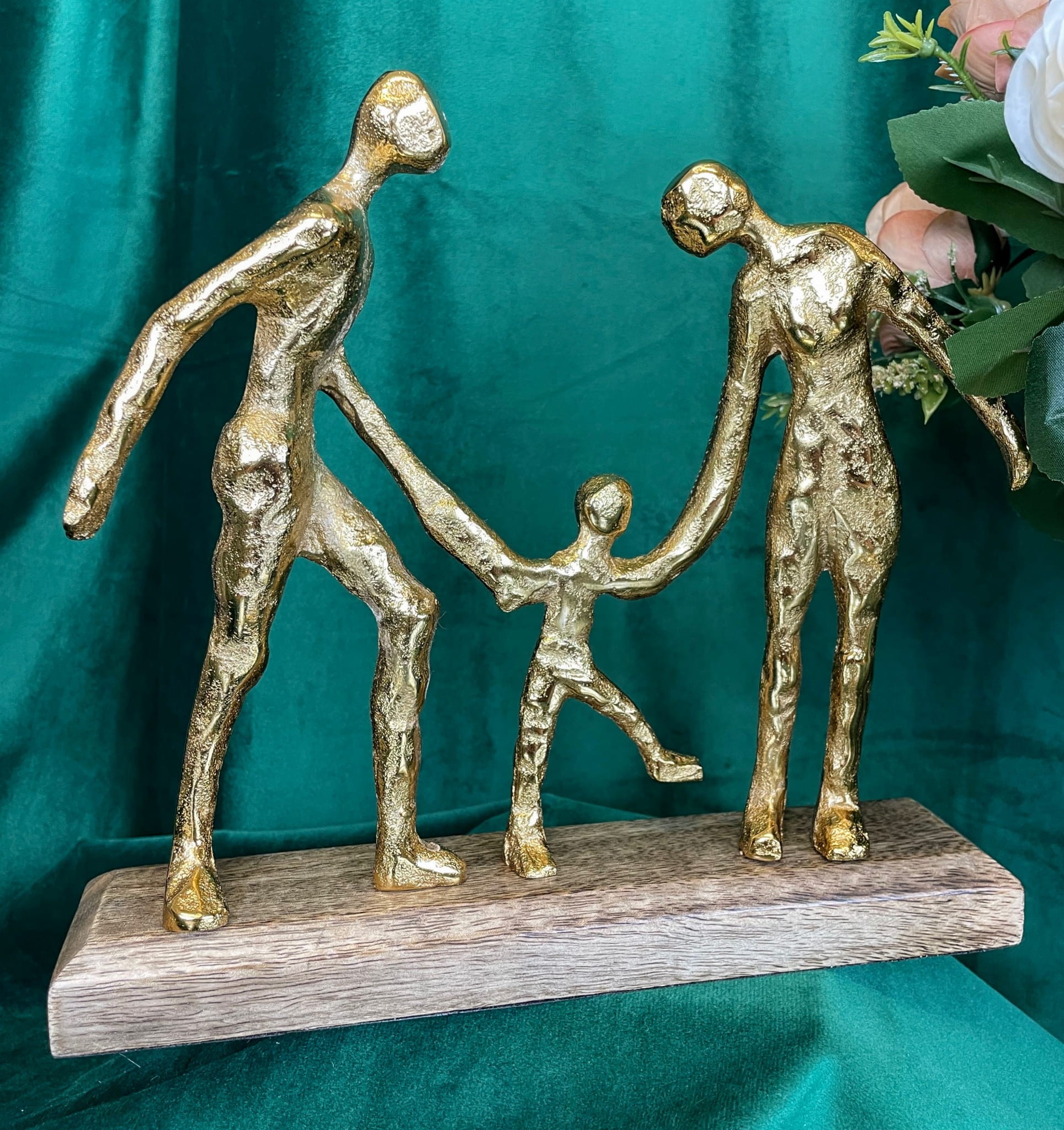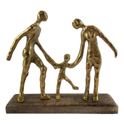 Oryginalna figurka z wizerunkiem rodziny w kolorze złota na drewnianej podstawie. Sprawdzi się jako ozdoba mieszkania w stylu klasycznym, jak i nowoczesnym. Jej niepowtarzalny design sprawi że nikt nie przejdzie obok niej obojętnie. Doskonały prezent.