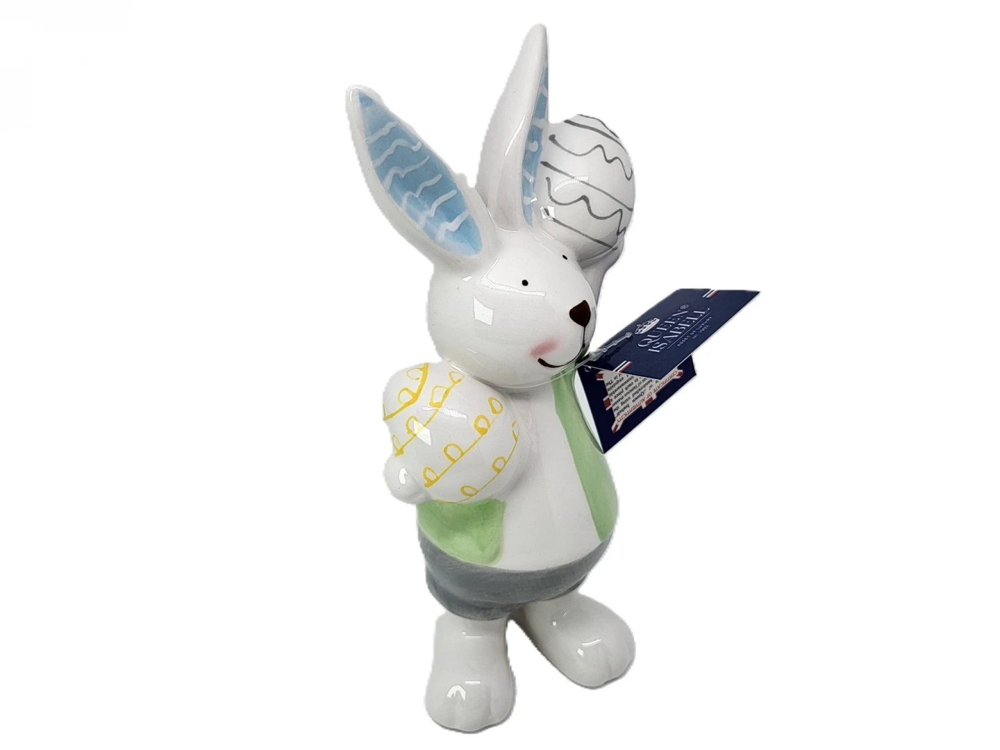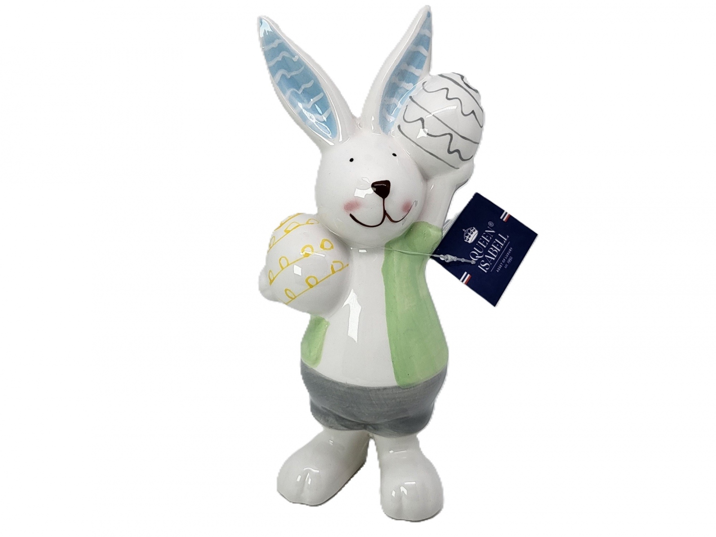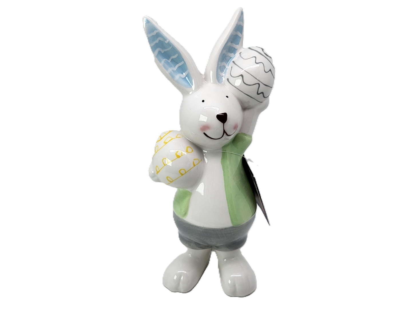 Urocza figurka Pana Królika trzymającego jajka ozdobione szlaczkami.