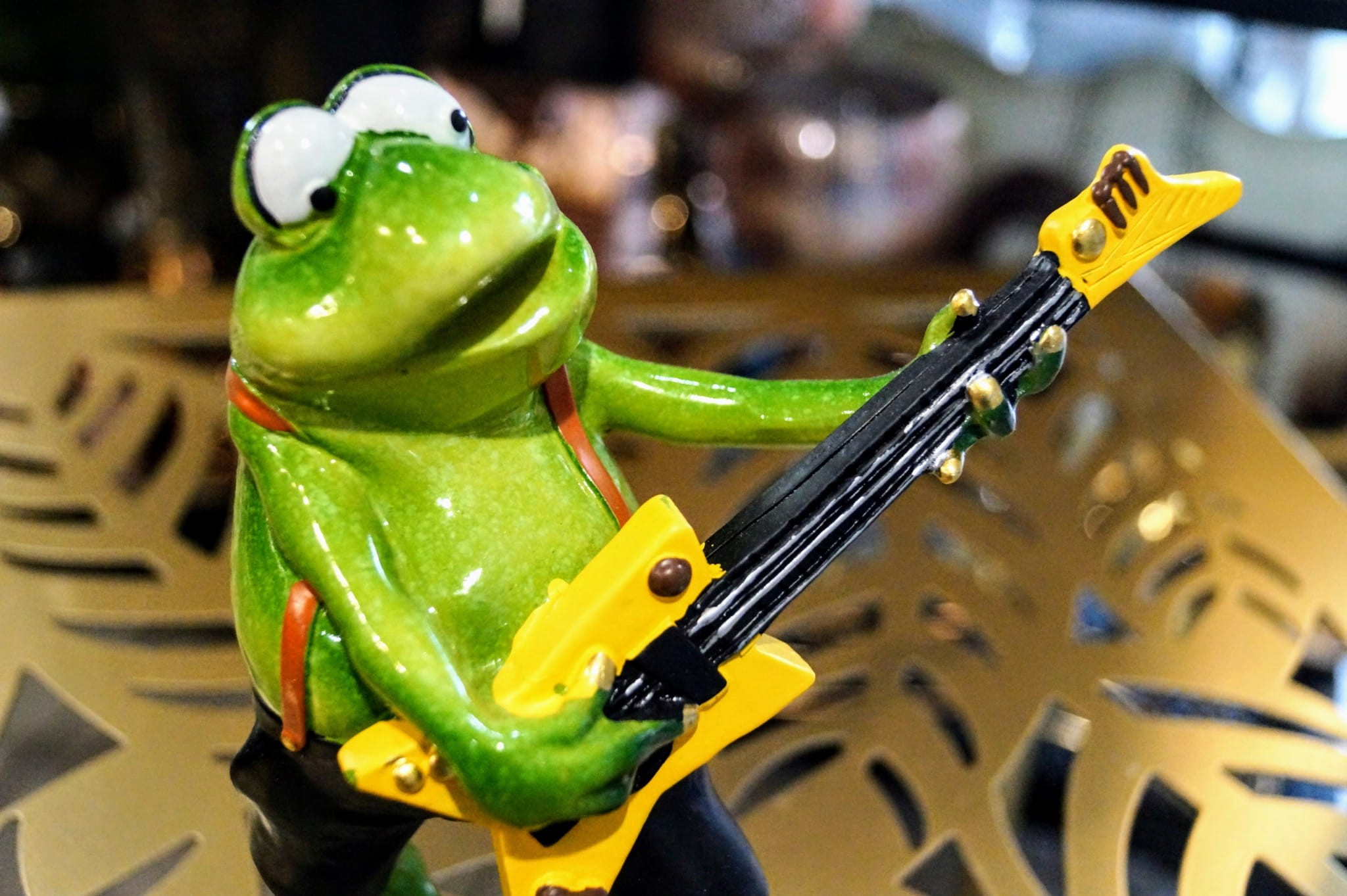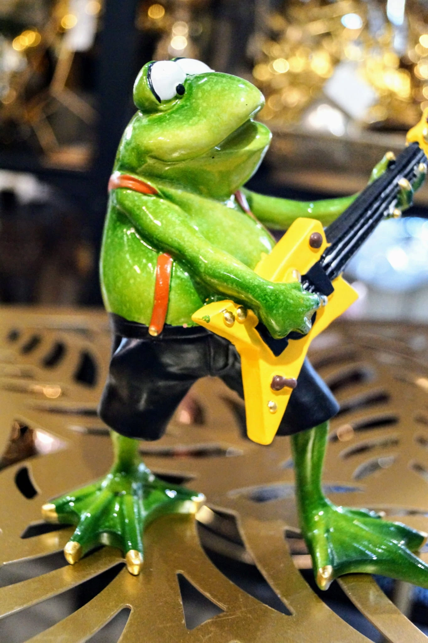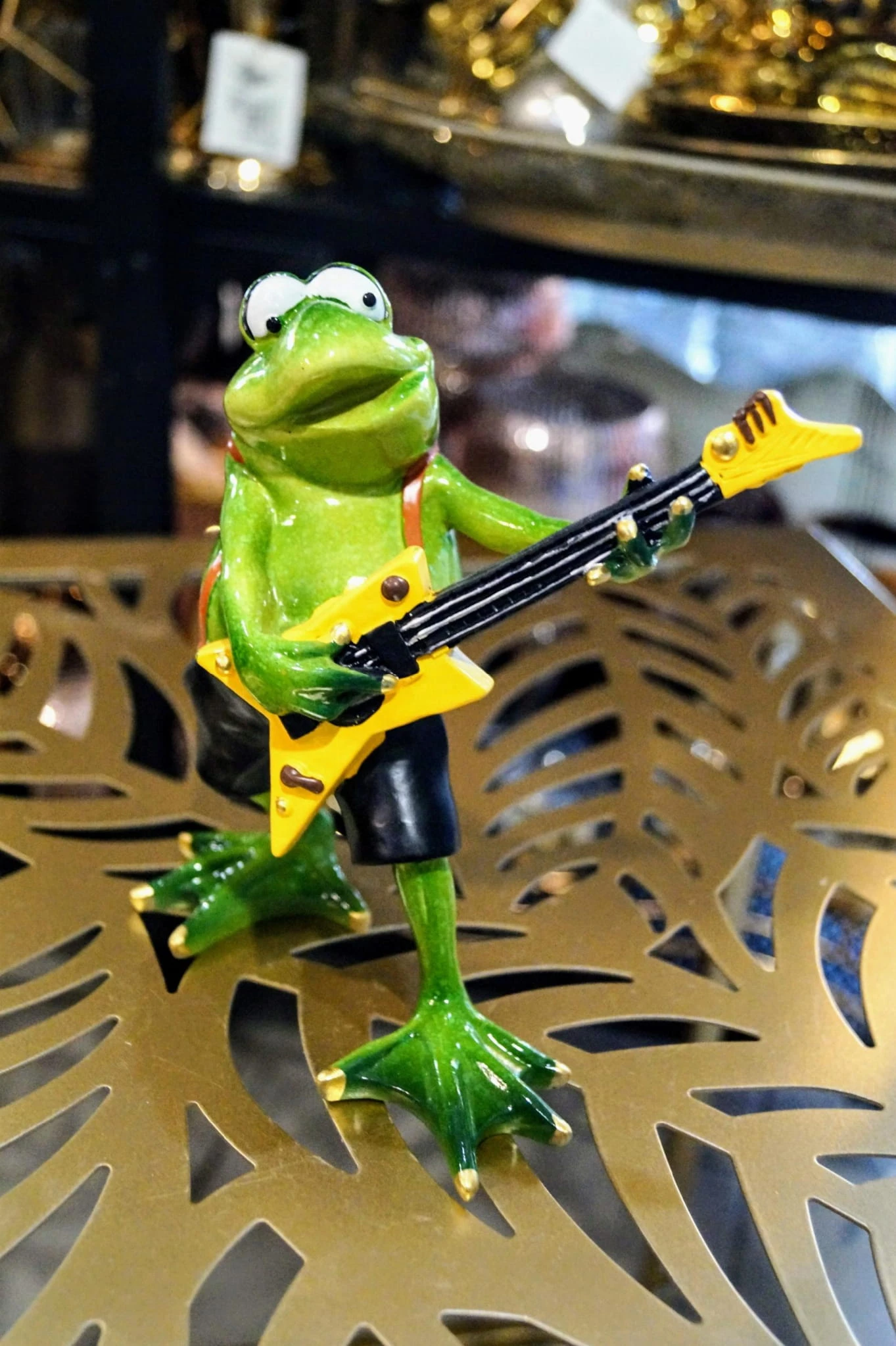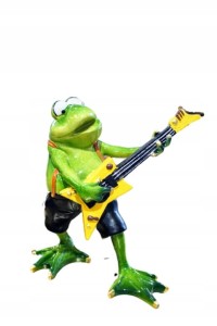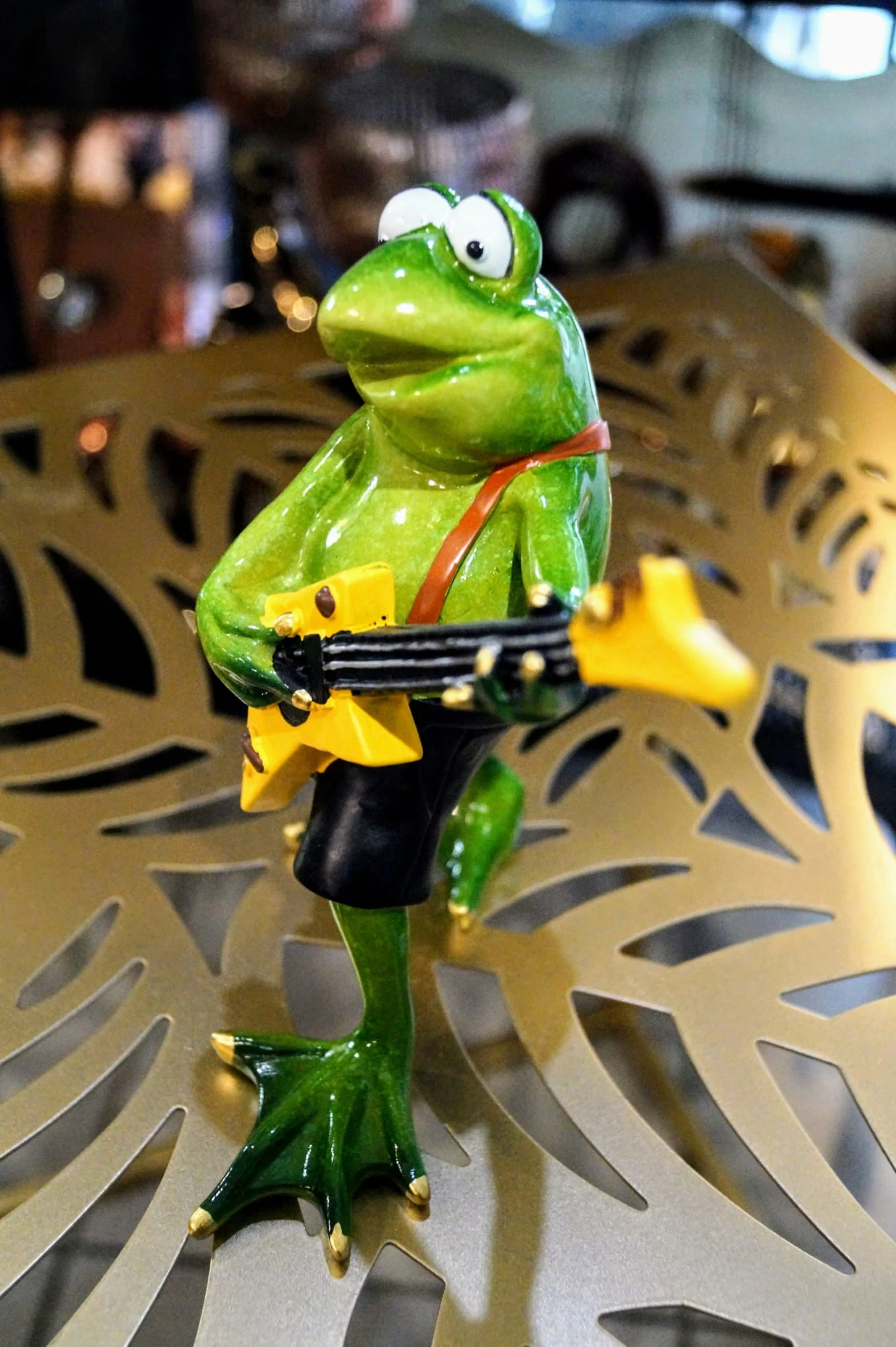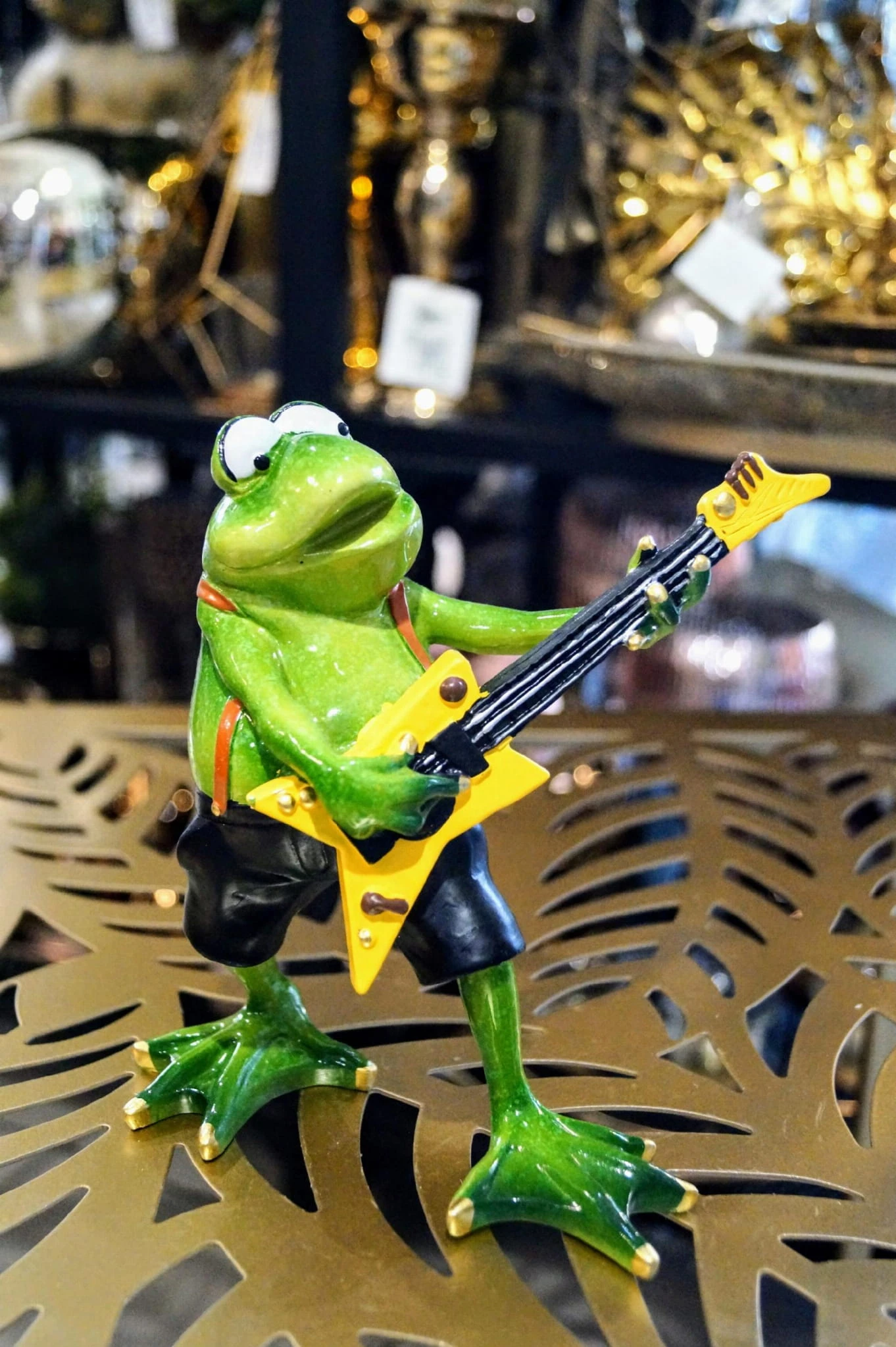 Dekoracyjna figurka żaby z żółtą, rockową gitarą, w kolorze zielonym.