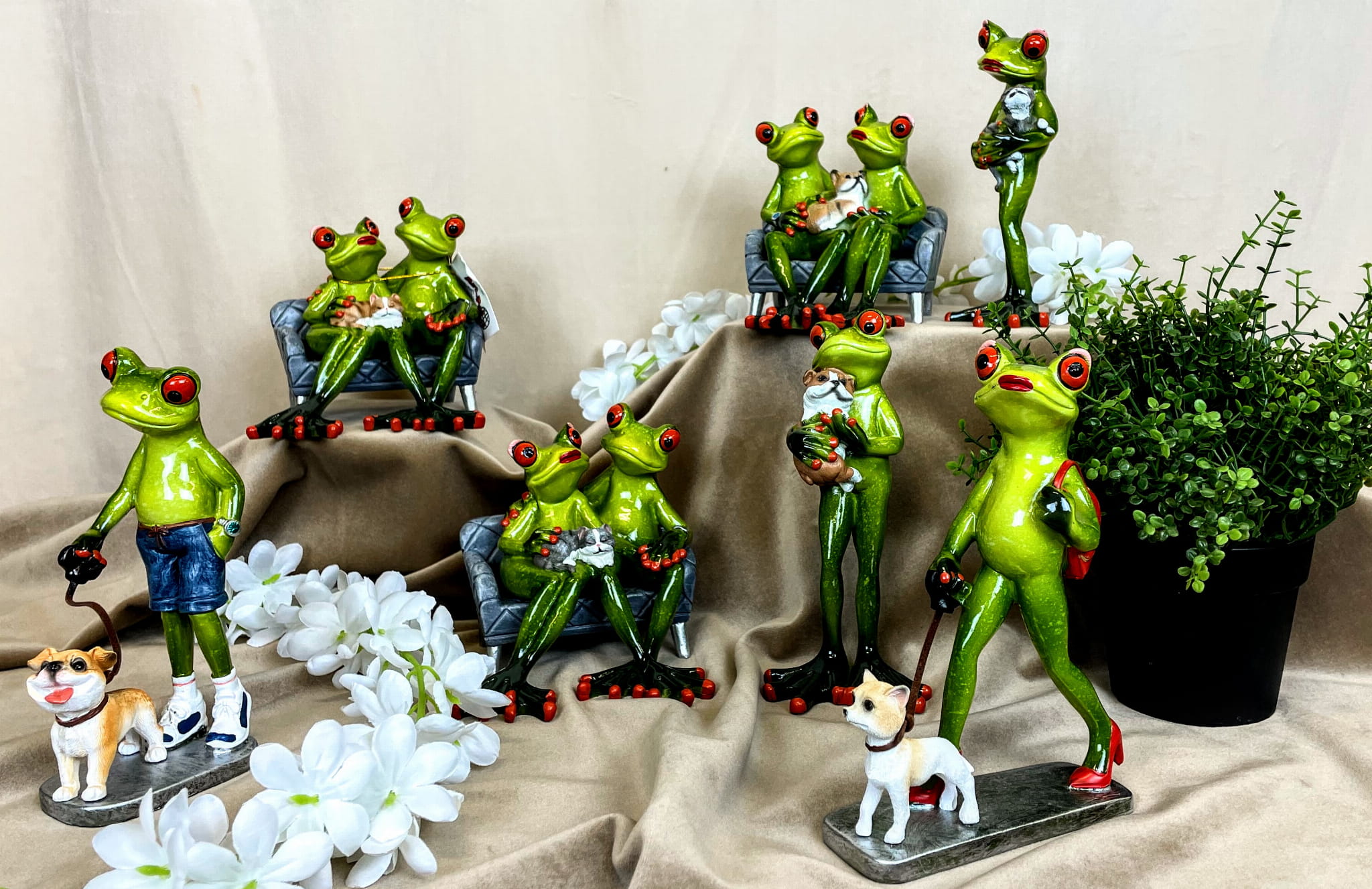 FIGURKA ŻABY PARA NA KANAPIE Z SZARYM KOTEM