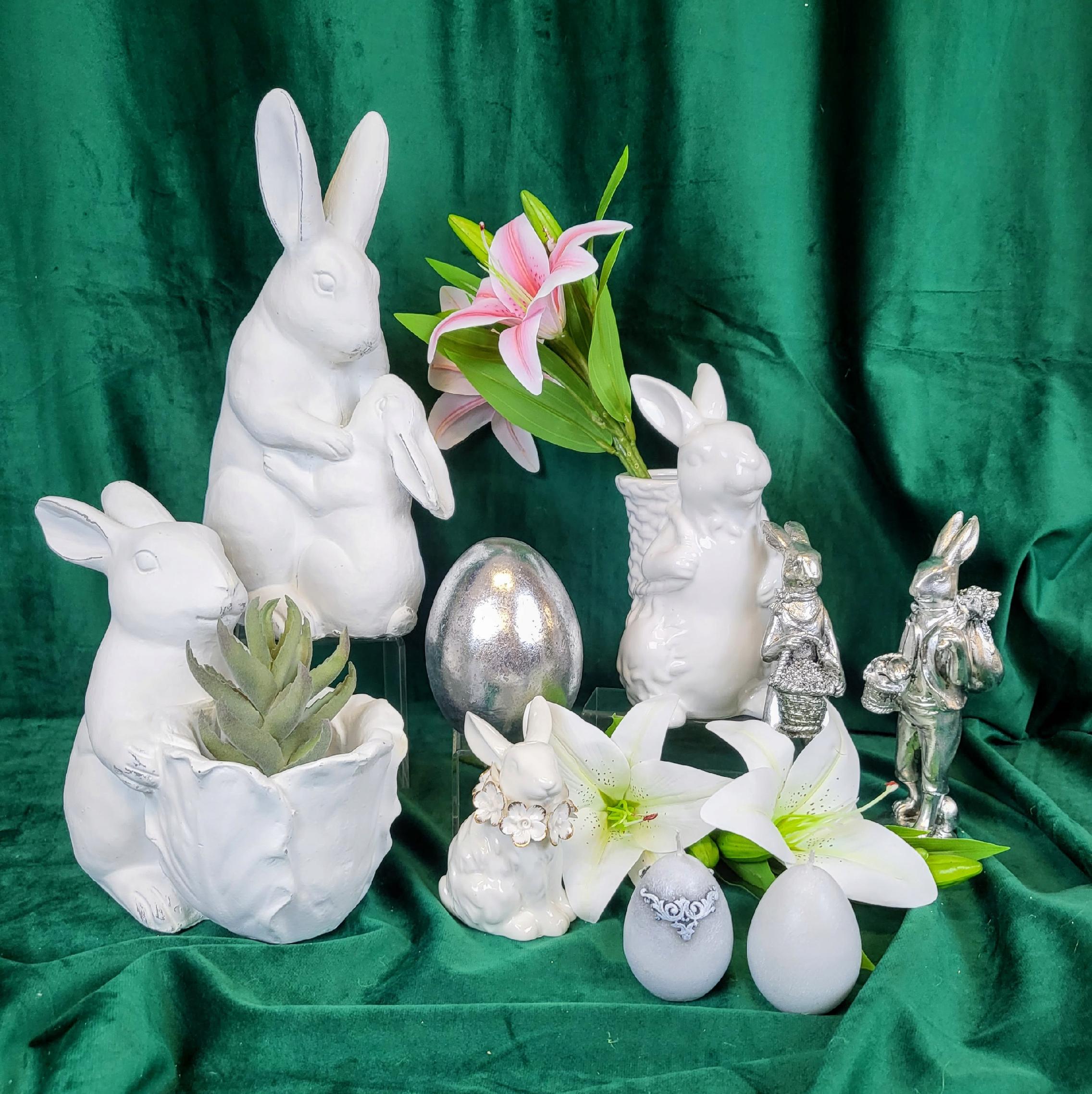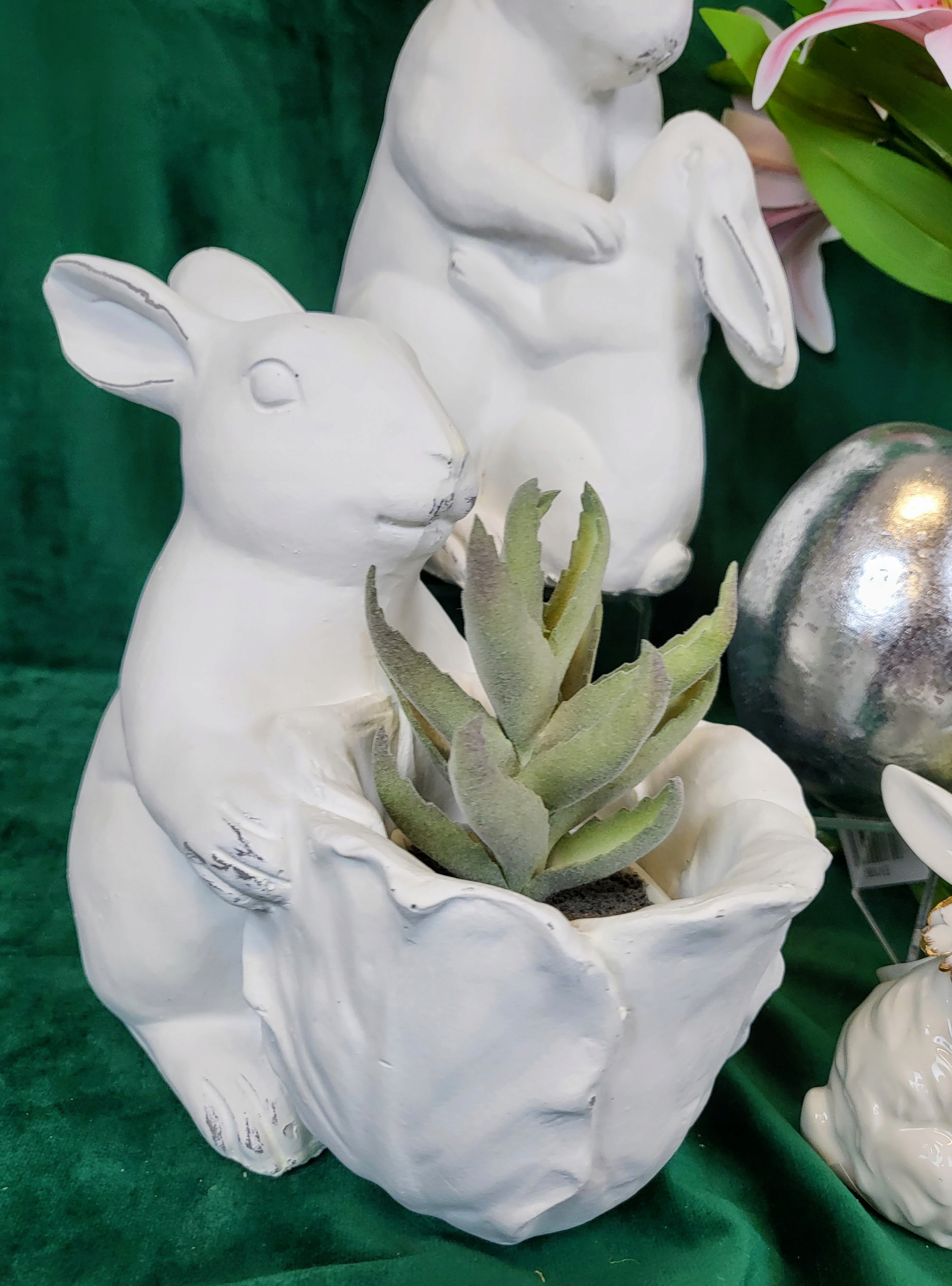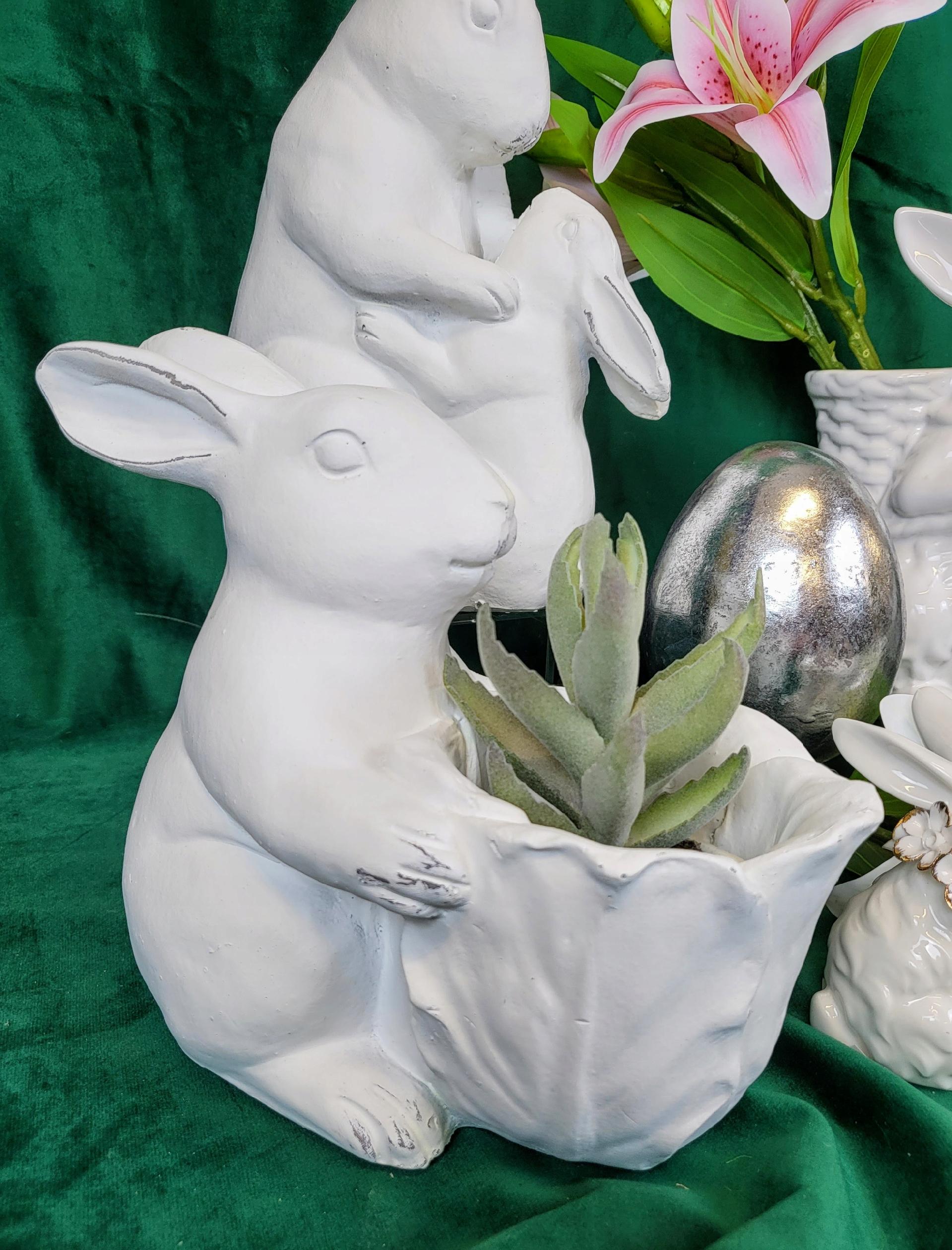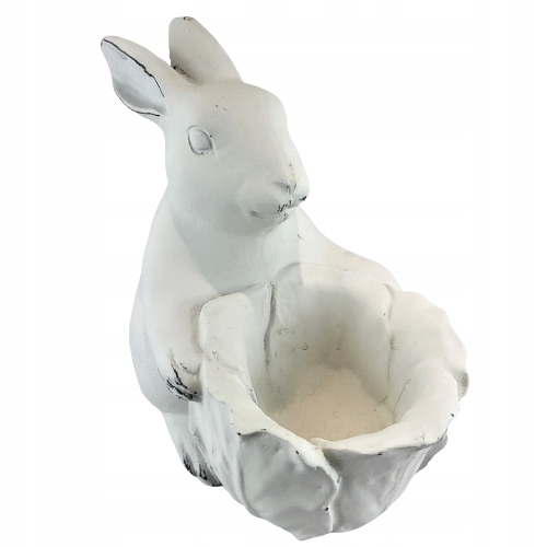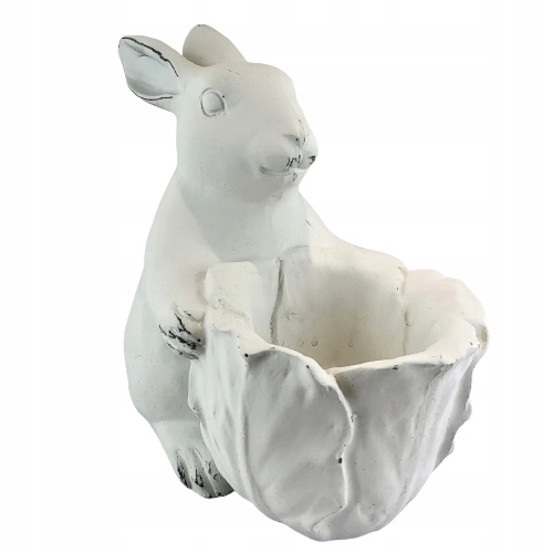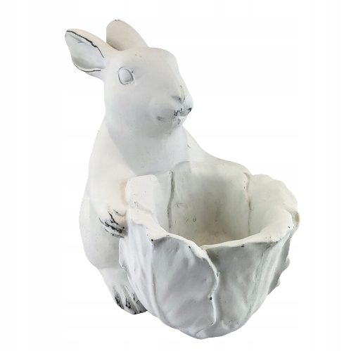 Zając z tworzywa sztucznego trzymający kwiat, który posłużyć może jako doniczka.