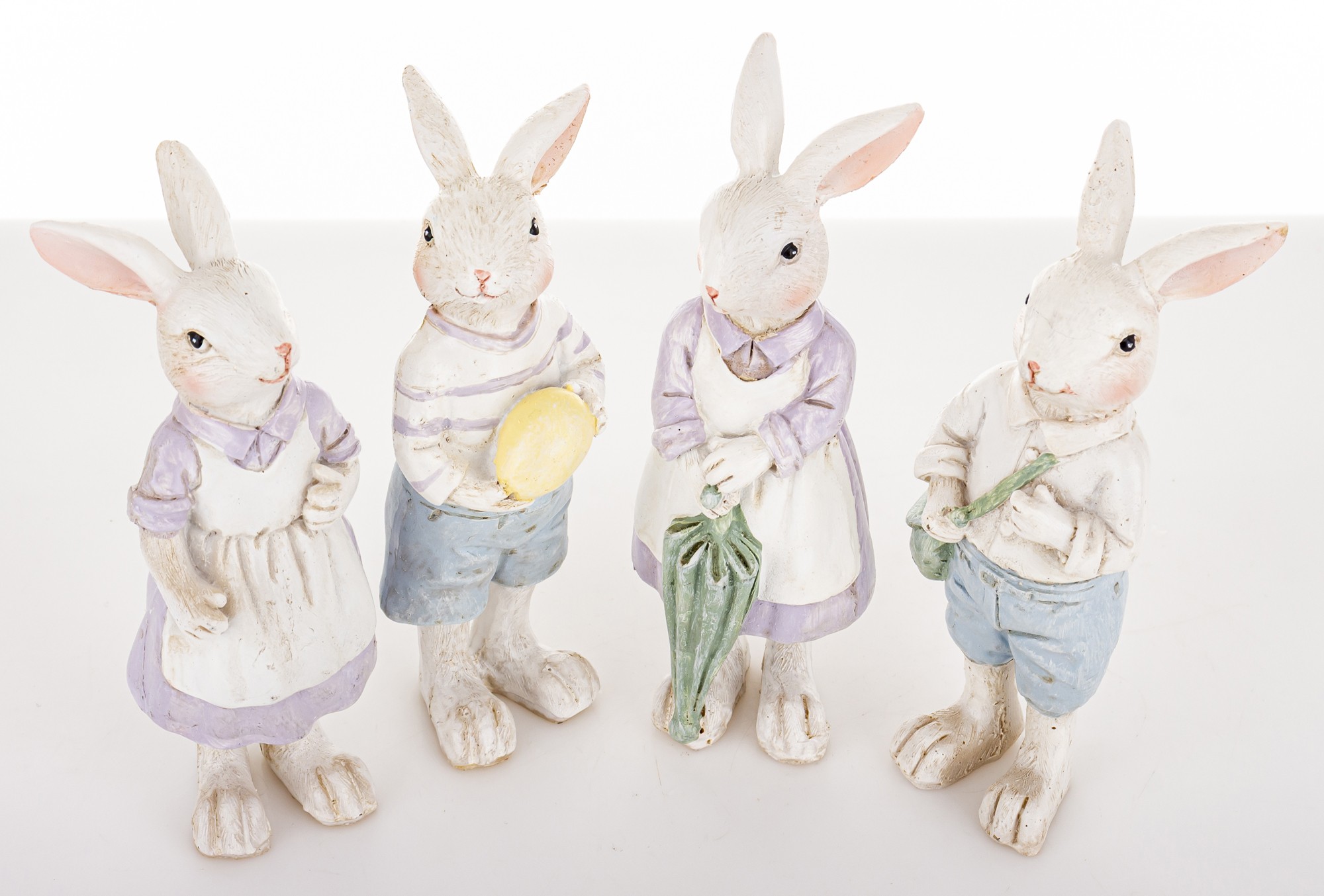 Szukasz oryginalnej dekoracji, która opowie Twoim gościom świąteczną historię? Ten sympatyczny zając-chłopiec, wyposażony w zieloną torbę na ramię, wygląda jakby właśnie wyruszał z ważną, wielkanocną przesyłką. Ubrany w jasną koszulę i błękitne spodenki, wprowadzi do Twojego wnętrza atmosferę beztroski i wiosennej przygody.