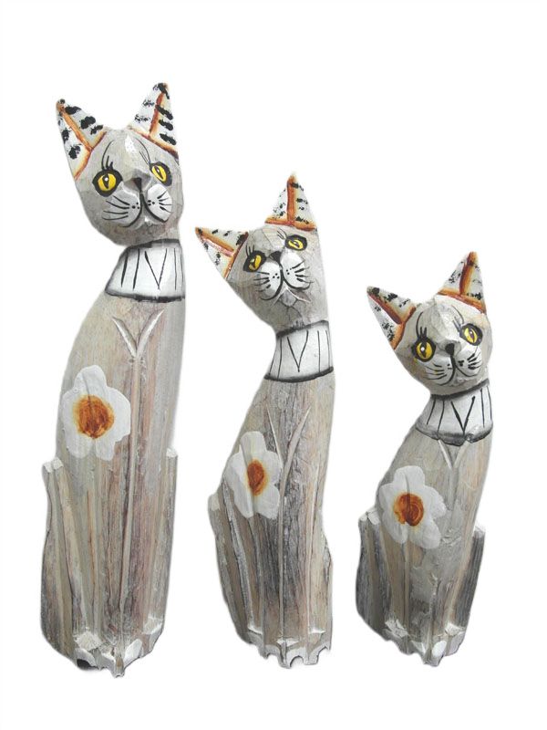 Zestaw trzech drewnianych kotów. Ręcznie zdobione figurki dodadzą uroku w każdym pomieszczeniu. Idealnie sprawdzą się również jako prezent.