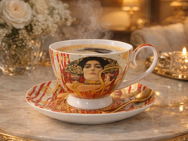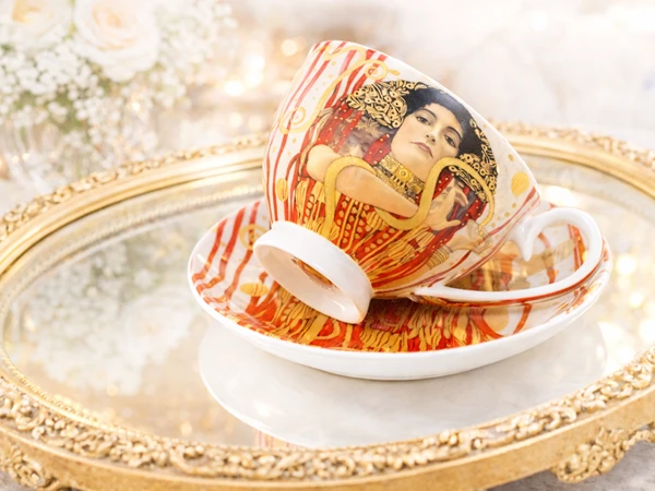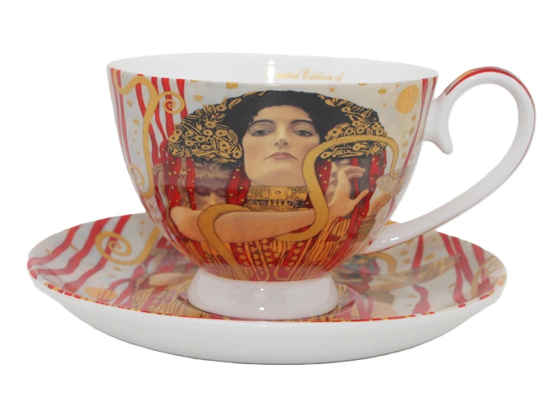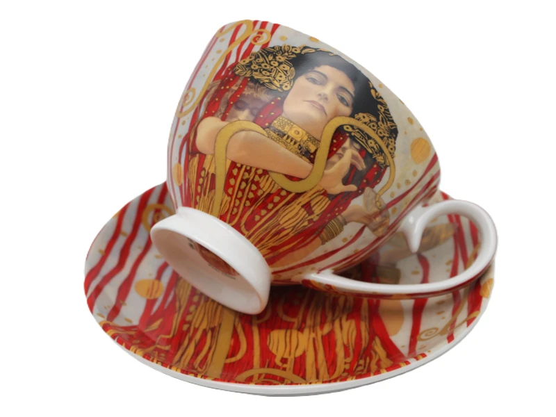 Stylowa filiżanka ze spodkiem z motywem obrazu Medycyna Gustava Klimta. Produkt doskonale sprawdzi się do serwowania kawy, herbaty lub innych gorących napojów, a także jako efektowny element dekoracyjny.