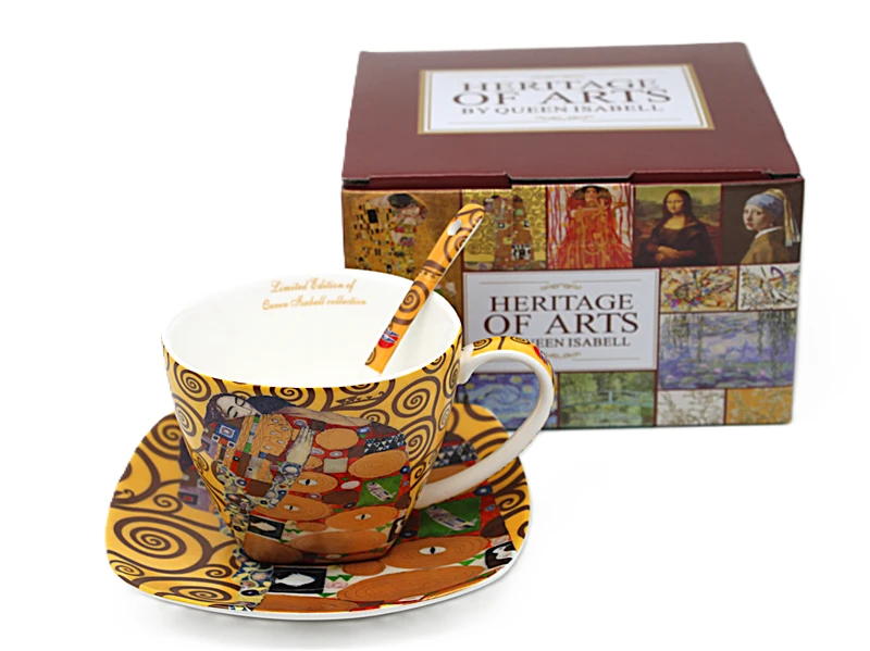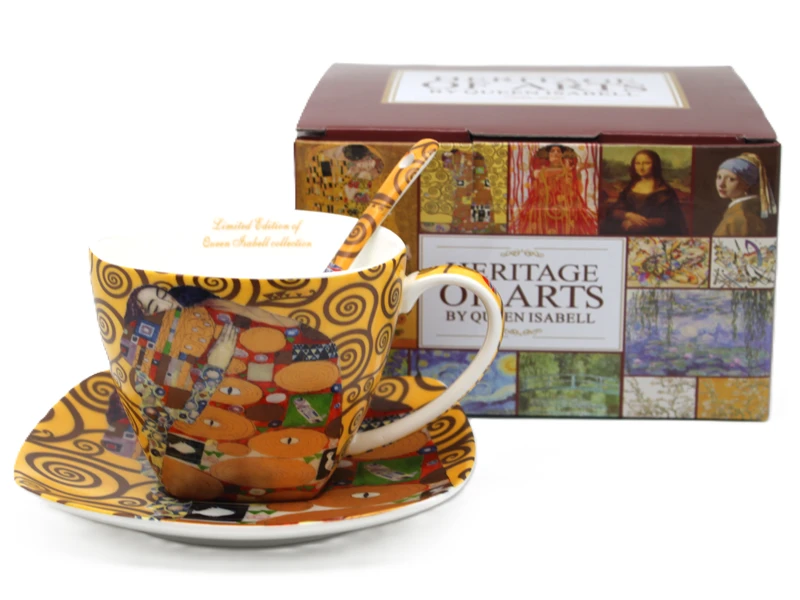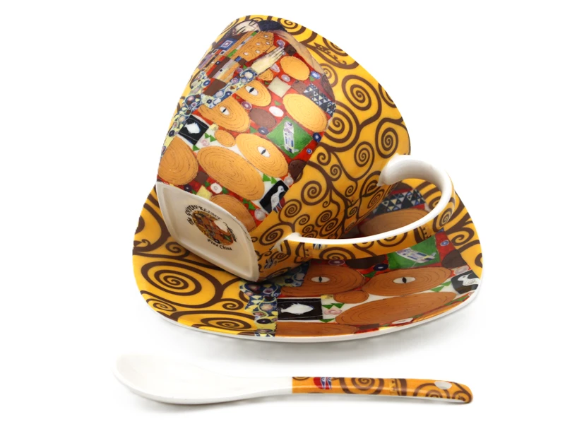 Stylowa filiżanka ze spodkiem z motywem twórczości Gustava Klimta. Produkt doskonale sprawdzi się do serwowania kawy, herbaty lub innych gorących napojów, a także jako efektowny element dekoracyjny.