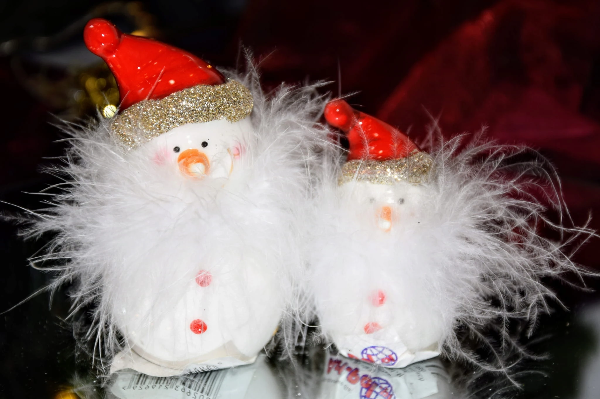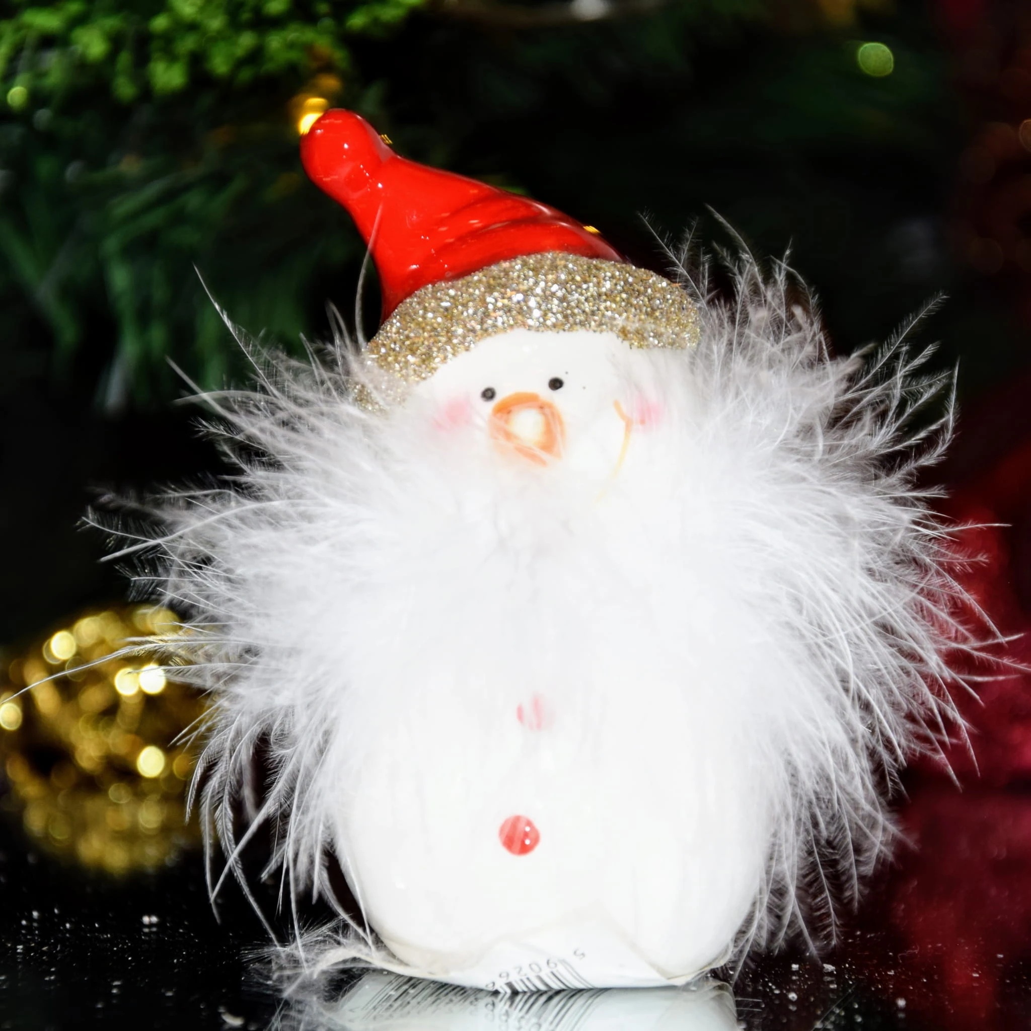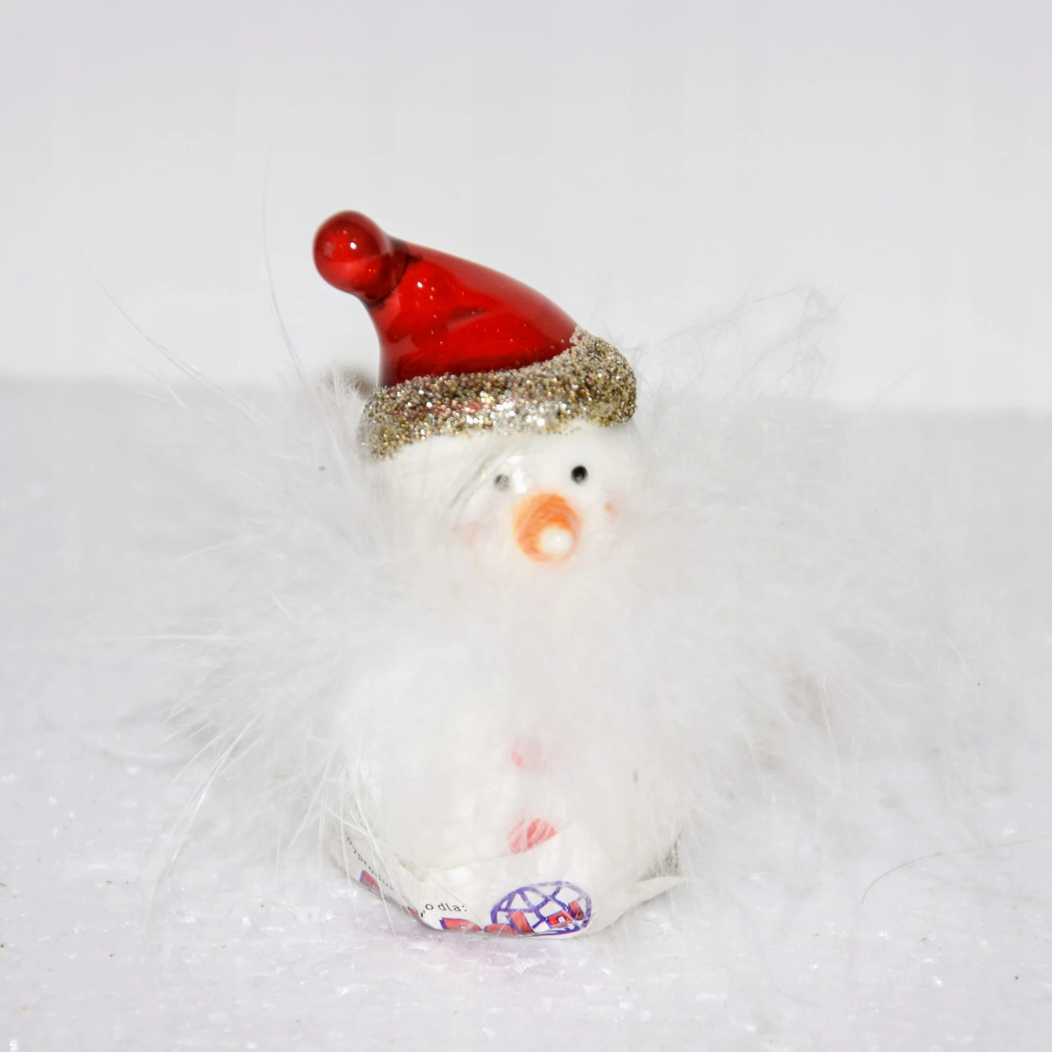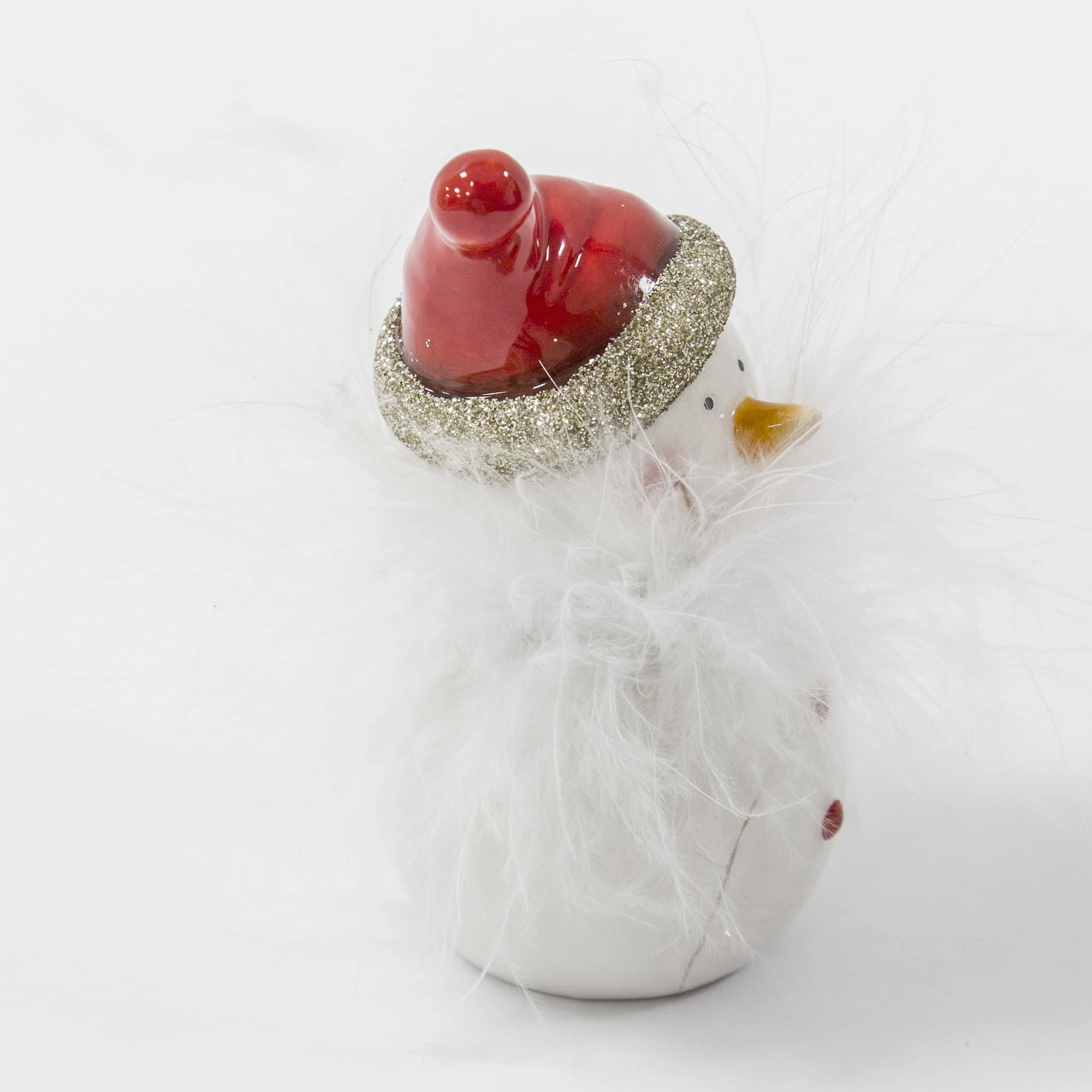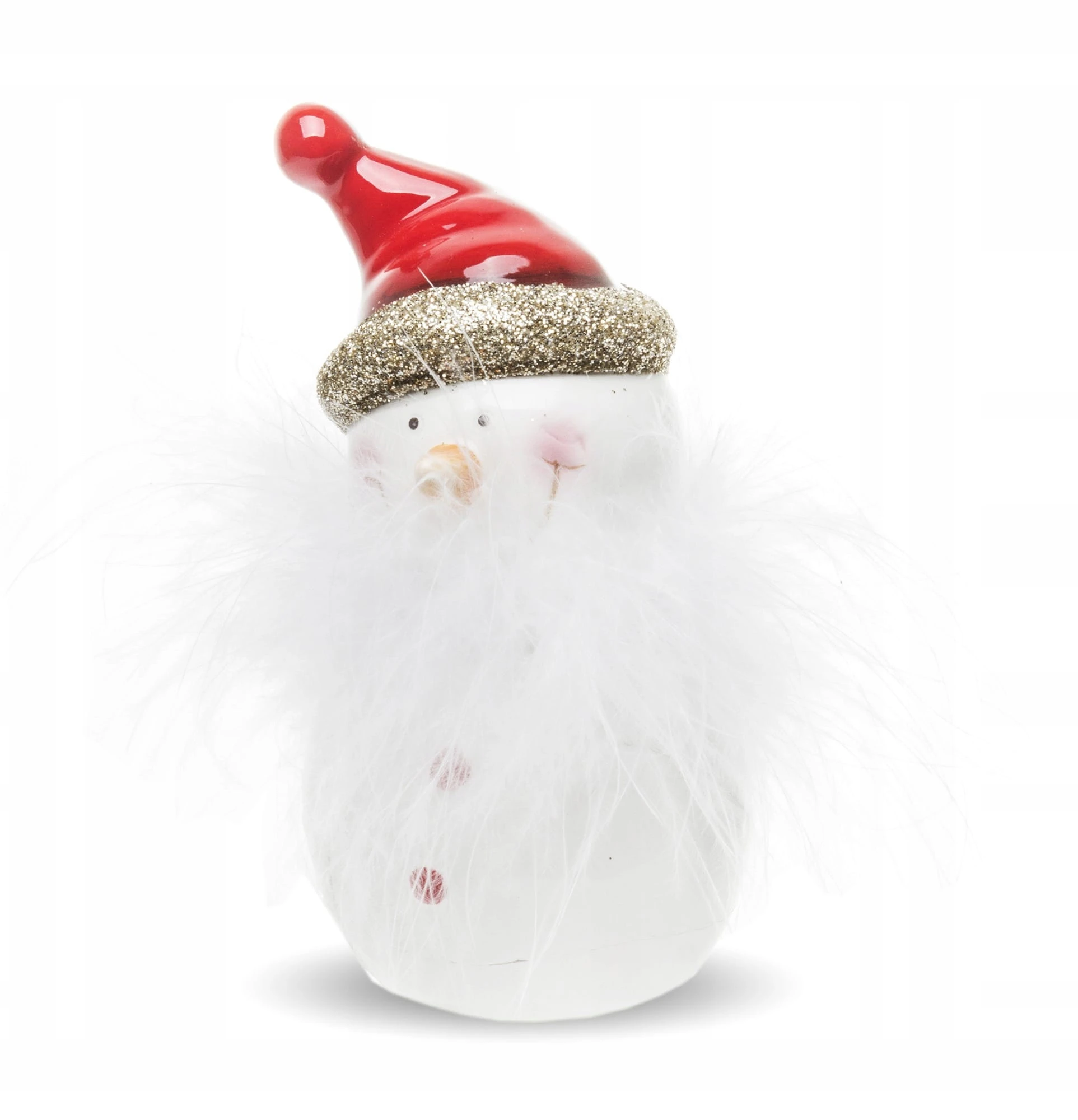 Sympatyczny ceramiczny bałwanek w czerwonej czapce z futrzaną brodą.