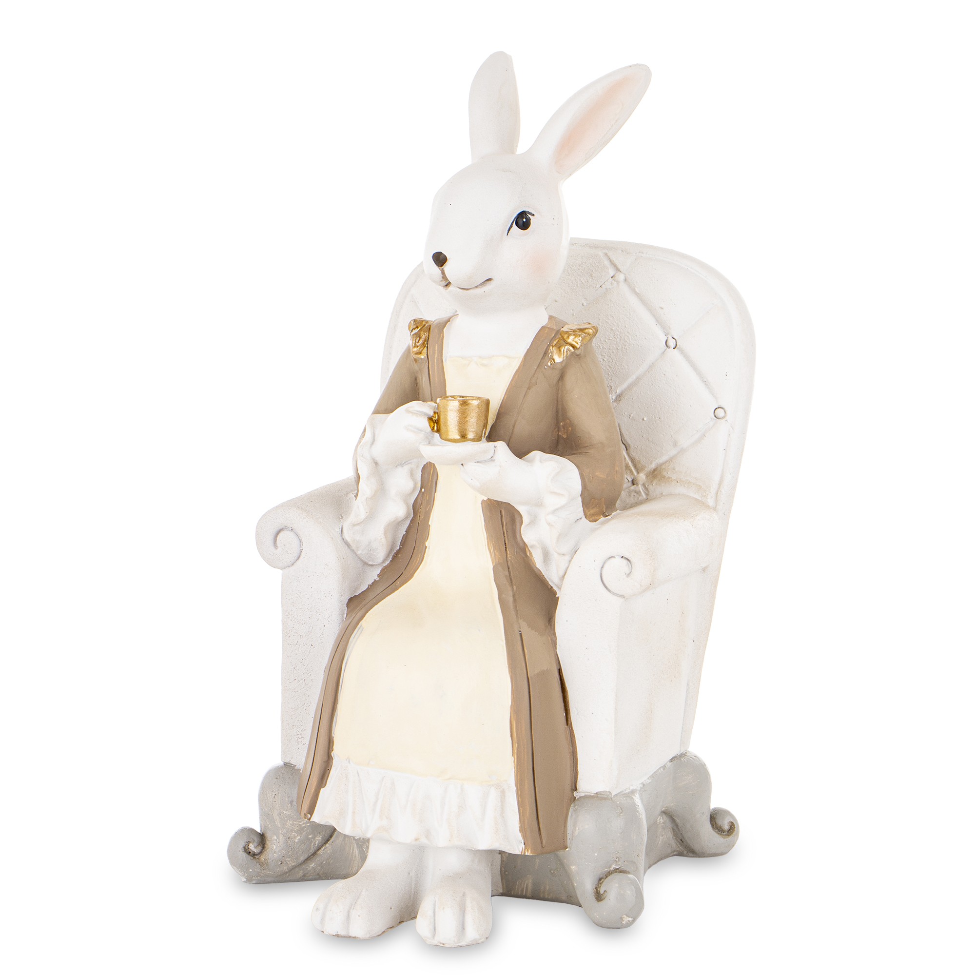 Poznaj najbardziej stylowego mieszkańca Twojej półki! Ta wyjątkowa figurka przedstawia białego zajączka, który z pełną elegancją wypoczywa w pikowanym fotelu, delektując się kawą w złotej filiżance. To dekoracja, która wnosi do wnętrza spokój, humor i niespotykany szyk. Idealna dla tych, którzy kochają dodatki z charakterem i cenią sobie małe, codzienne przyjemności.