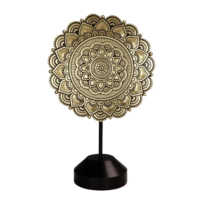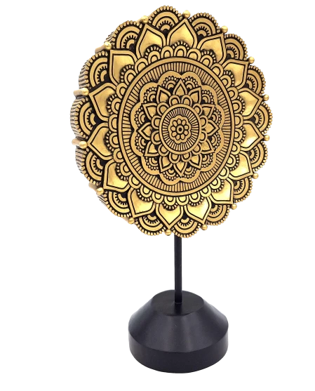 Elegancka figura przedstawiająca złotą mandalę na czarnej podstawie. To wyjątkowa dekoracja, która wprowadzi do Twojego wnętrza atmosferę spokoju i duchowości. Ta wyjątkowa figurka, łącząca tradycyjny symbol mandali z nowoczesnym designem, to prawdziwa perełka dla miłośników oryginalnych dekoracji