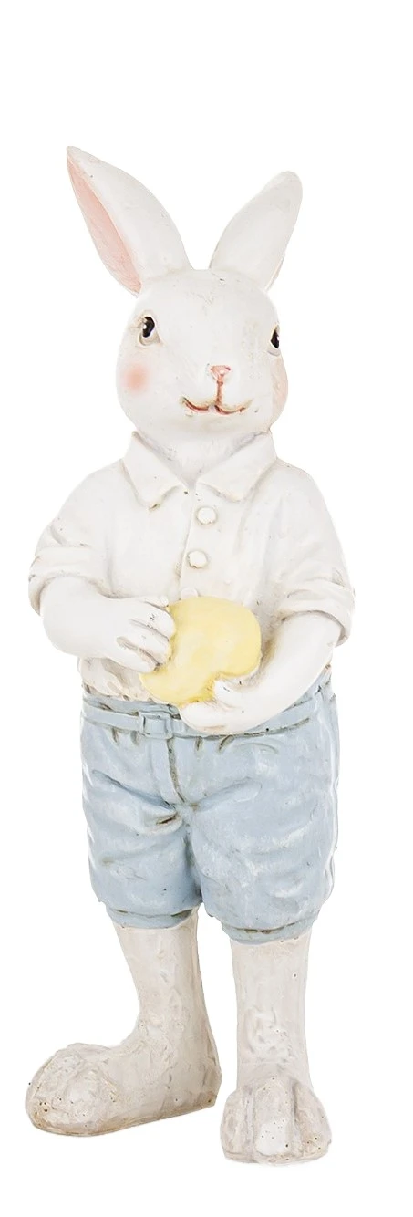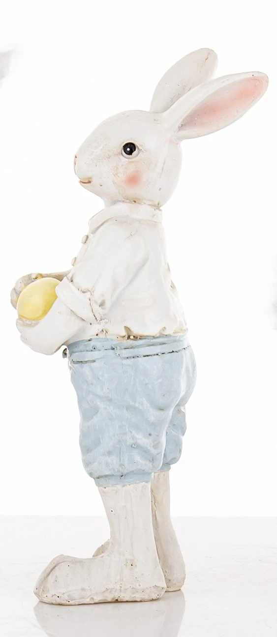 Szukasz dekoracji, która wprowadzi do Twojego domu powiew świeżości i radosną, wielkanocną atmosferę? Nasza figurka uroczego królika w błękitnych spodenkach, trzymającego złociste jajko, to idealny wybór. Wykonana z dbałością o detale, prezentuje się niezwykle estetycznie, łącząc klasyczny motyw świąteczny z nowoczesnym, pastelowym wykończeniem.