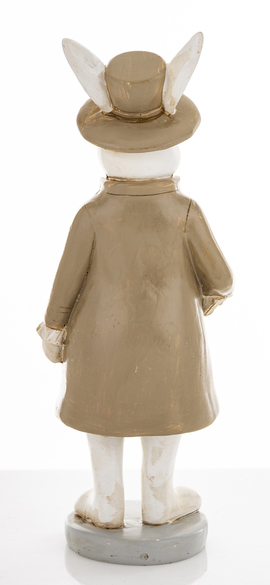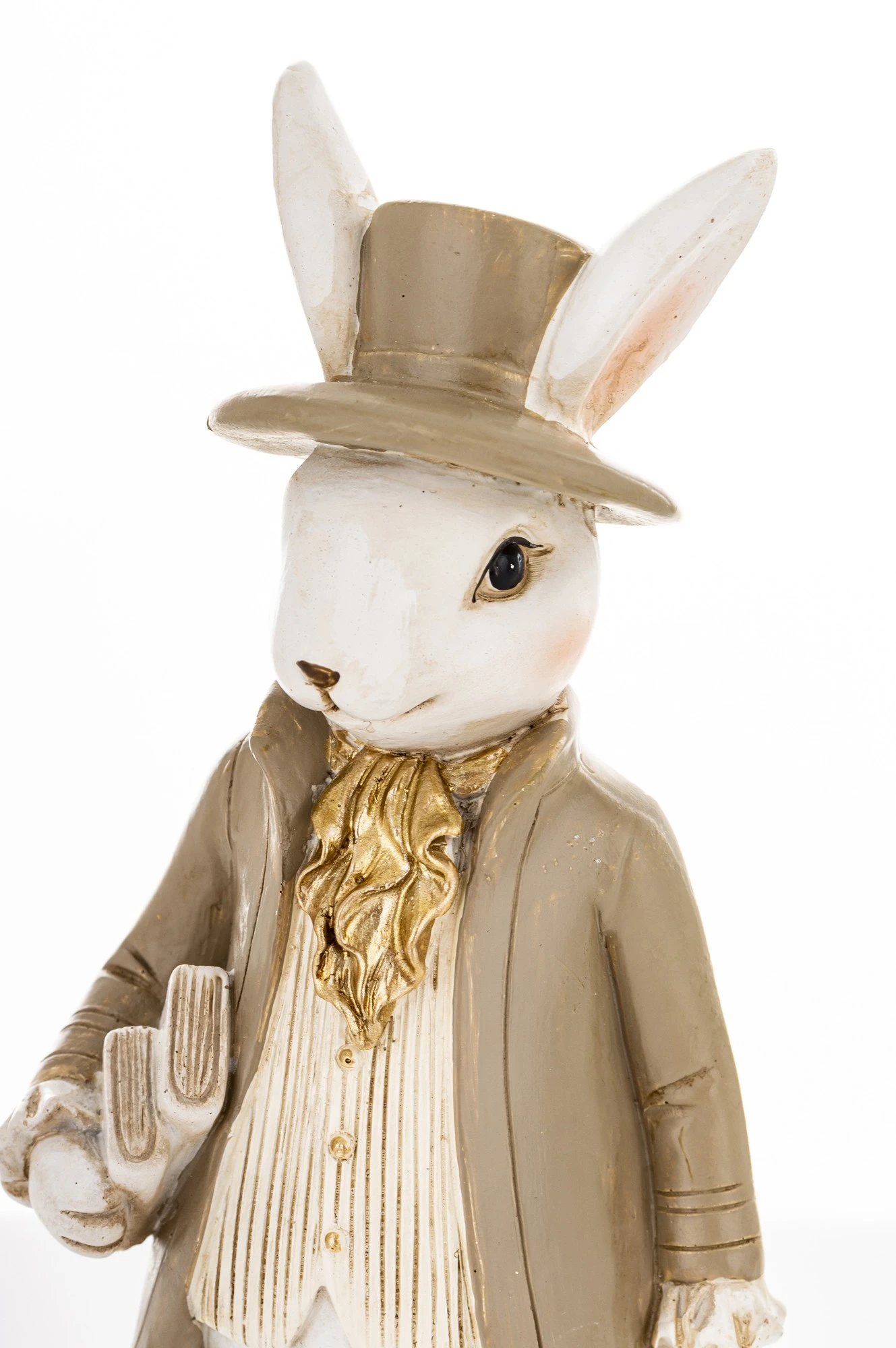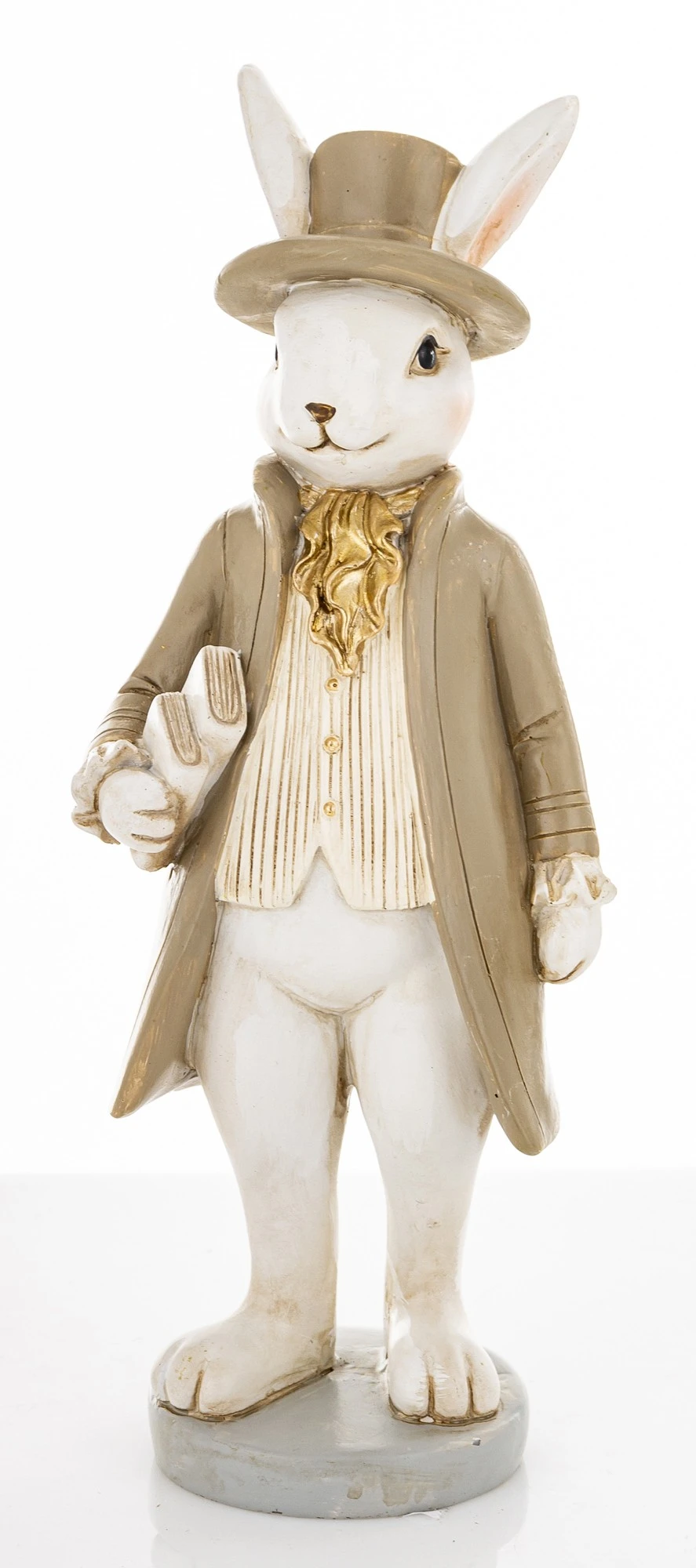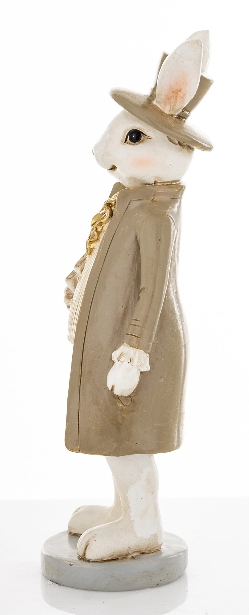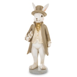 Nasza figurka przedstawia zająca-intelektualistę w pełnym rynsztunku dżentelmena. Ubrany w długi, brązowy surdut, prążkowaną kamizelkę oraz efektowny, złoty żabot, dumnie trzyma pod pachą książki. Całość wieńczy stylowy cylinder, który nadaje postaci wyjątkowego charakteru.