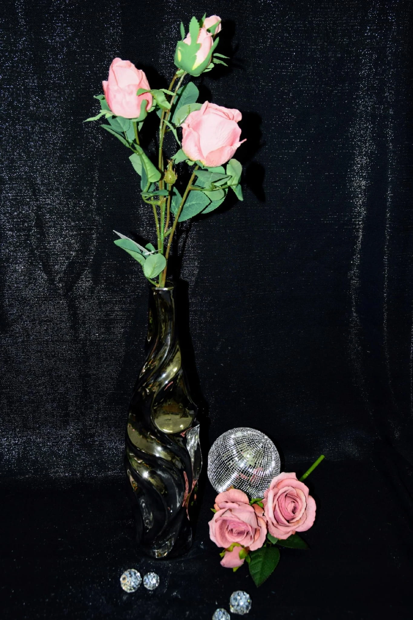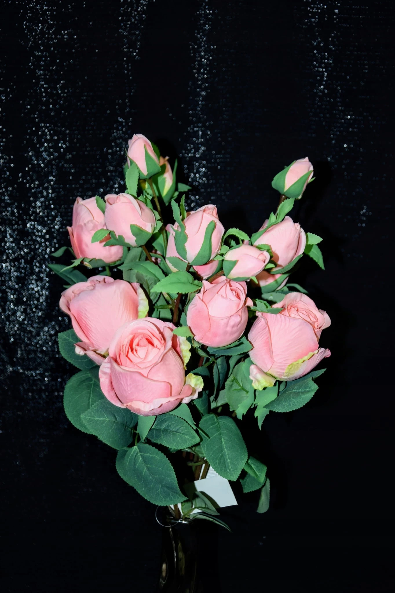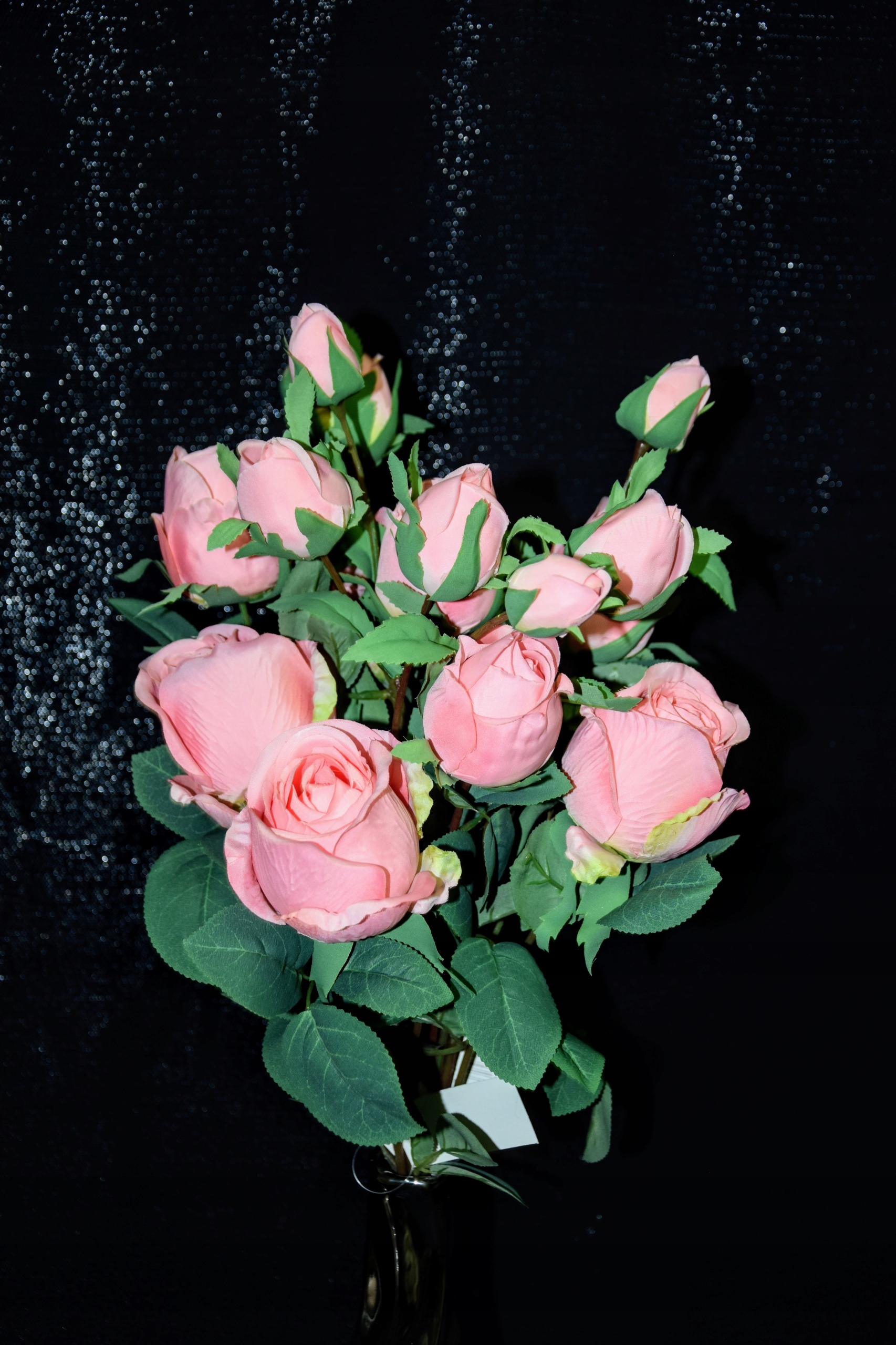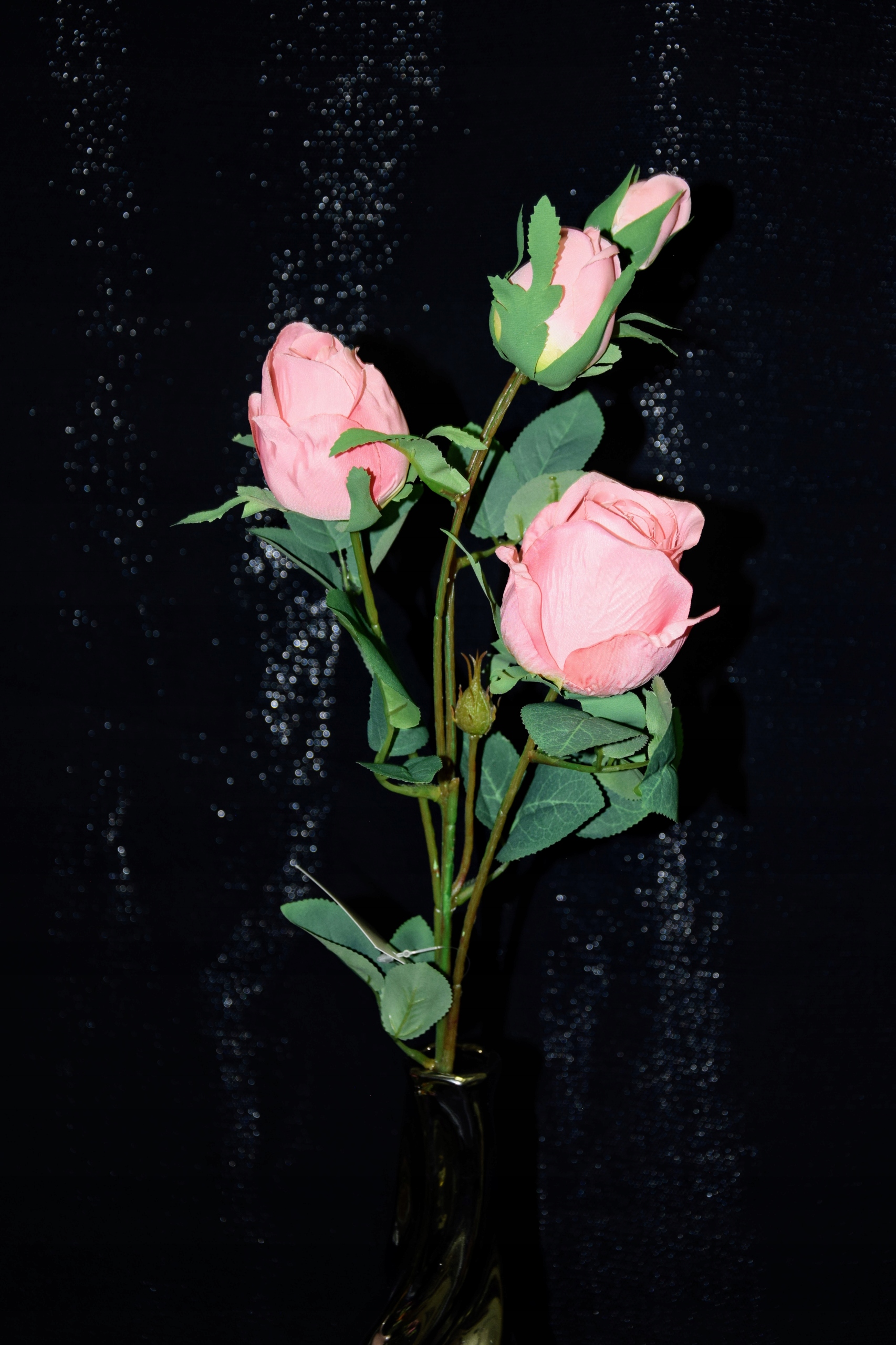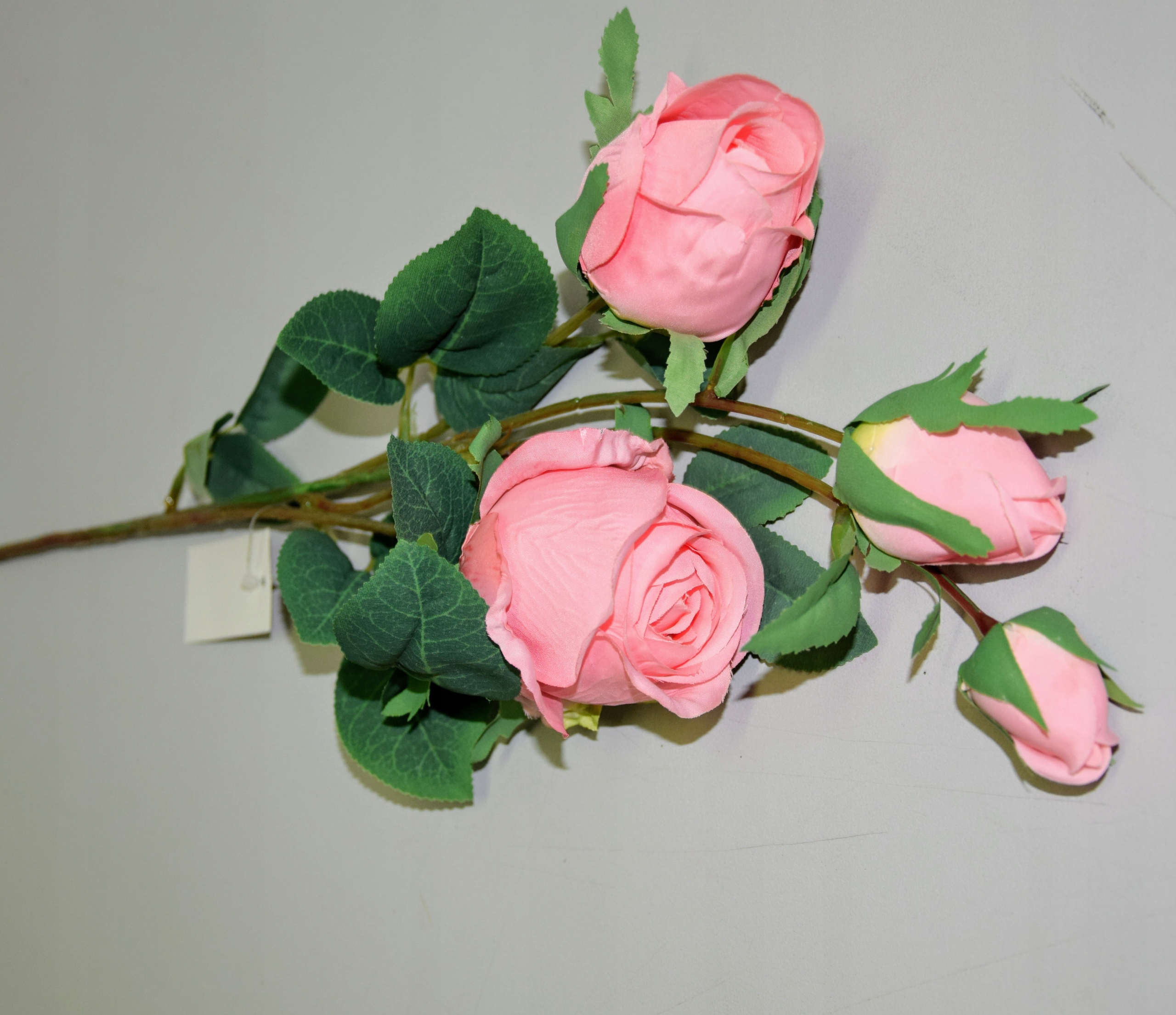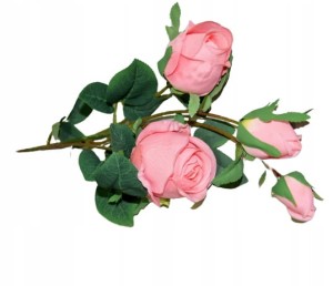 Piękna gałązka różana składająca się z 4 różowych kwiatów, która zachwyca swoim wyglądem i upiększa pomieszczenie w którym się znajduje.