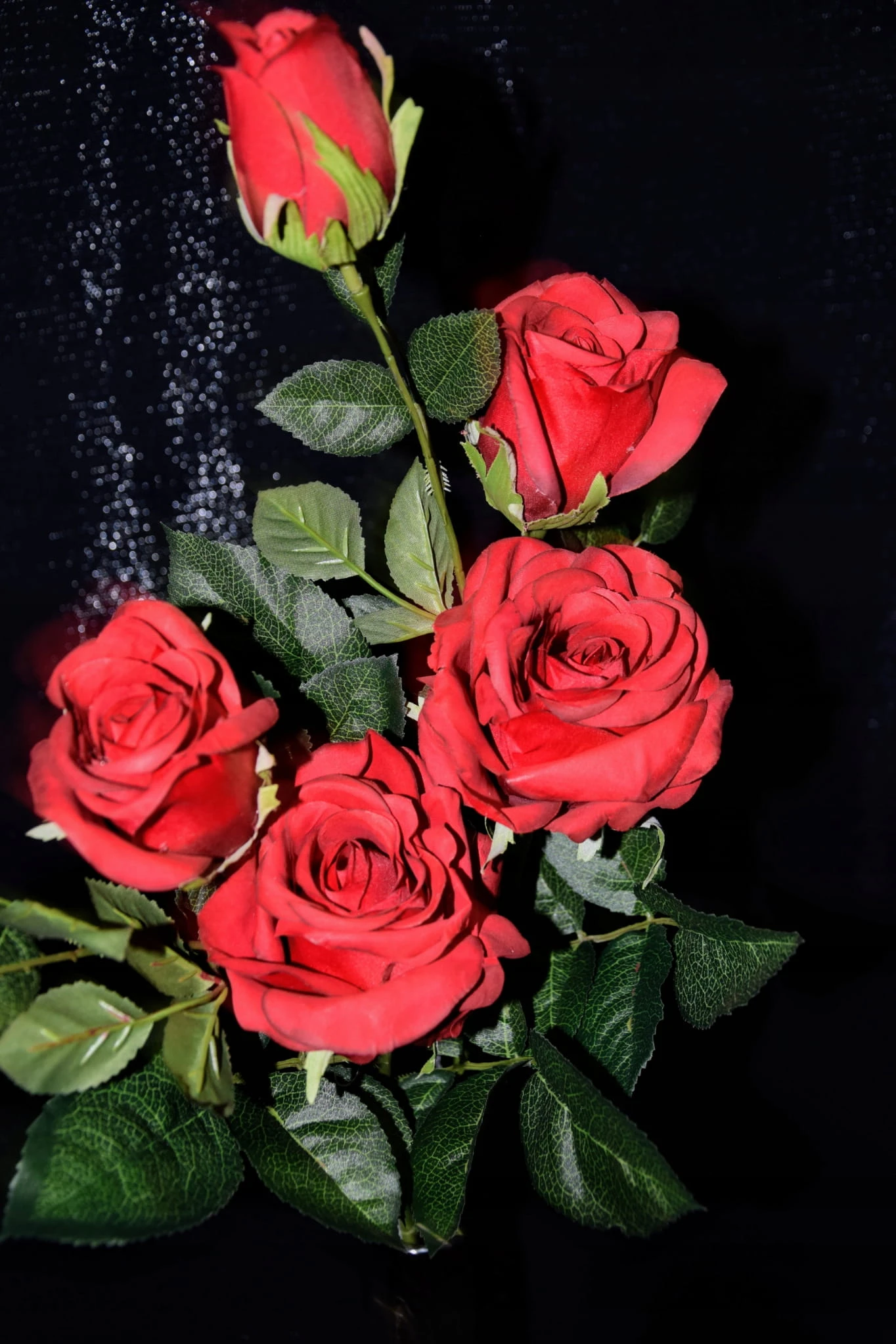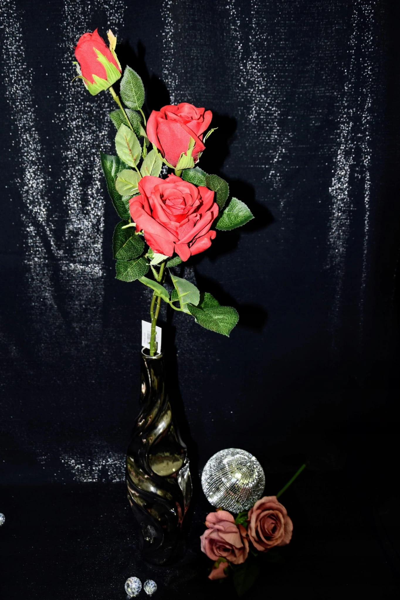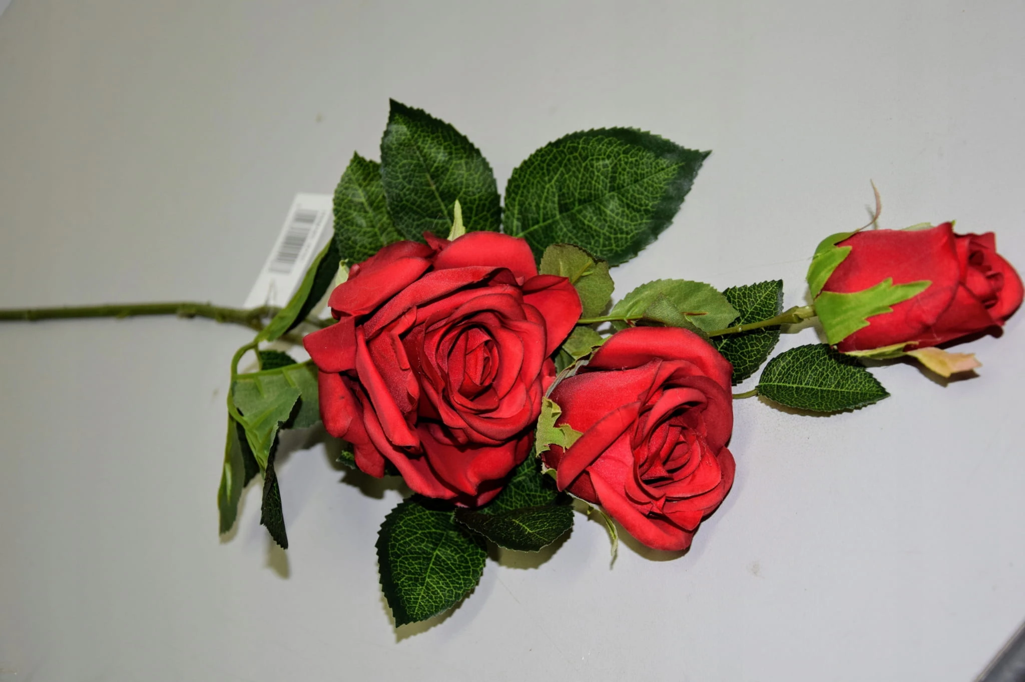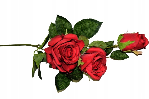 Piękna gałązka różana składająca się z trzech czerwonych kwiatów, która zachwyca swoim wyglądem i upiększa pomieszczenie w którym się znajduje.