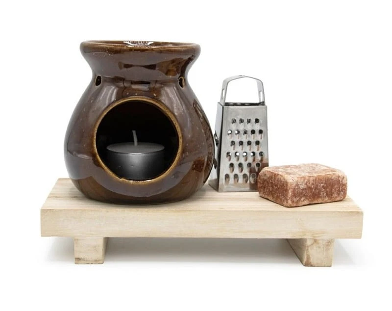 Uroczy zestaw składający się z kominka na wosk lub olejek zapachowy ze świeczką typu tealight, wosku, tarki oraz podstawki z serii Vesuvius - with love. Ceramiczny kominek jest koloru brązowego nakrapianego, błyszczącego imitującego marmur. Naczynie umożliwia rozpylenie zapachu wosku lub olejku zapachowego. Do użycia potrzebna jest świeczka typu tealight (świeczka zawarta w zestawie), którą umieszcza się w środku kominka.