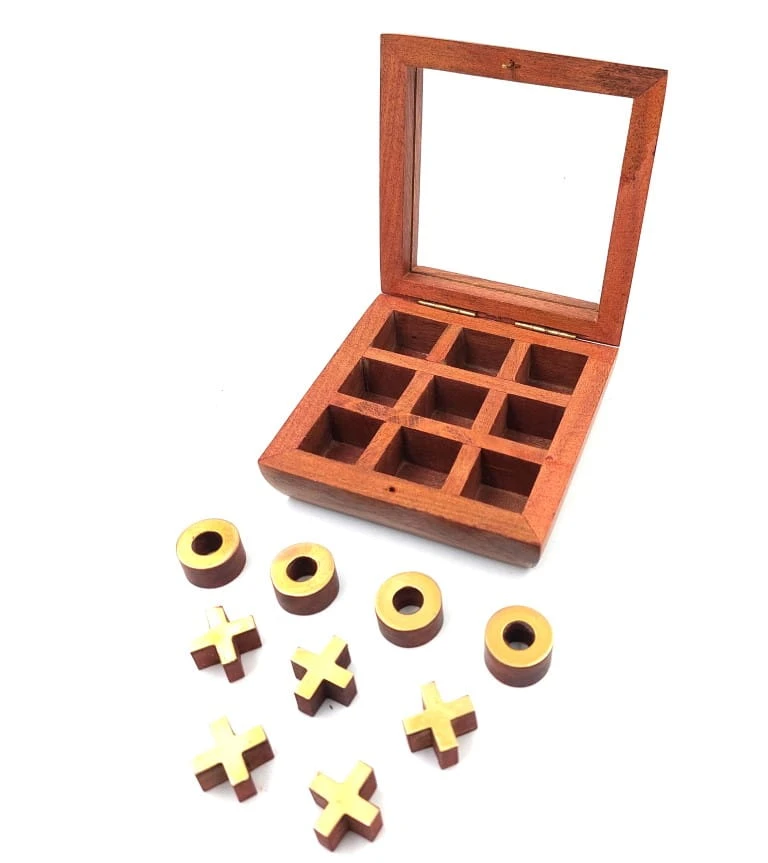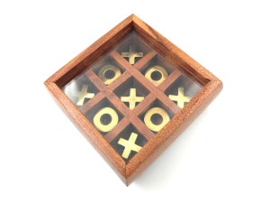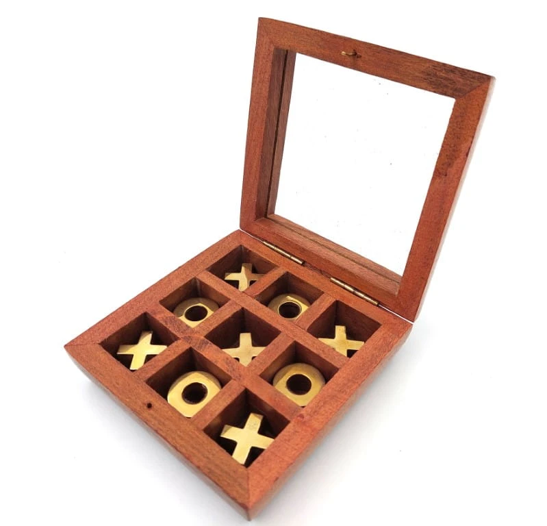 Klocki wykonane z drewna z mosiężnymi zdobieniami. Drewniane pudełko z przegródkami na kółka i krzyżyki jest jednocześnie planszą gry. Top pudełka jest szklany.