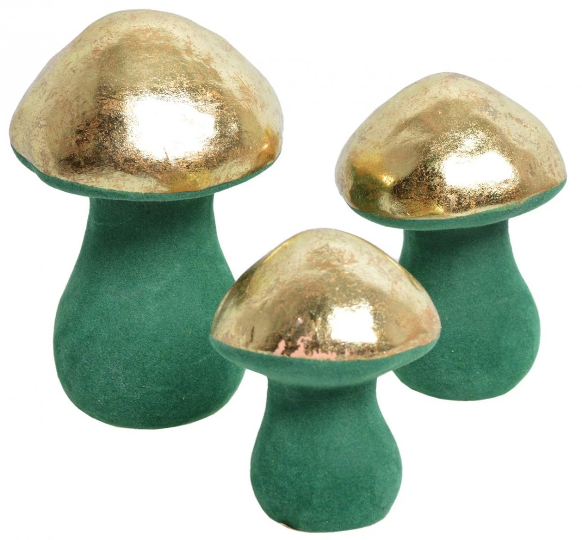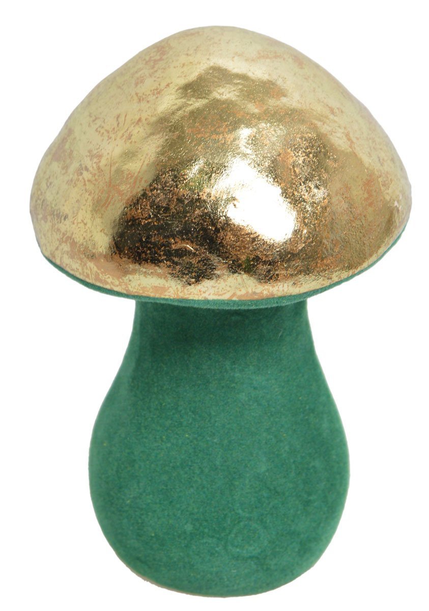 Figurka zielony welurowy grzybek dekoracyjny ze złotym kapeluszem.
