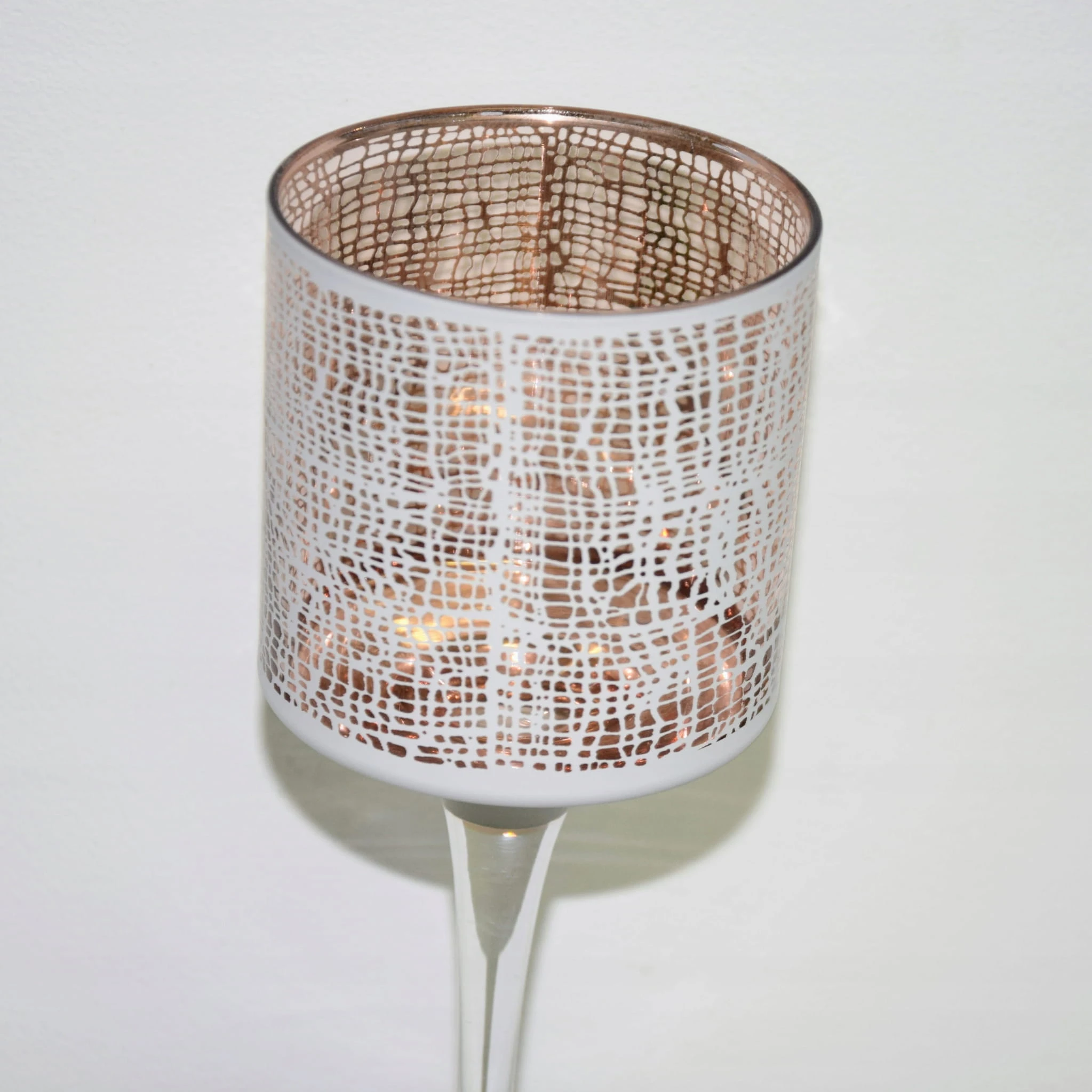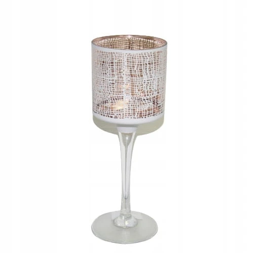 Biały, szklany kielich z różowo-złotym wnętrzem. Wzór snake, pięknie przepuszcza światło świeczki znajdującej się w środku. Polecany do małych świeczek typu tealight. Idealnie wkomponuje się w nowoczesne, skandynawskie jak i loftowe wnętrze.