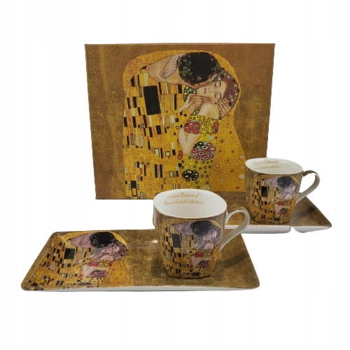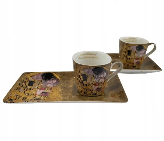 Elegancki zestaw 2 filiżanek z łyżeczkami i talerzykami z motywem obrazu "Pocałunek". Idealny pomysł na upominek dla miłośników twórczości Gustava Klimta lub sztuki secesji.