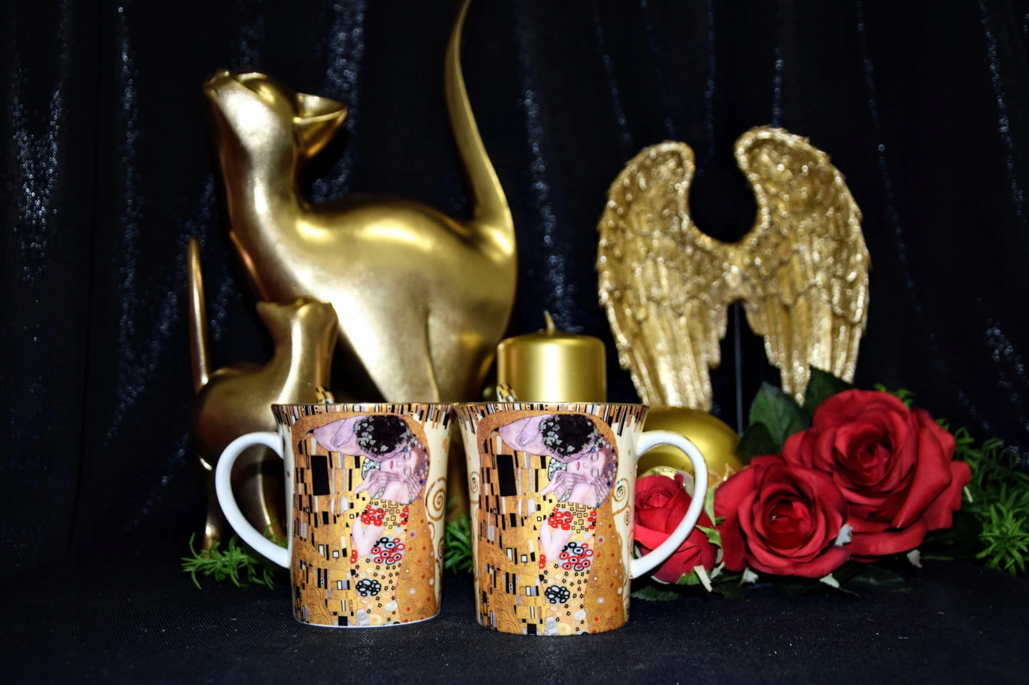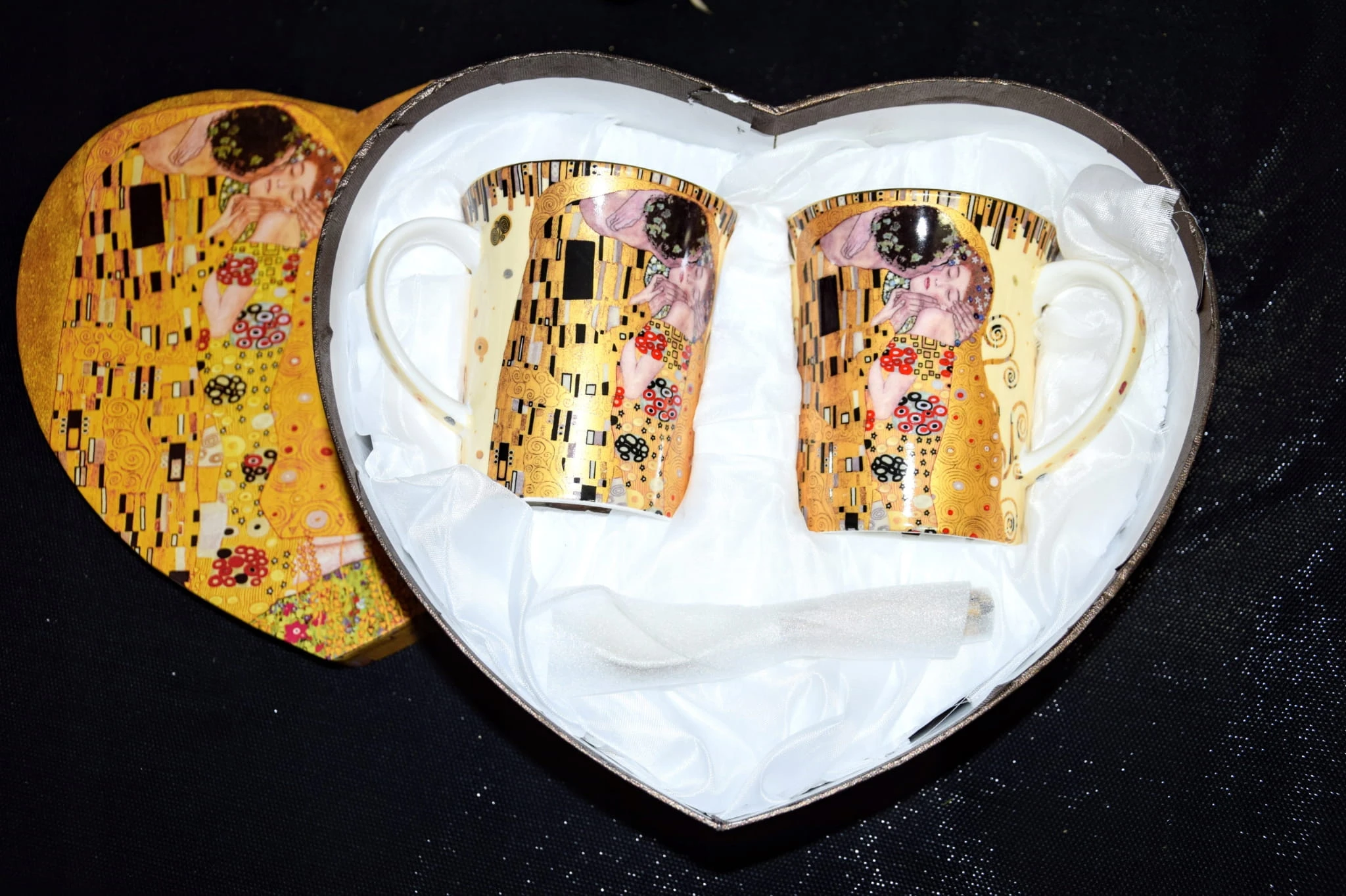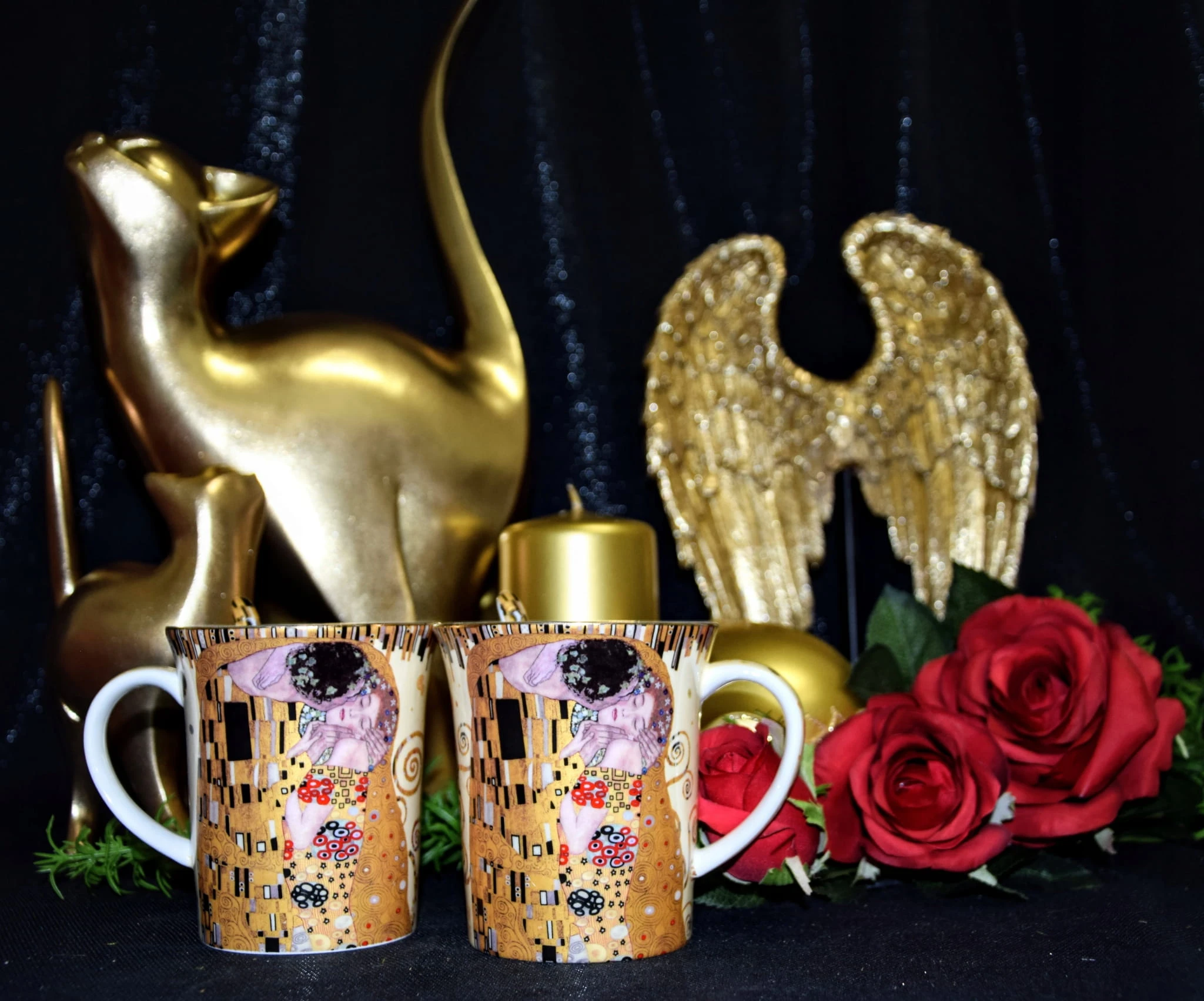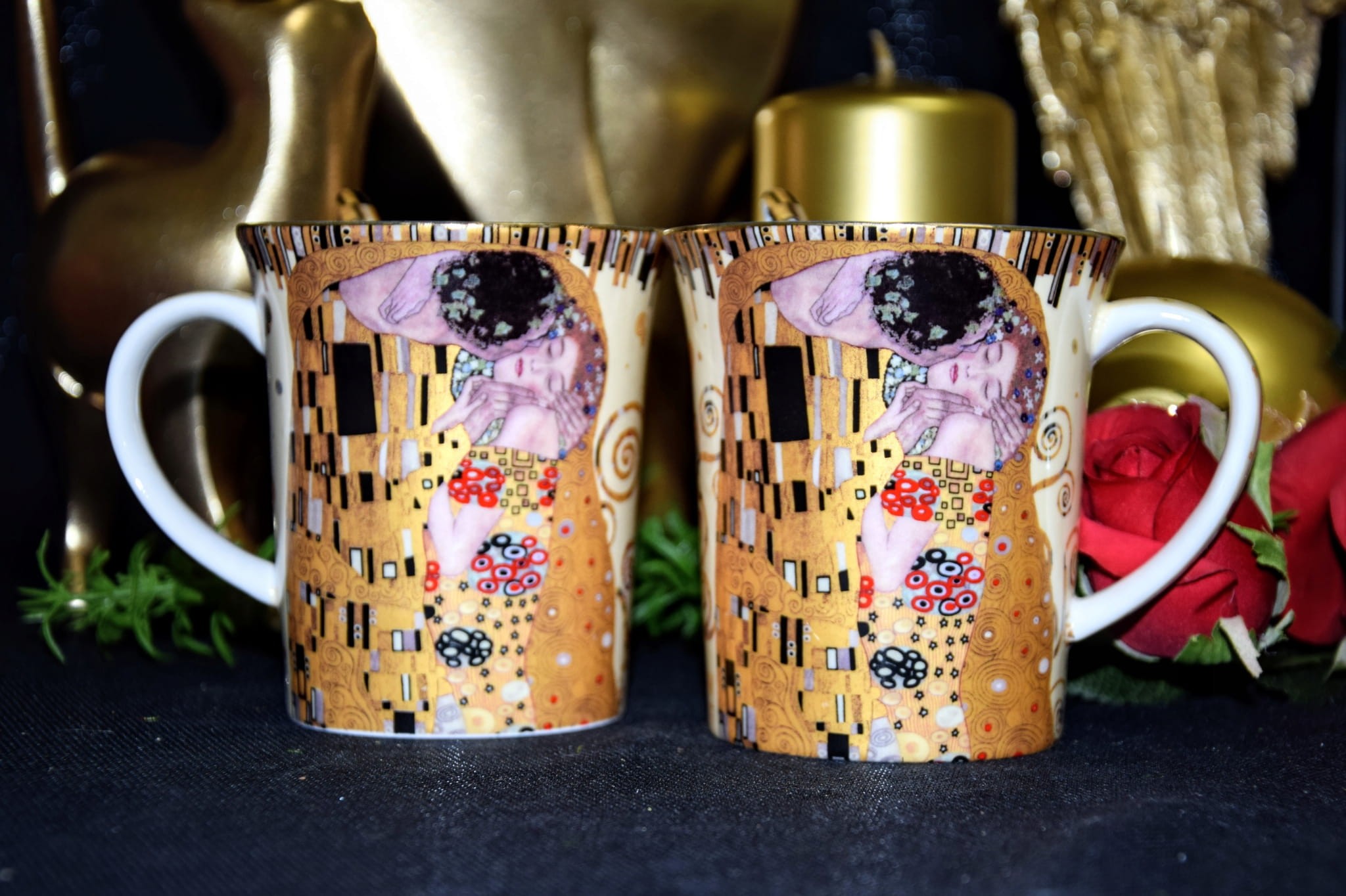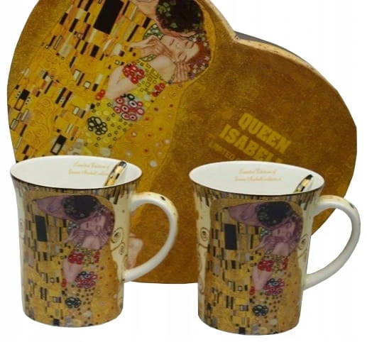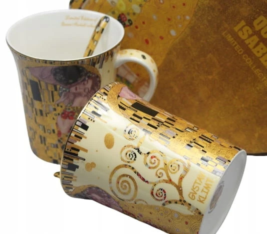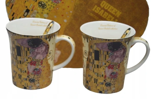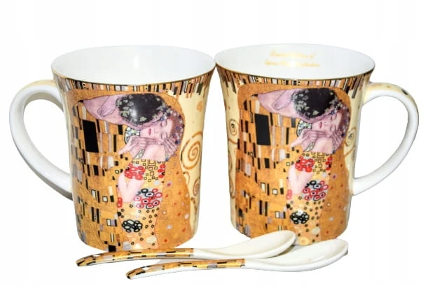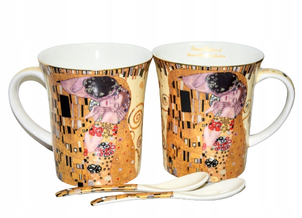 Elegancki zestaw 2 kubków z łyżeczkami z motywem obrazu "Pocałunek". Idealny pomysł na upominek dla miłośników twórczości Gustava Klimta lub sztuki secesji.
