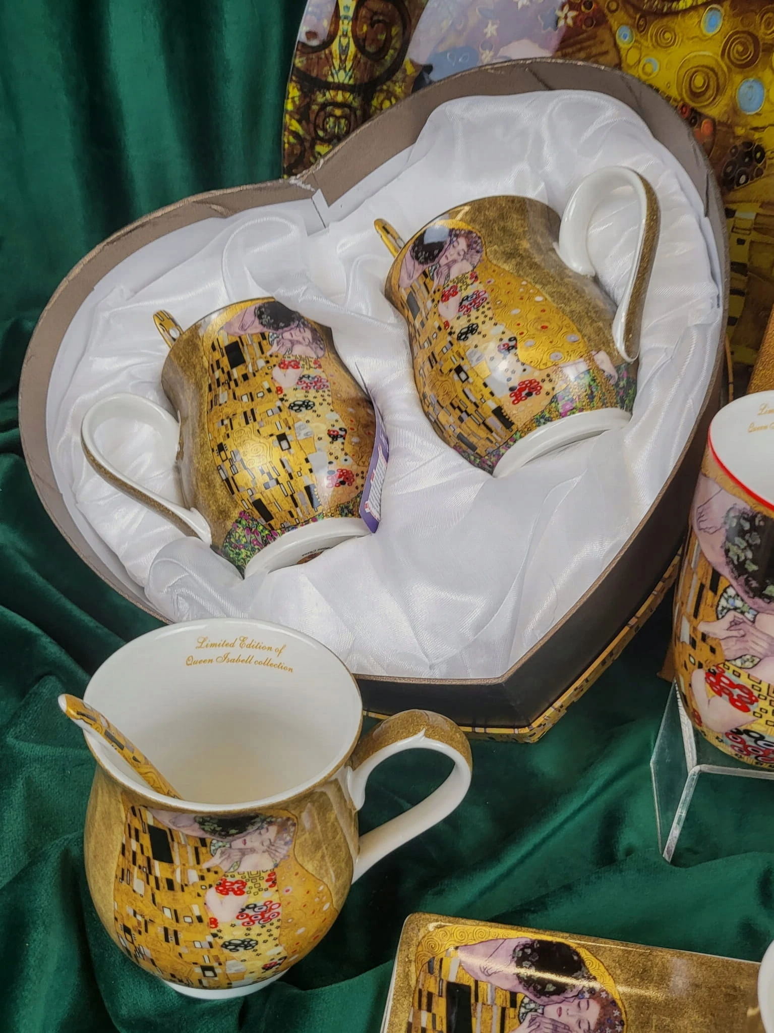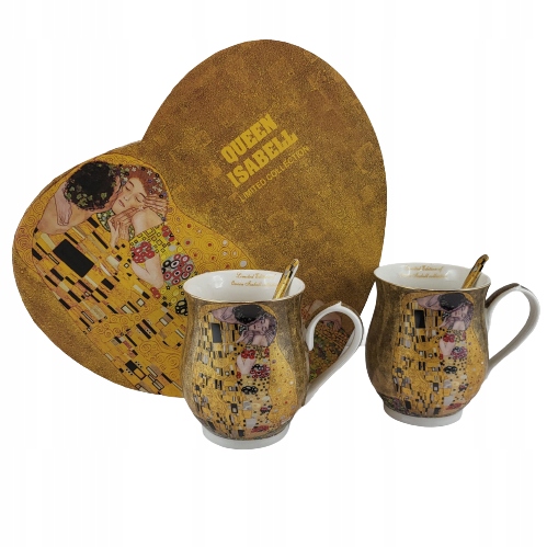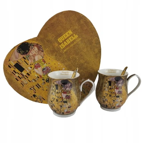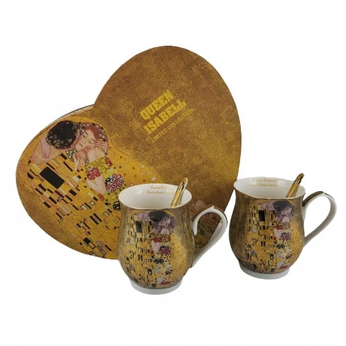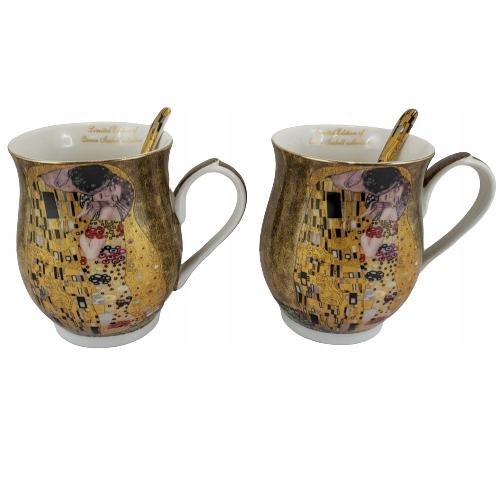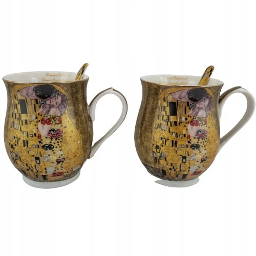 Elegancki zestaw 2 kubków z łyżeczkami z motywem obrazu "Pocałunek". Idealny pomysł na upominek dla miłośników twórczości Gustava Klimta lub sztuki secesji.