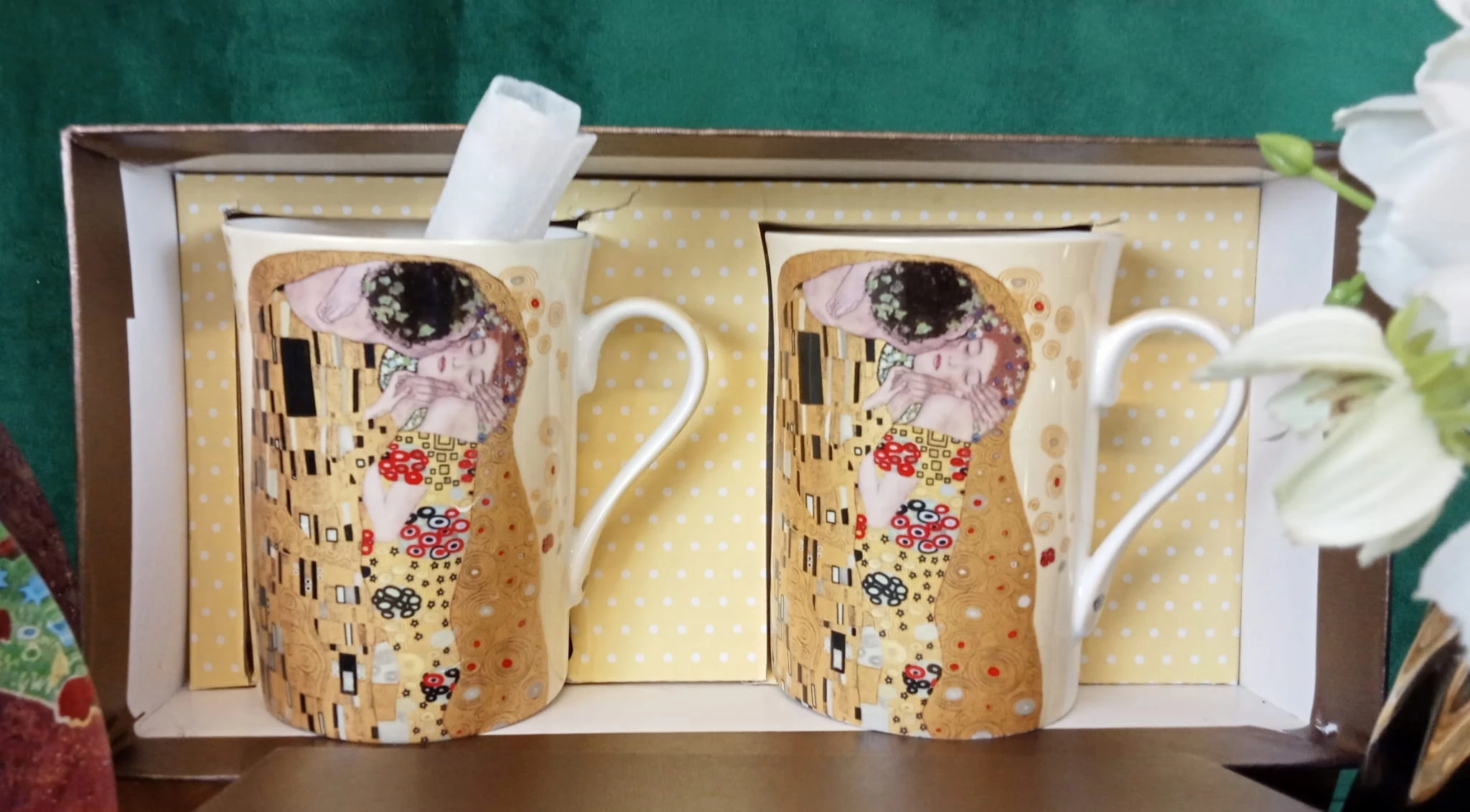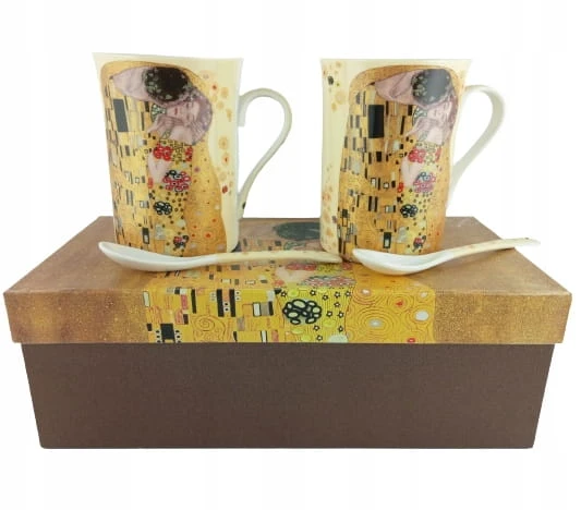 Elegancki zestaw 2 kubków z łyżeczkami z motywem obrazu "Pocałunek". Idealny pomysł na upominek dla miłośników twórczości Gustava Klimta lub sztuki secesji.