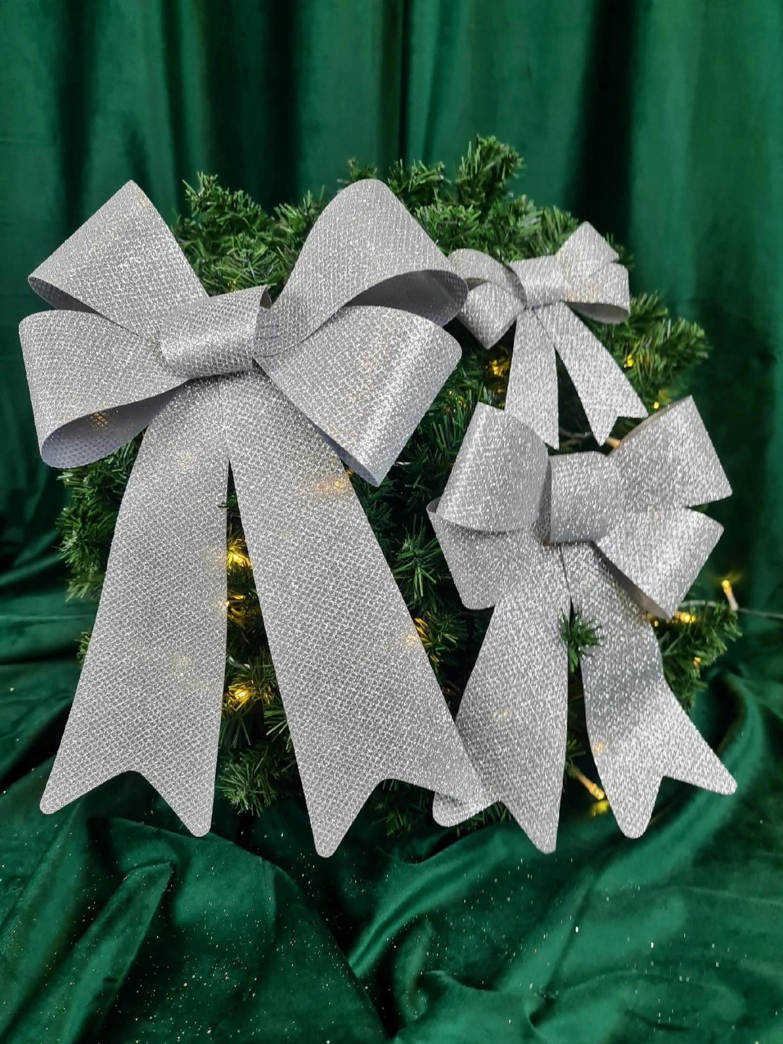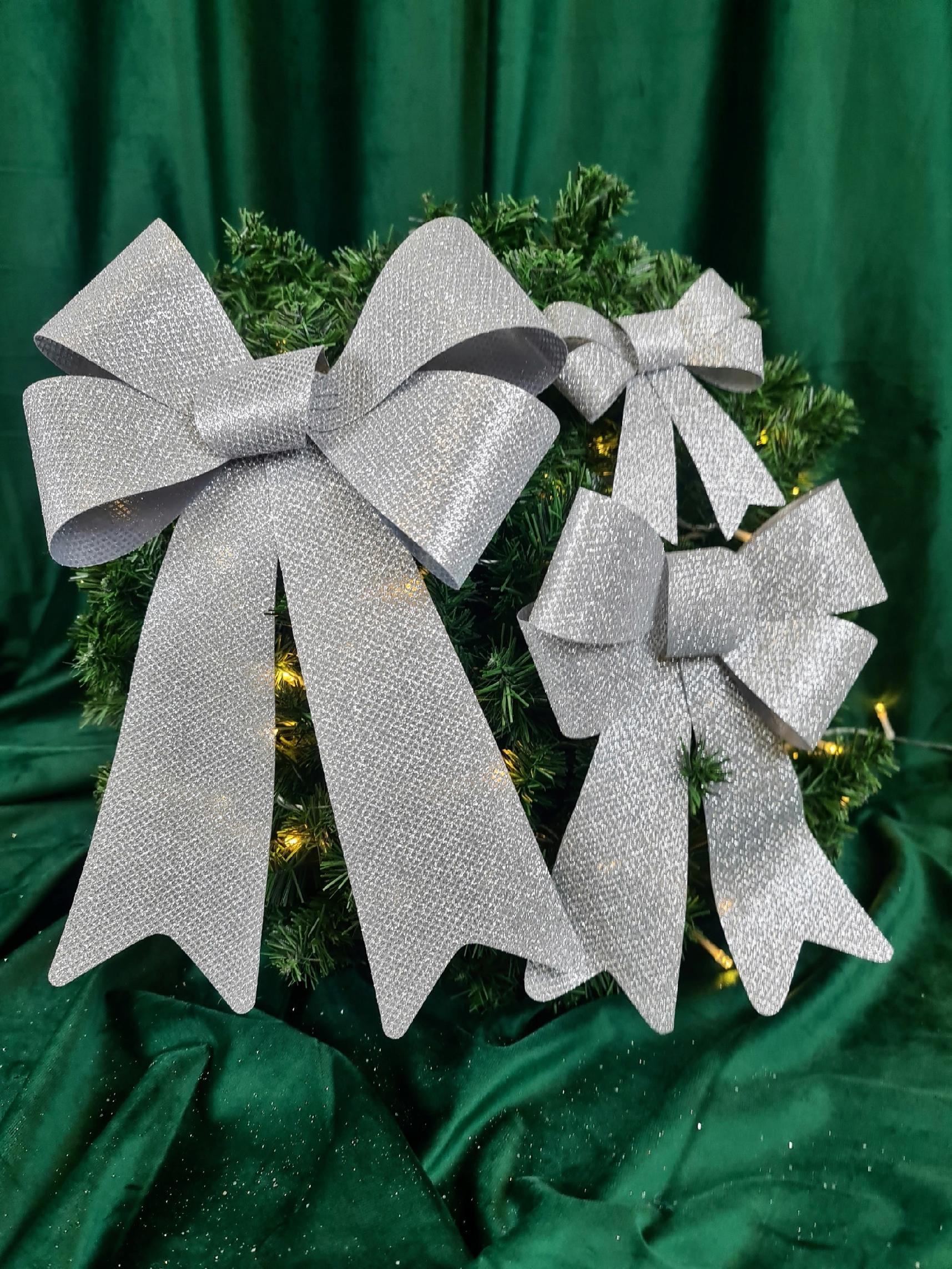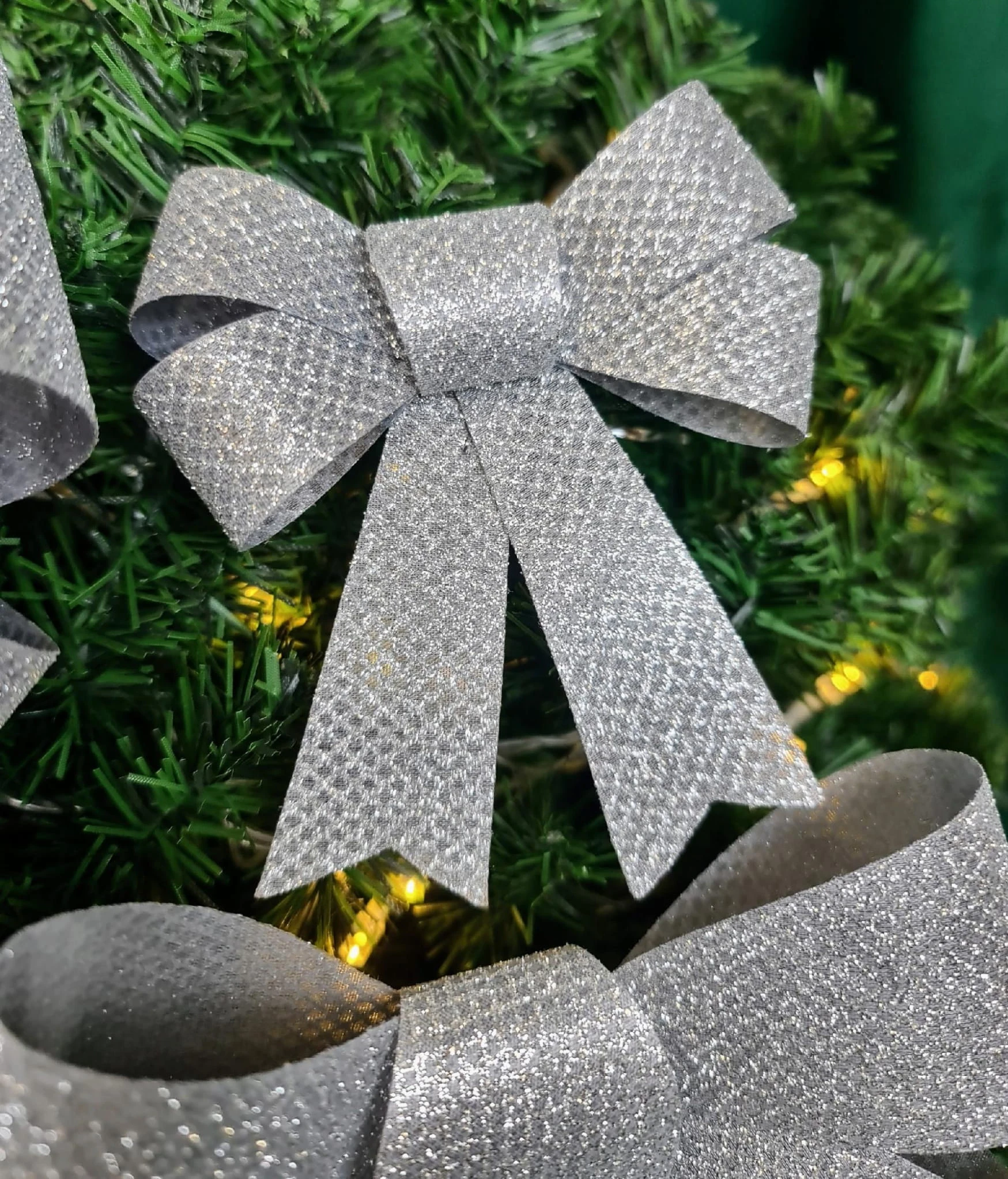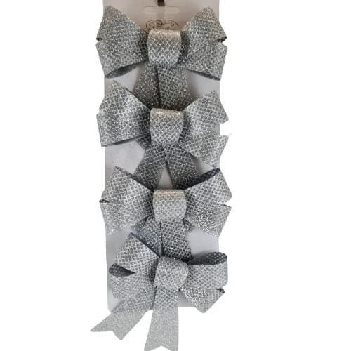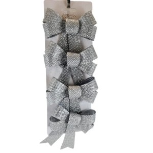 Kokardy wykonane są z sztywnego materiału pokrytego srebrnym materiałem i oprószone brokatem, dzięki czemu ładnie będą prezentować się przy prezencie. Modna i stylowa dekoracja w tym sezonie. Wykorzystać można je do różnych zdobień, ogranicza nas jedynie wyobraźnia.