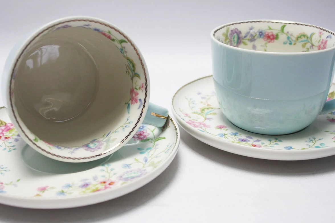 Elegancki zestaw subtelnie zdobionych filiżanek z talerzykami.