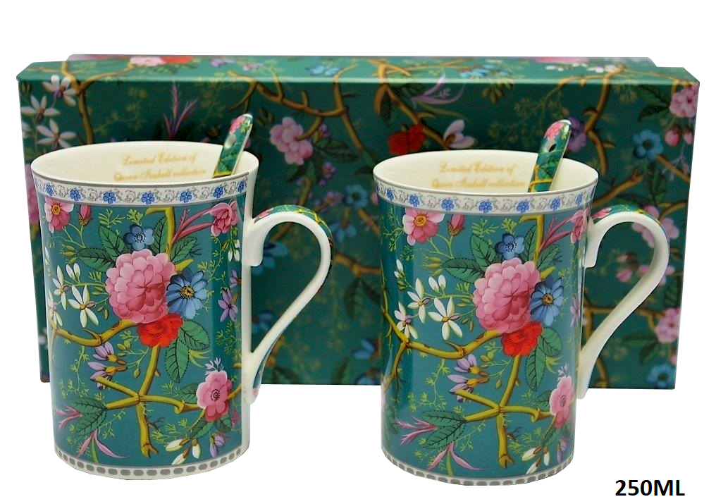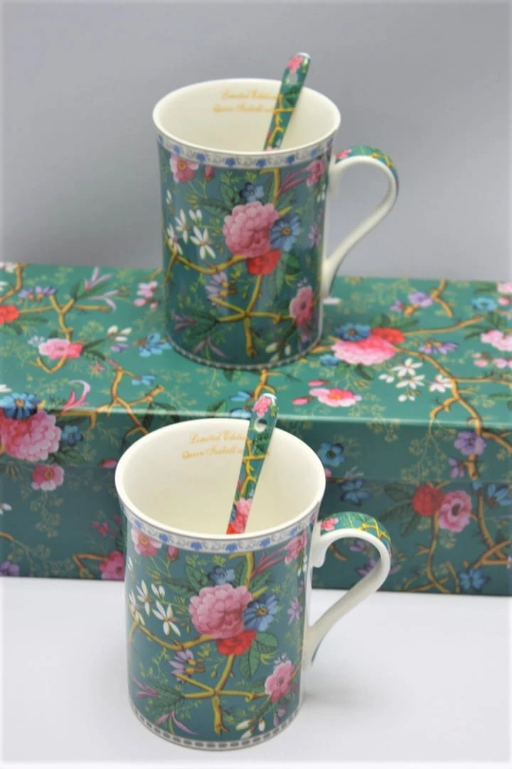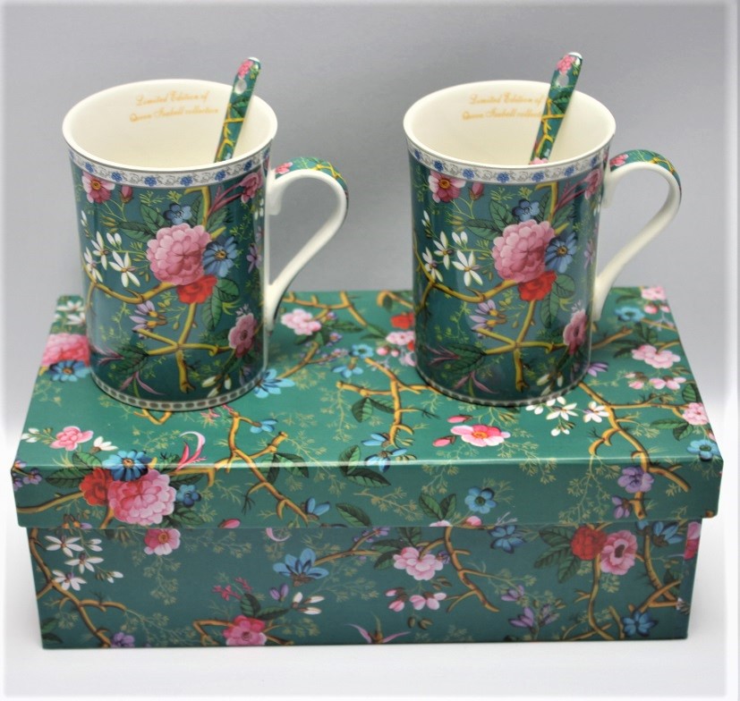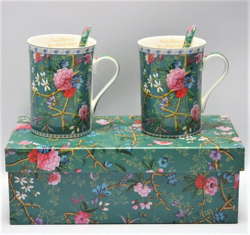 Elegancki zestaw 2 zielonych kubków z subtelnym, romantycznym motywem kwiatów zapakowane w ozdobne pudełko. Idealny pomysł na upominek dla miłosników roślin czy też klasycznej elegancji.