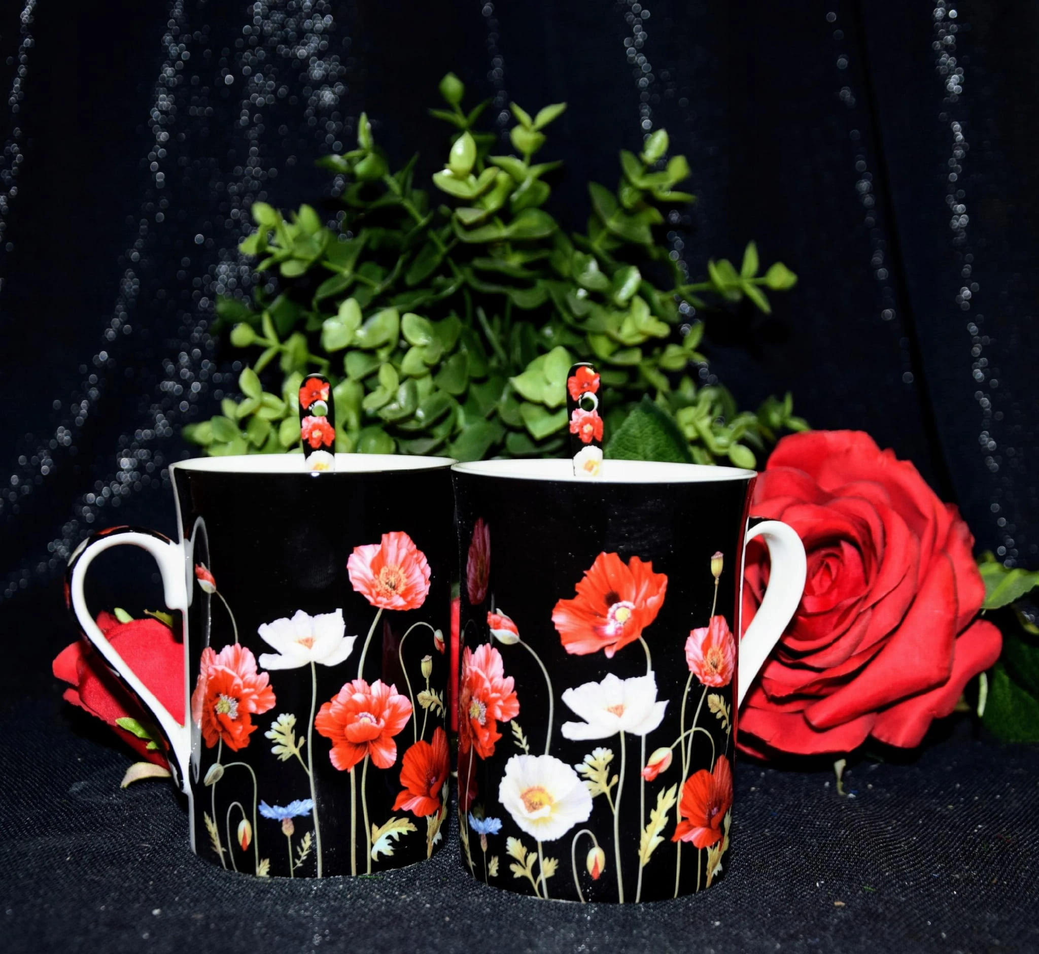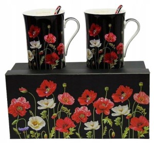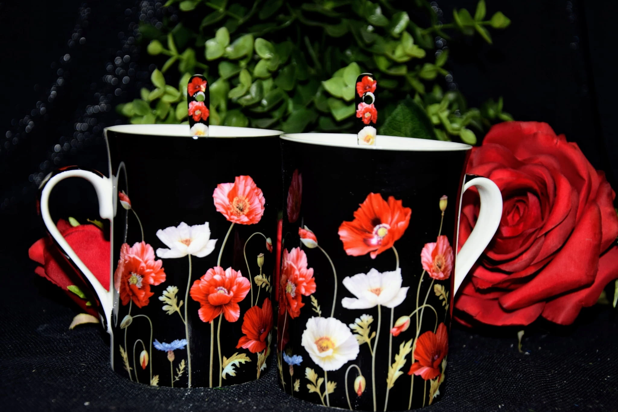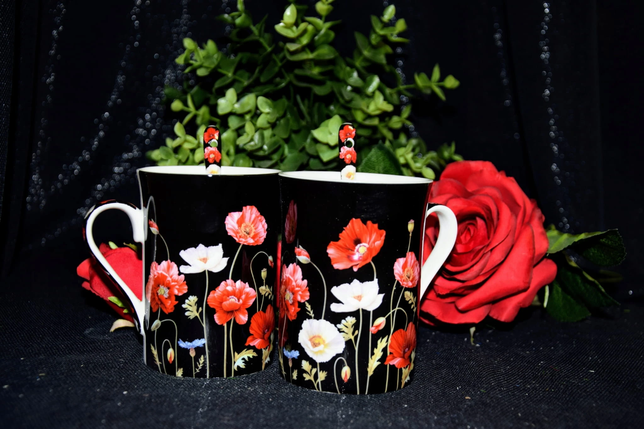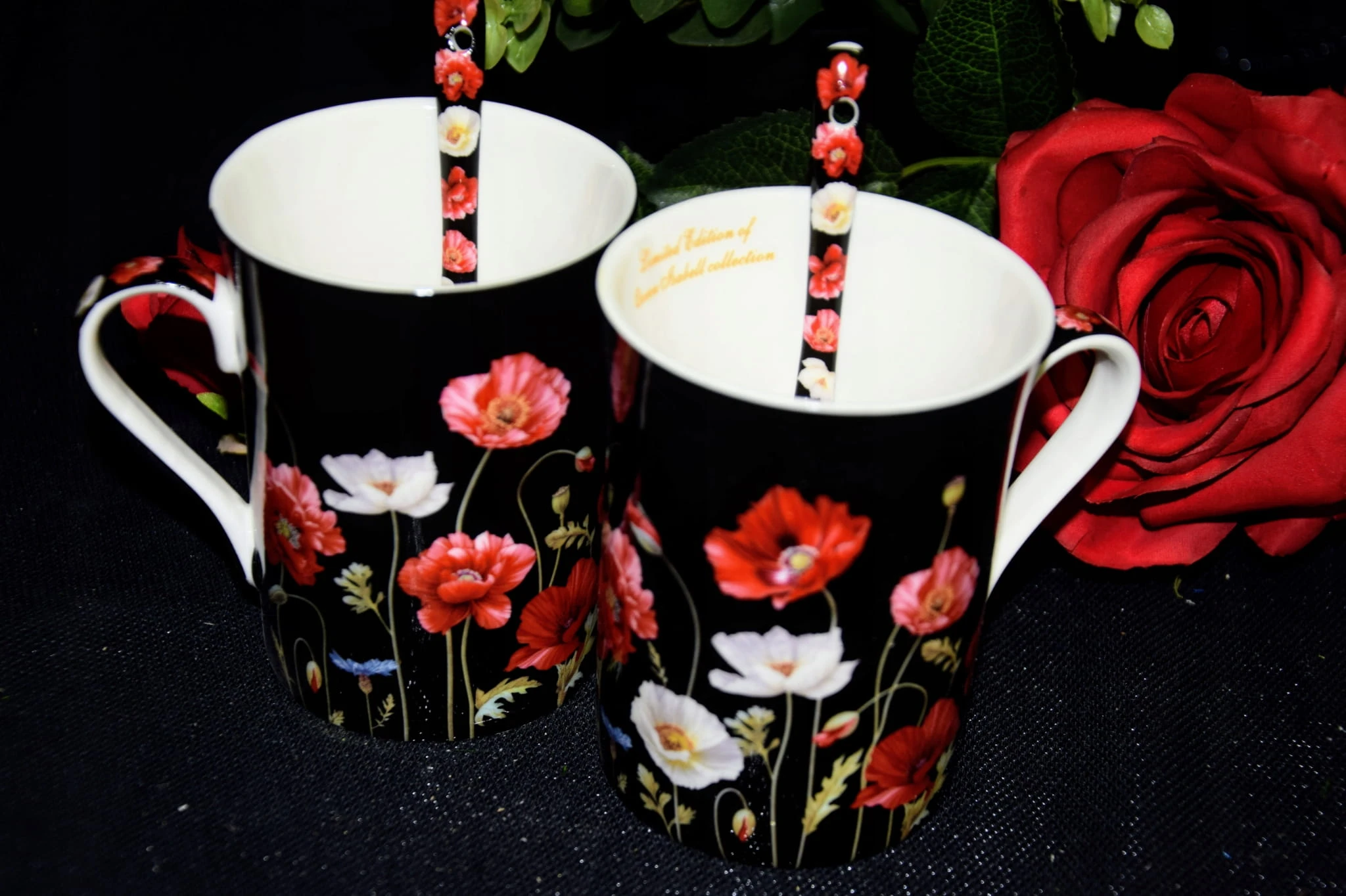 Zestaw kubków porcelanowych z motywem kwiatów- maków.