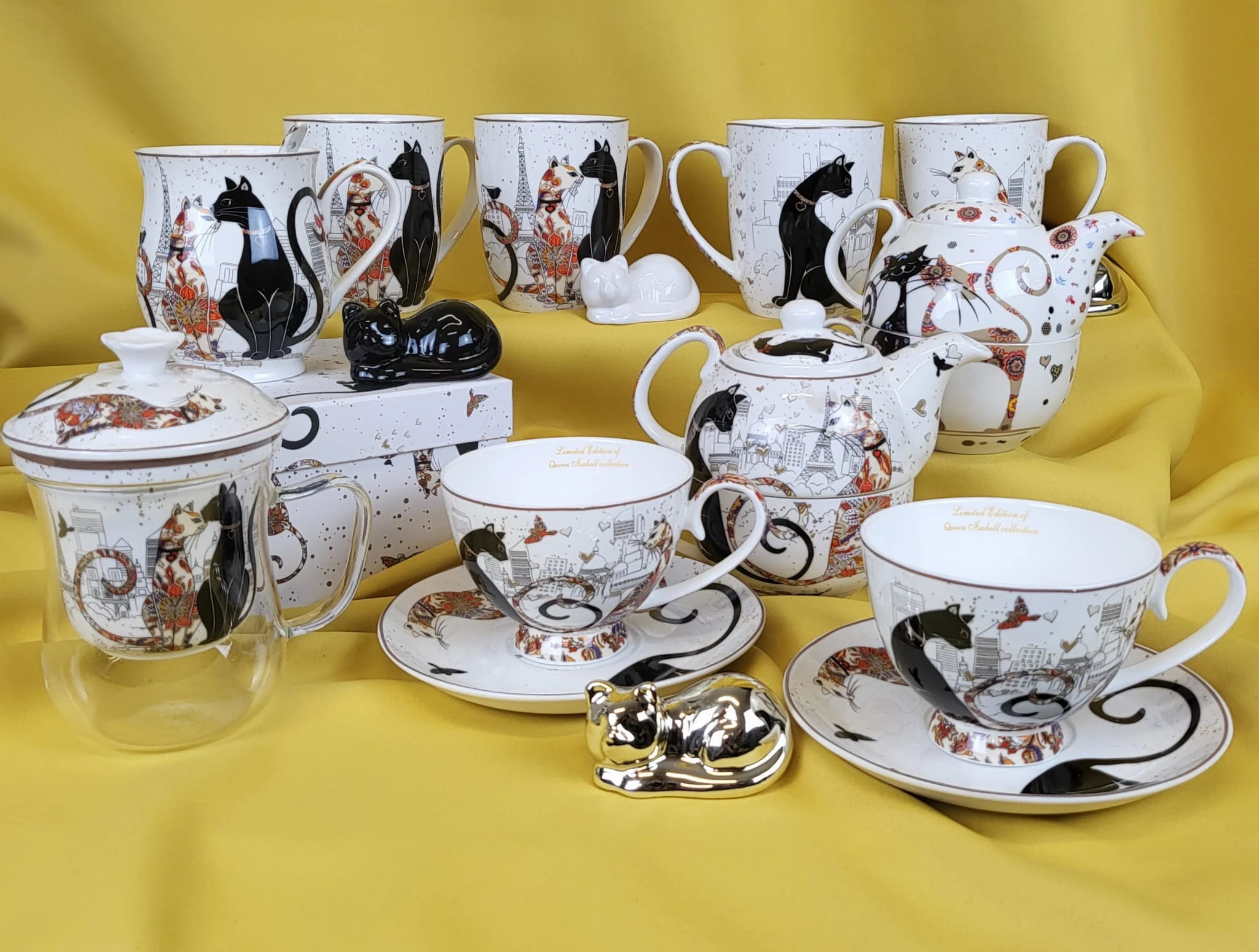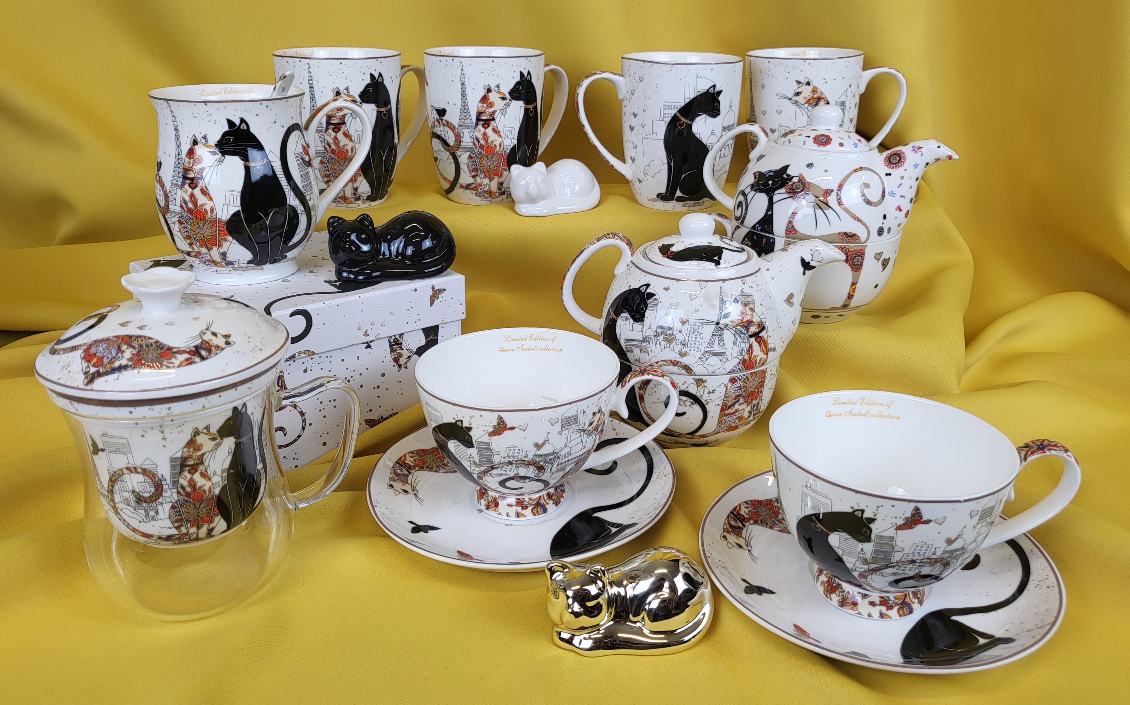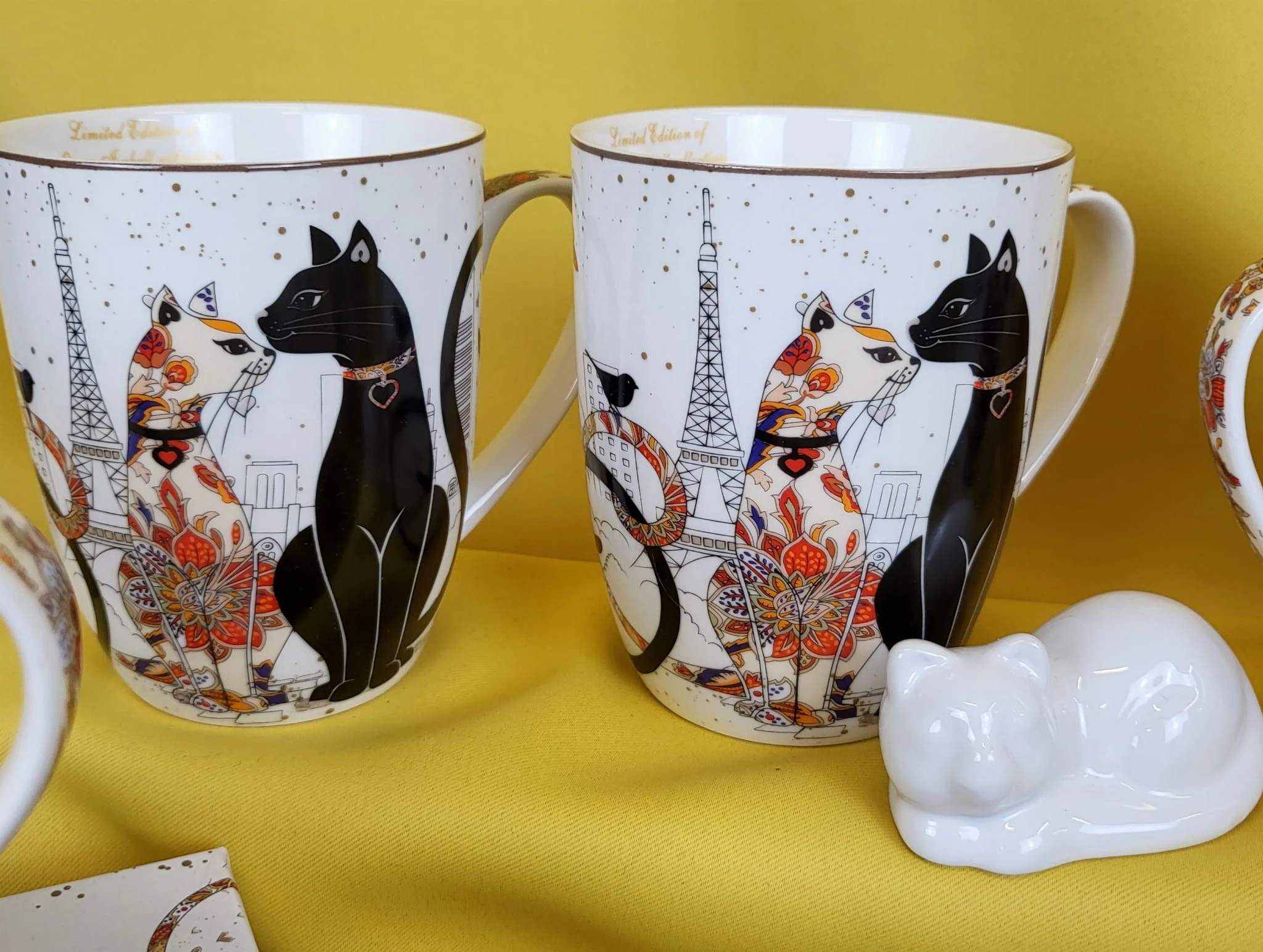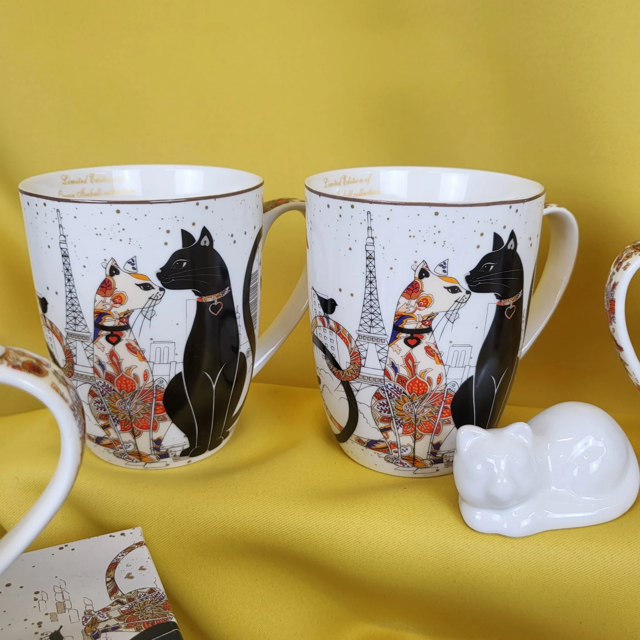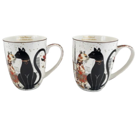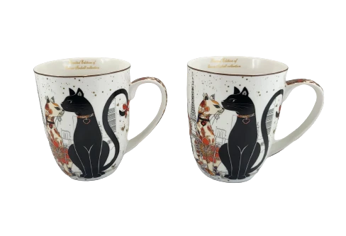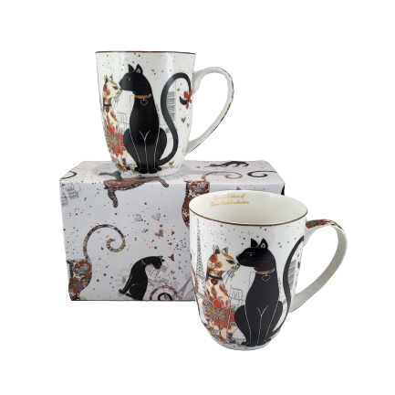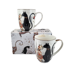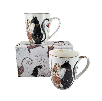 Elegancki zestaw kubków z motywem kotów w pudełku.