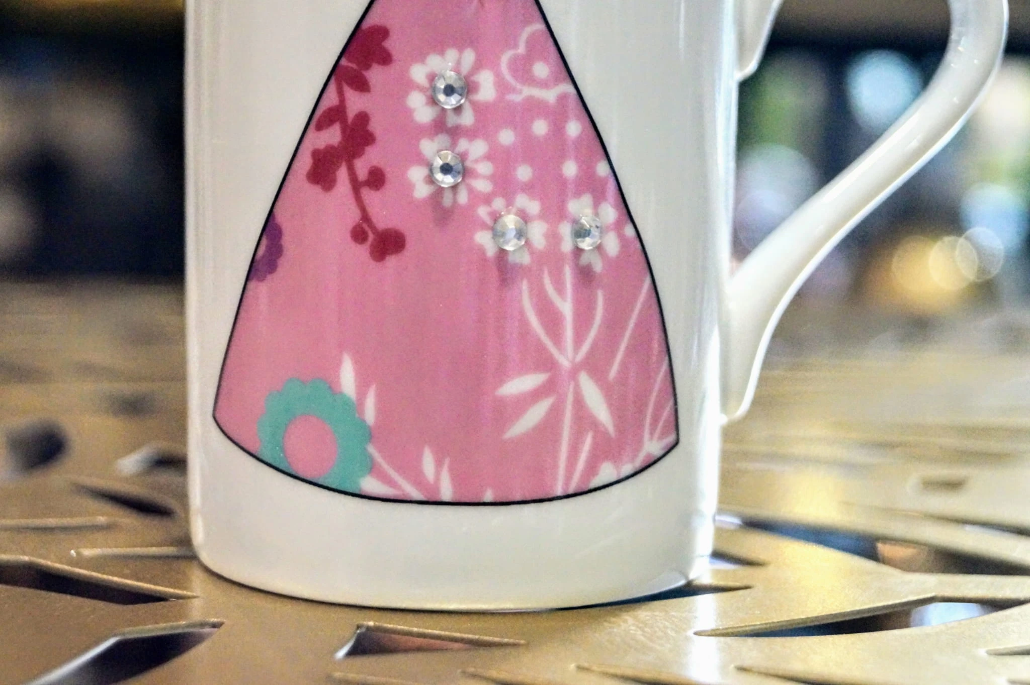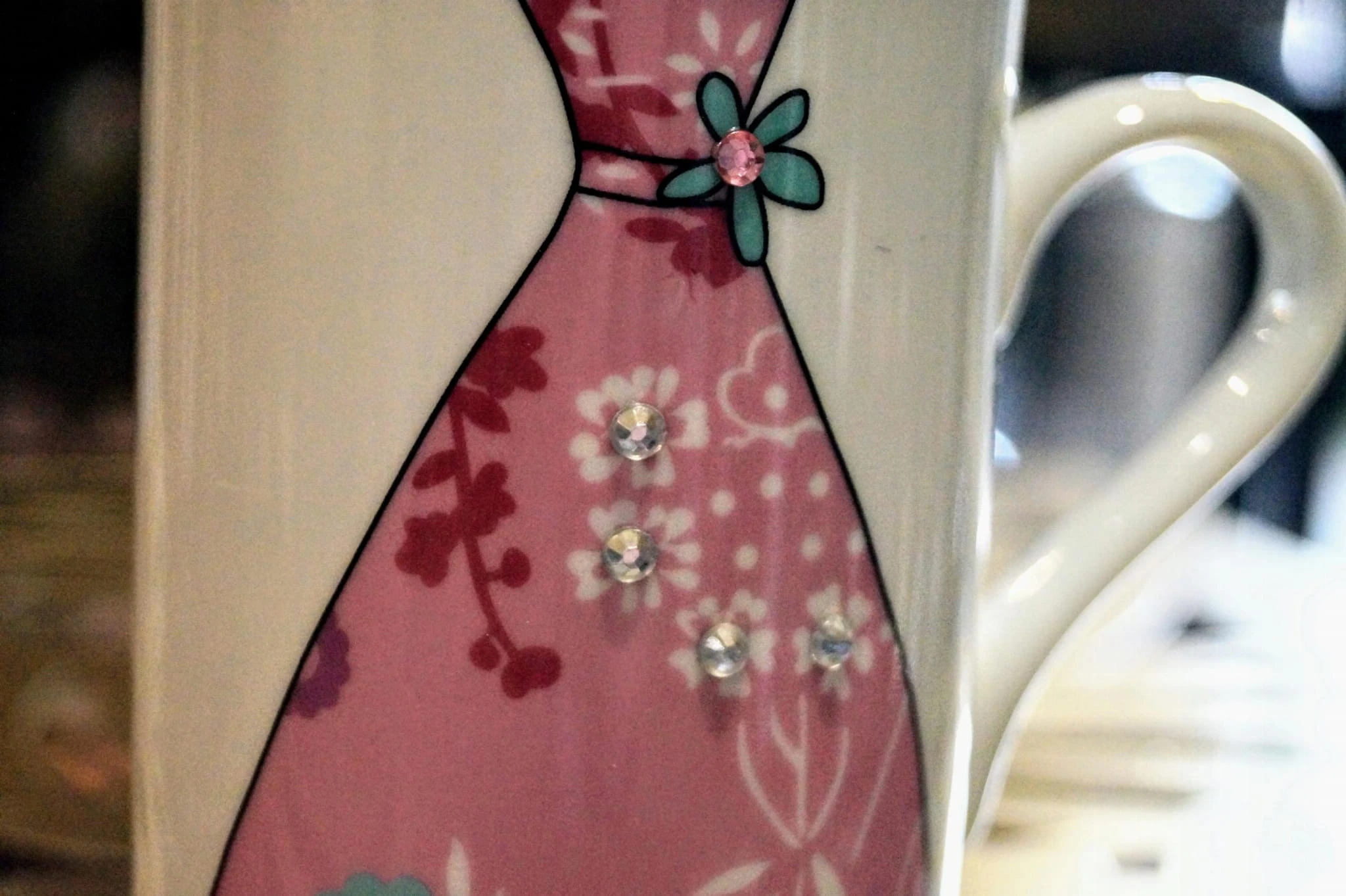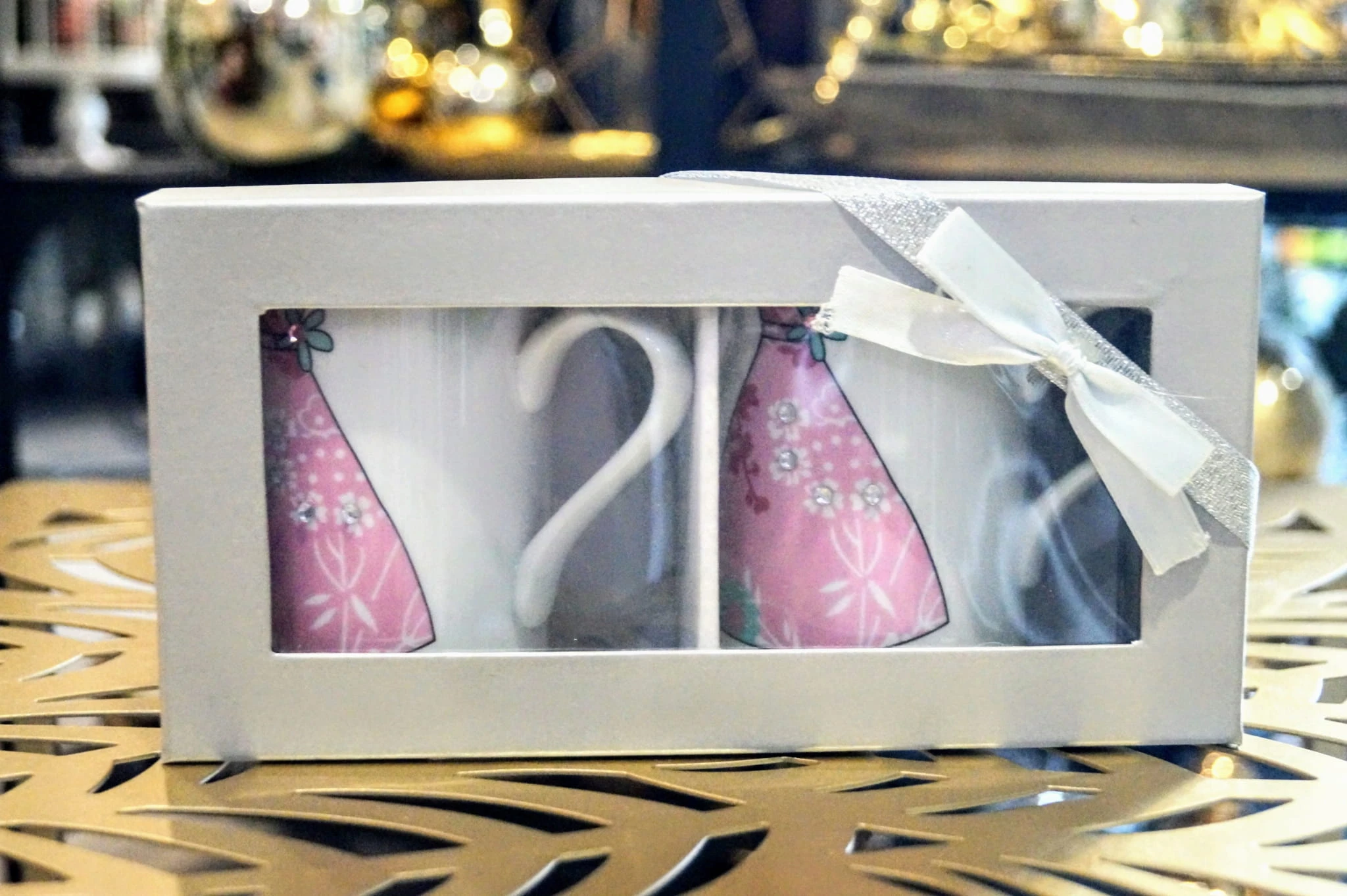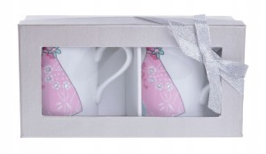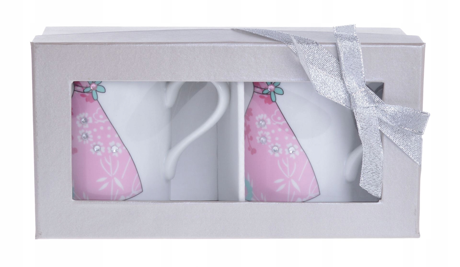 Komplet dwóch dekoracyjnych kubków ozdobionych syntetycznymi kamykami, w prezentowym opakowaniu ze wstążką.