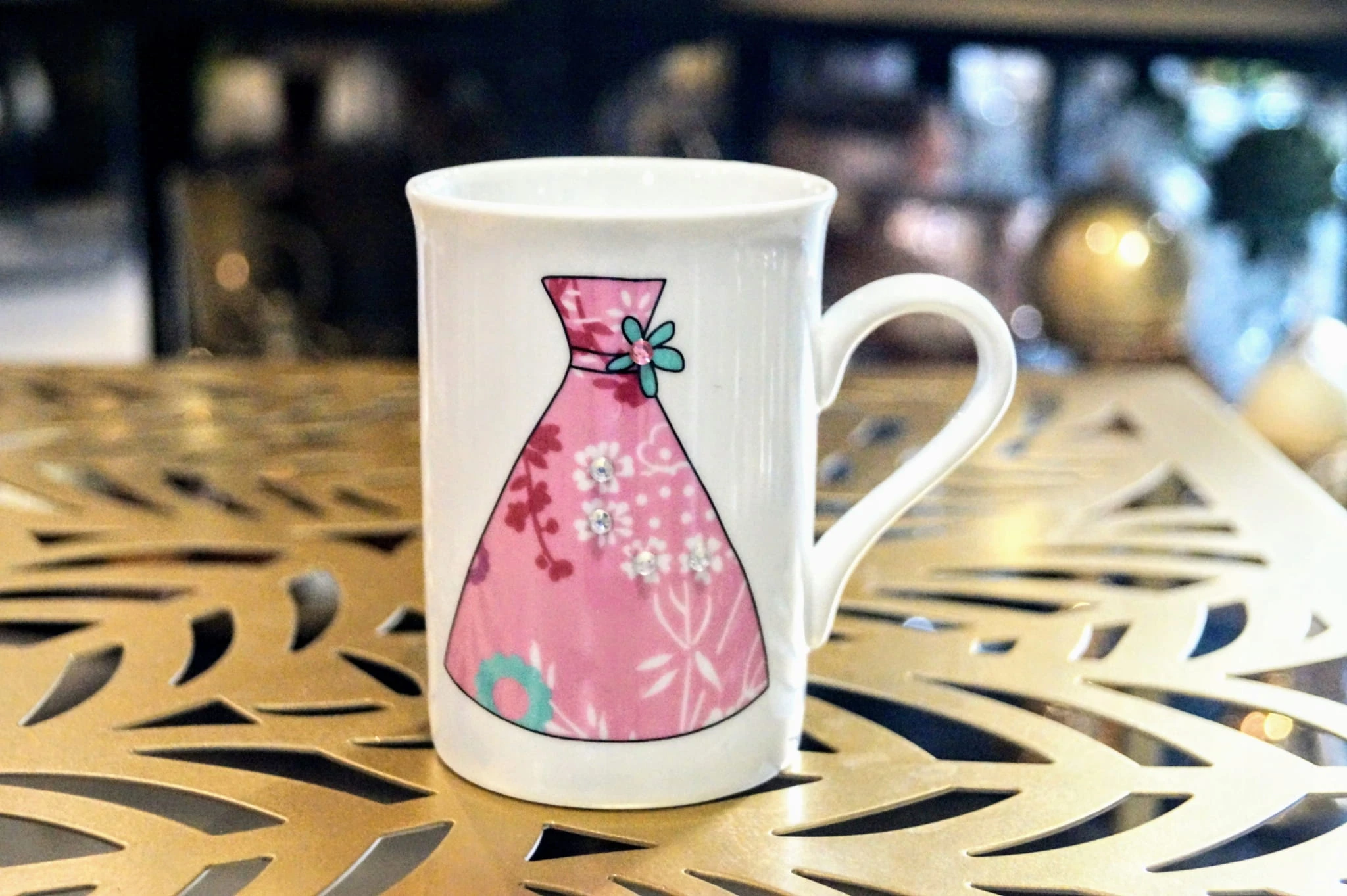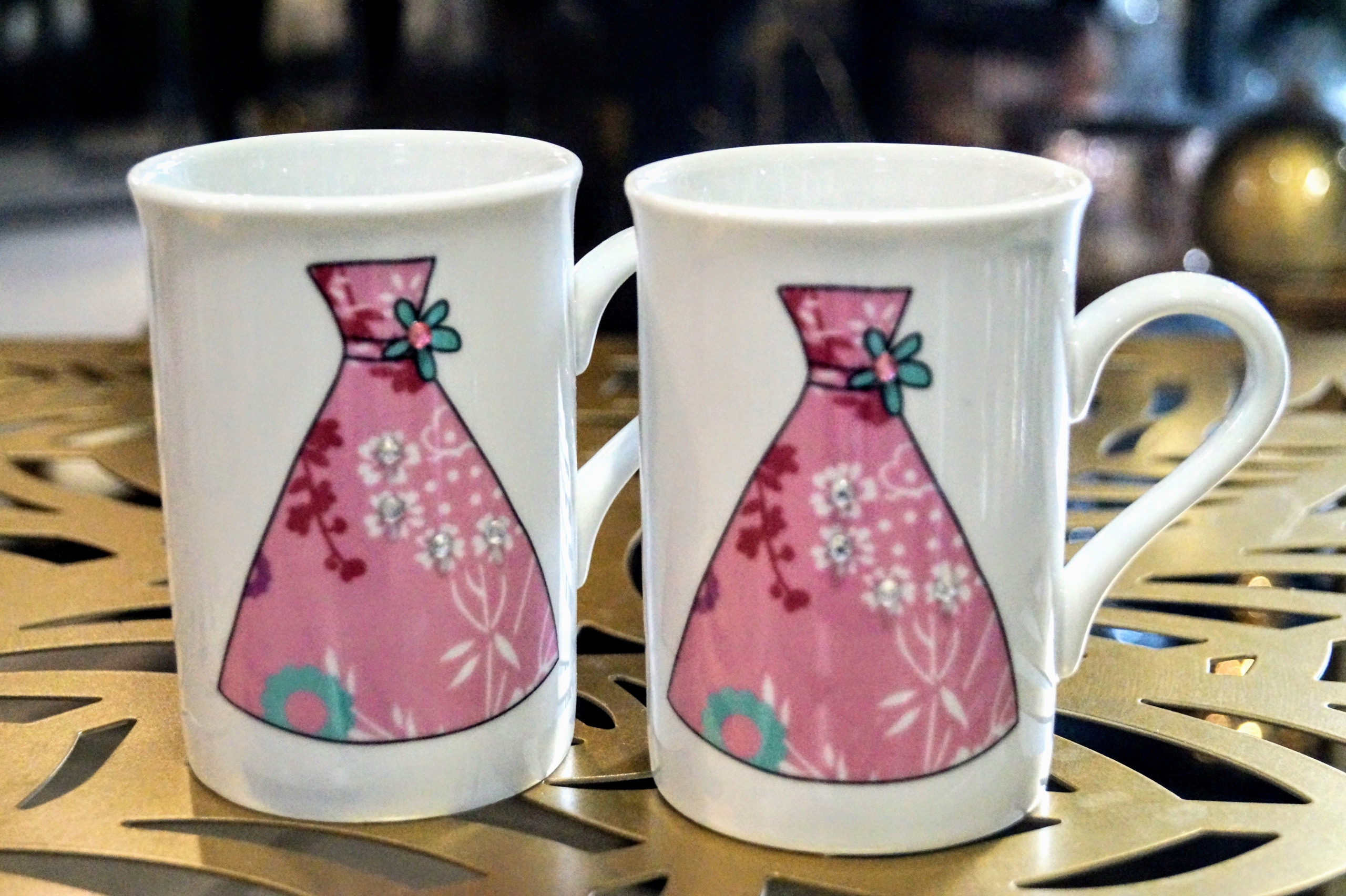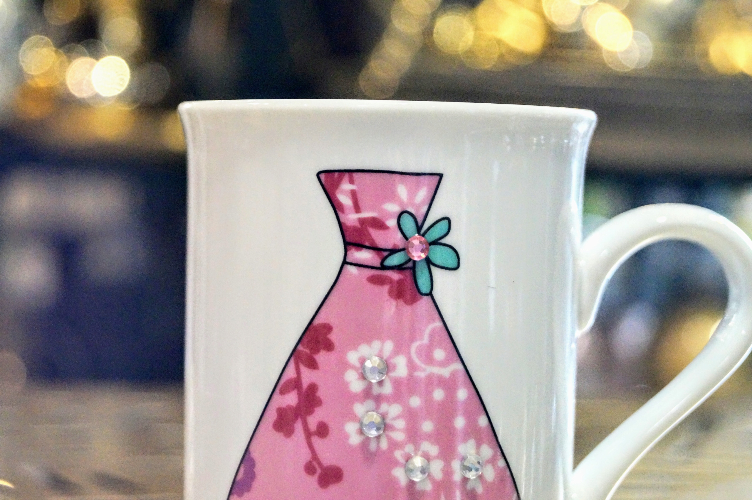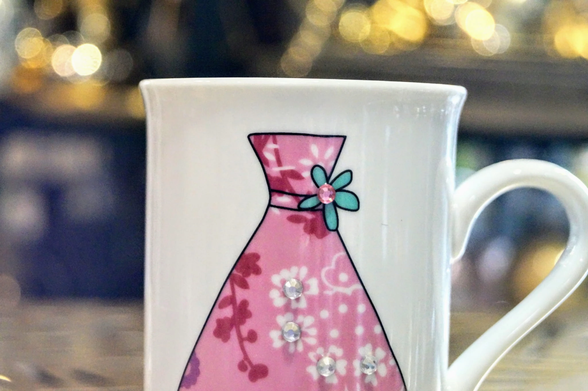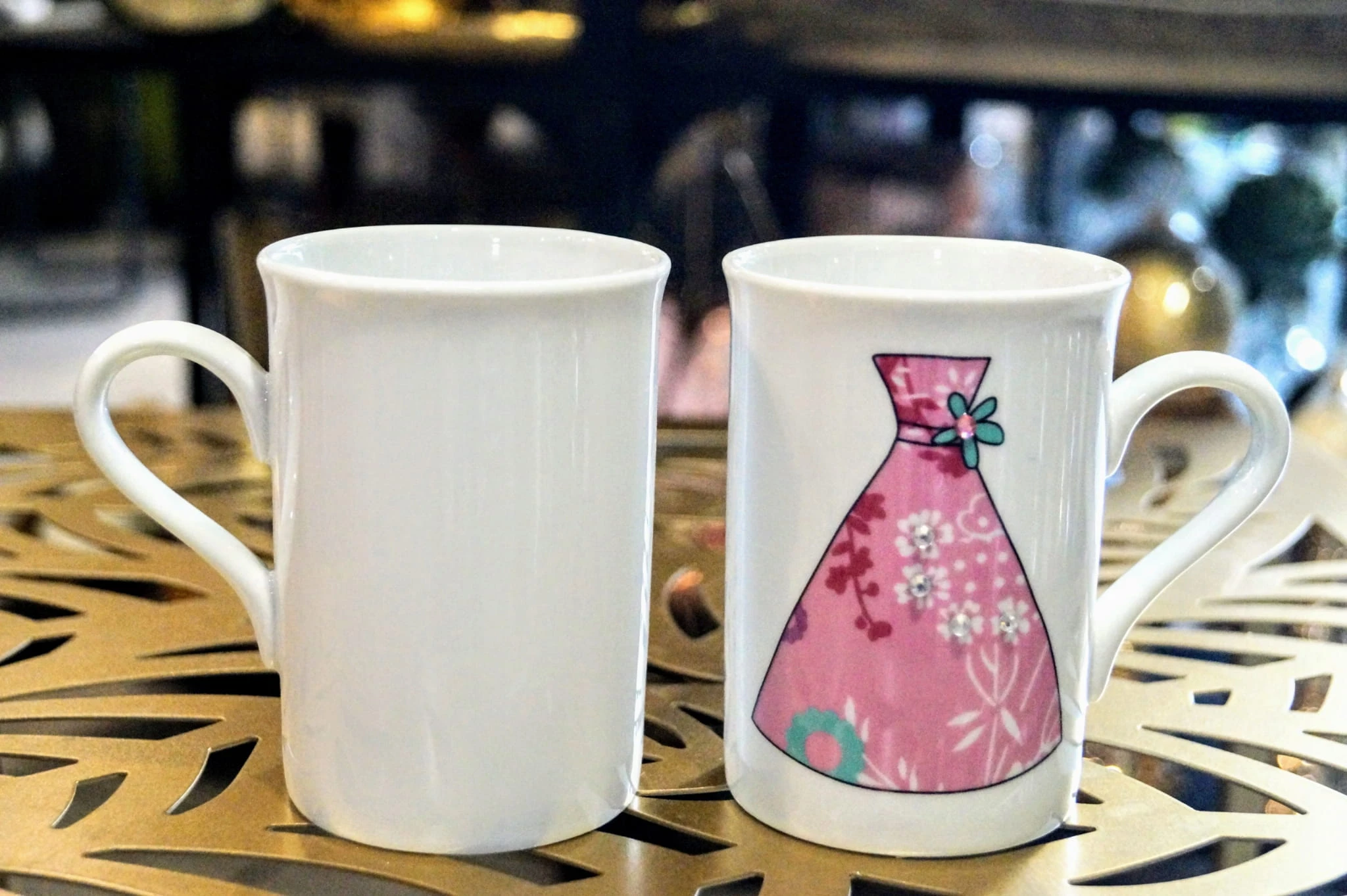 Komplet dwóch dekoracyjnych kubków ozdobionych syntetycznymi kamykami, w prezentowym opakowaniu ze wstążką.