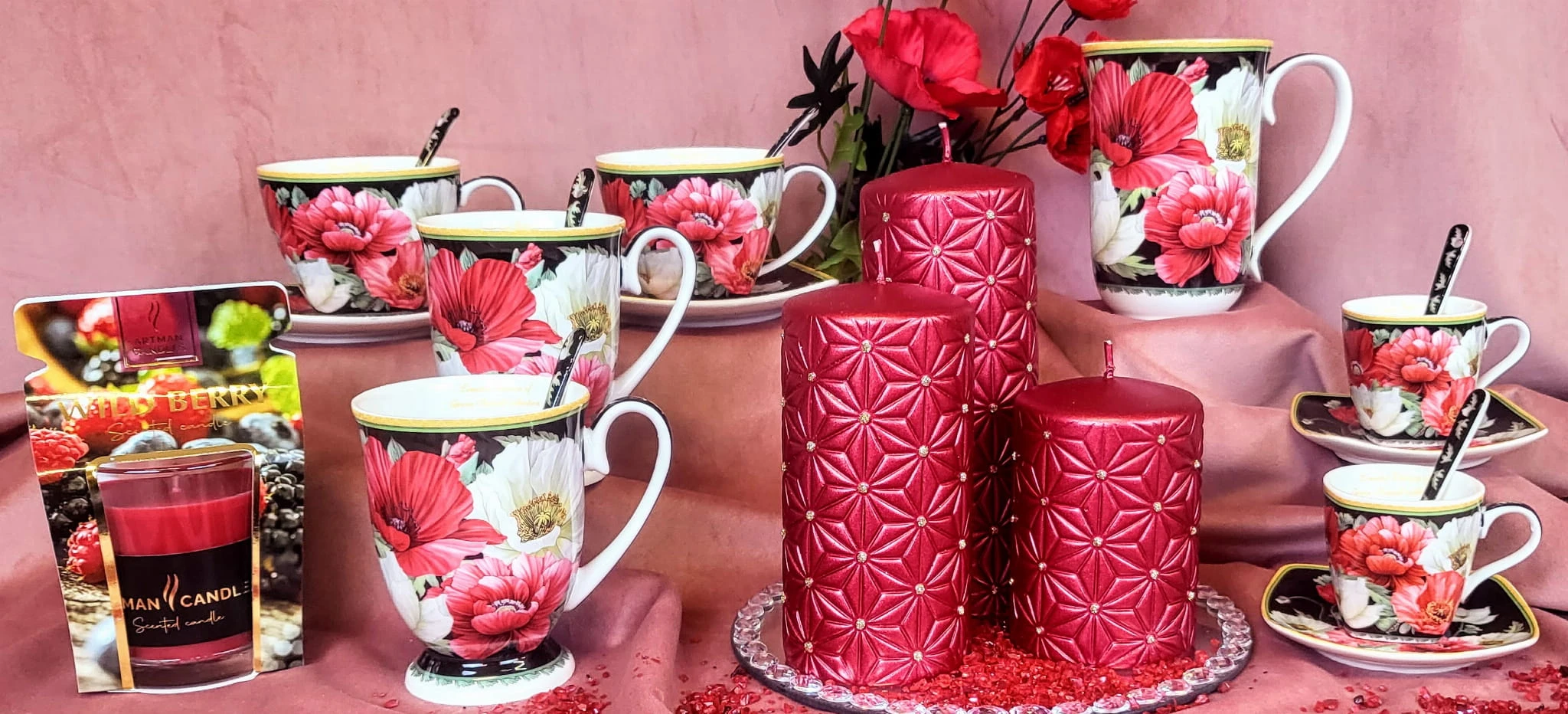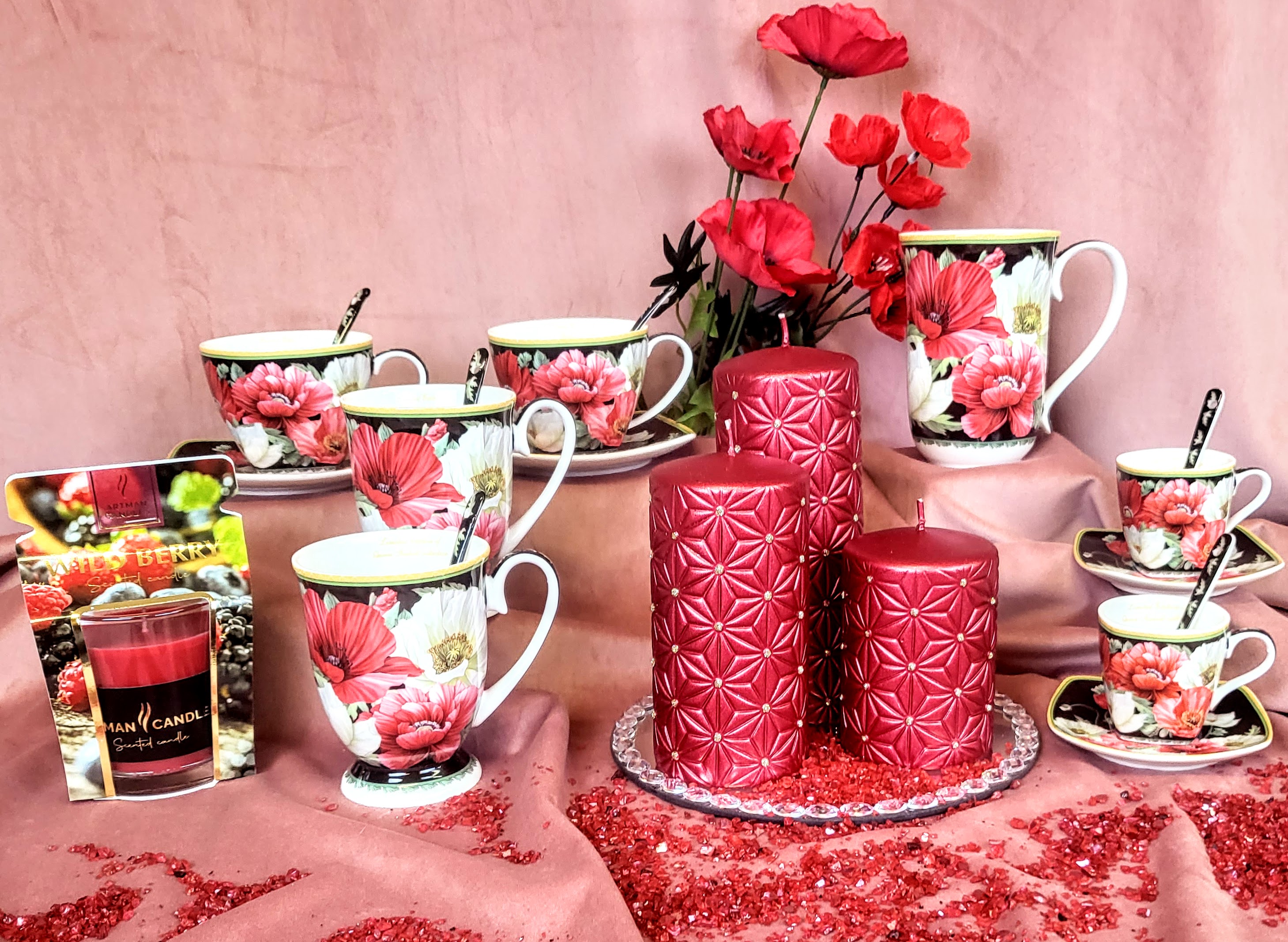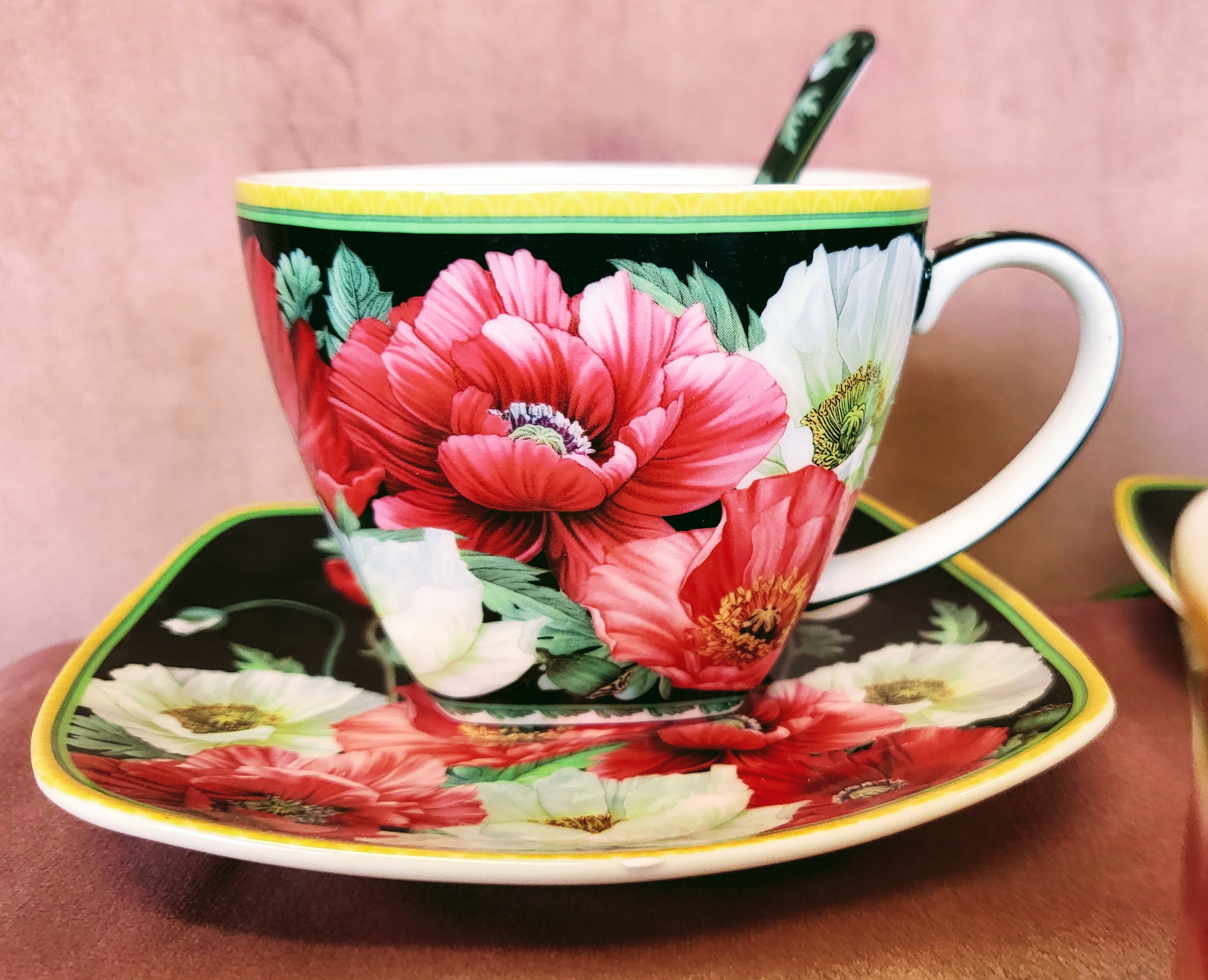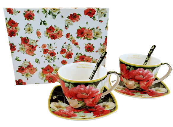 Elegancki zestaw 2 czarnych filiżanek z podstawkami i łyżeczkami z motywem maków w pudełku. Idealny pomysł na upominek dla miłosników roślin czy też klasycznej elegancji.