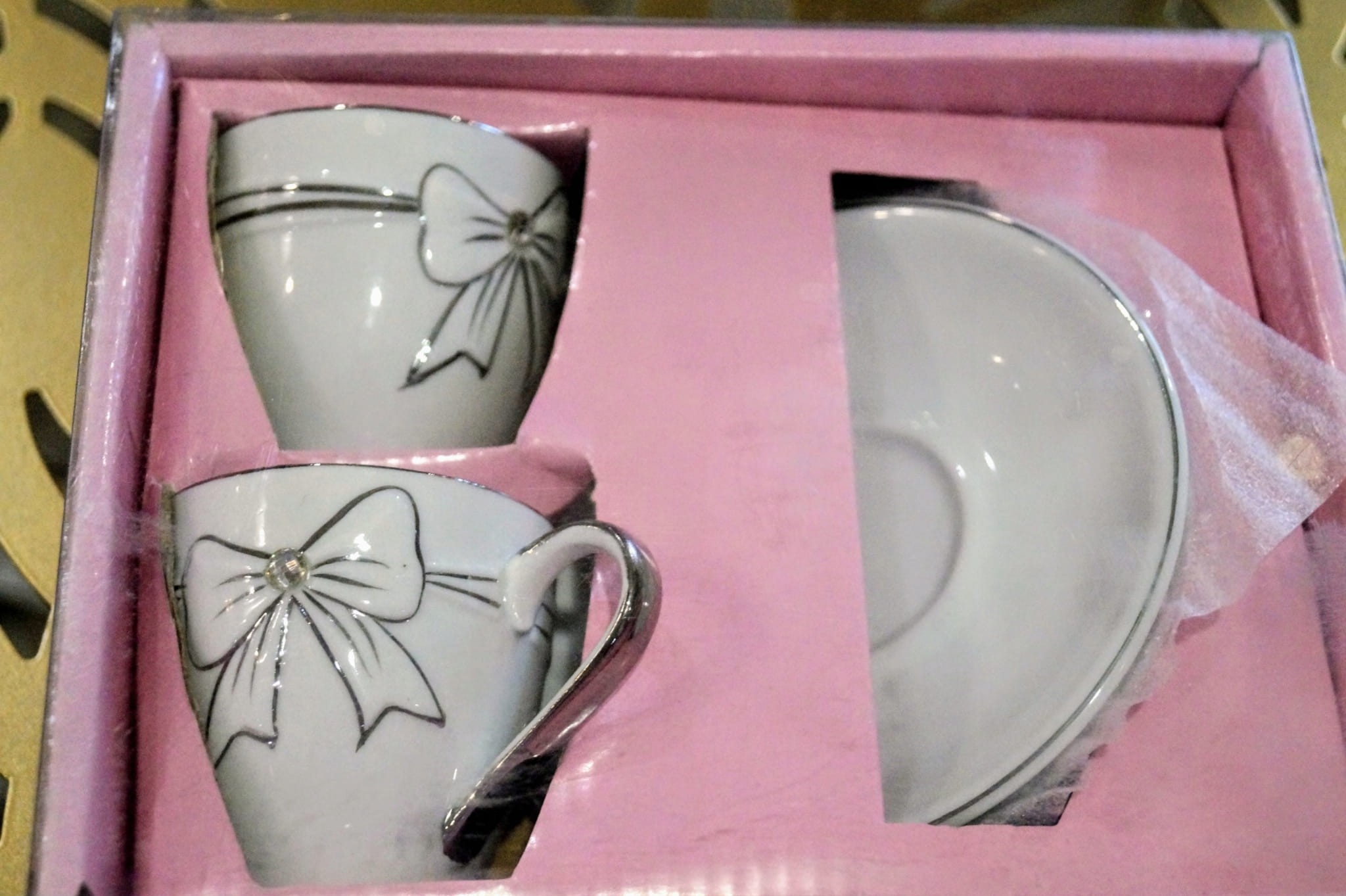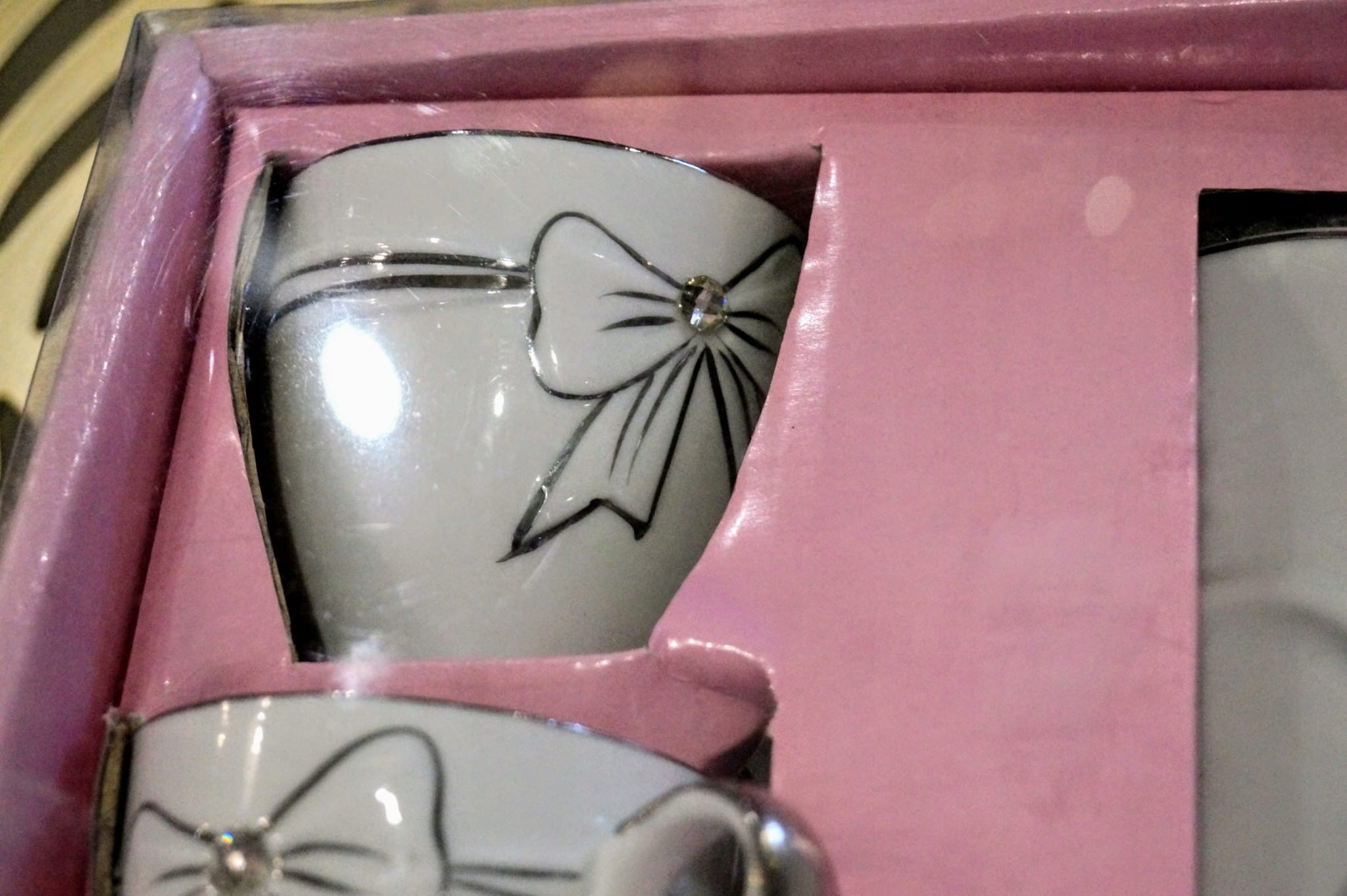 Komplet dwóch ceramicznych białych filiżanek. Zdobione w bardzo delikatny jednak efektowny sposób. Idealne na prezent dzięki uroczemu opakowaniu.