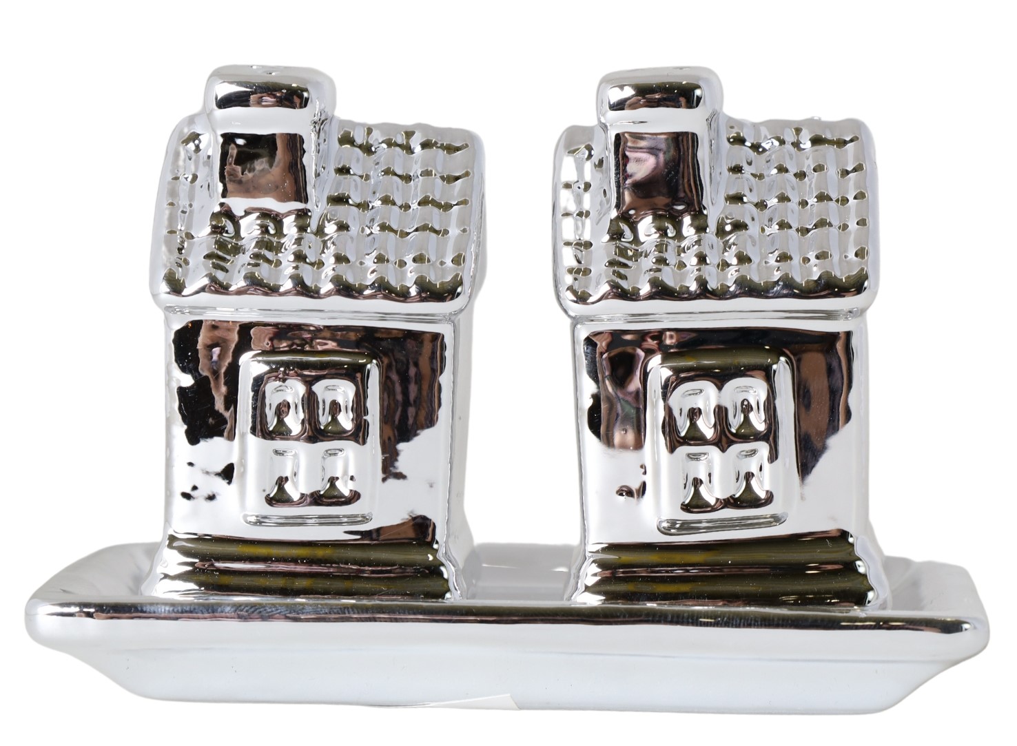 Komplet składa się z dwóch domków w srebrnym kolorze (pieprzniczki i solniczki).