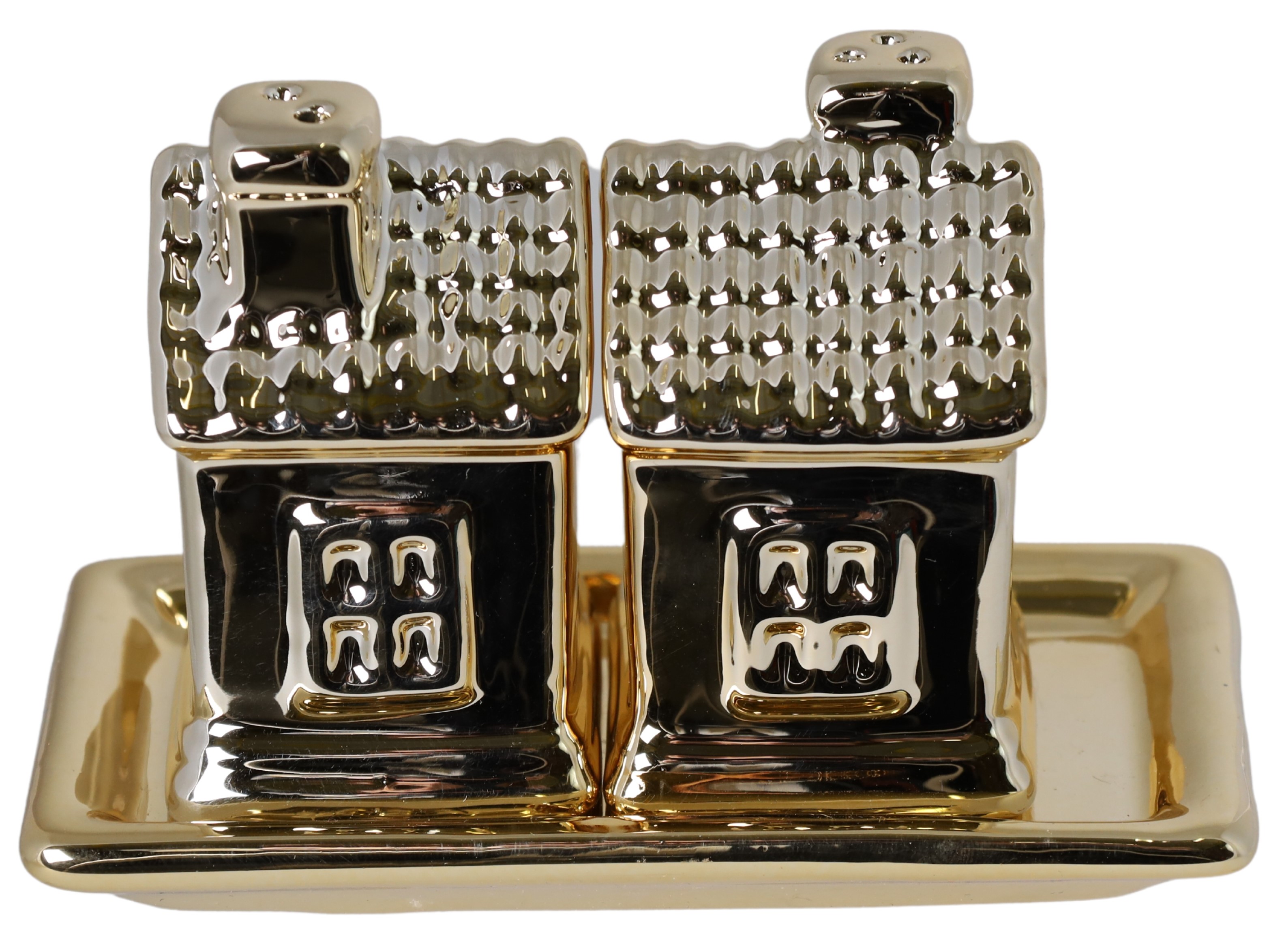 Komplet składa się z dwóch domków w złotym kolorze (pieprzniczki i solniczki).