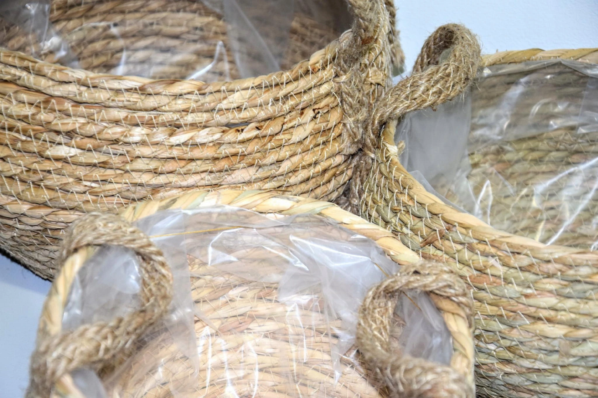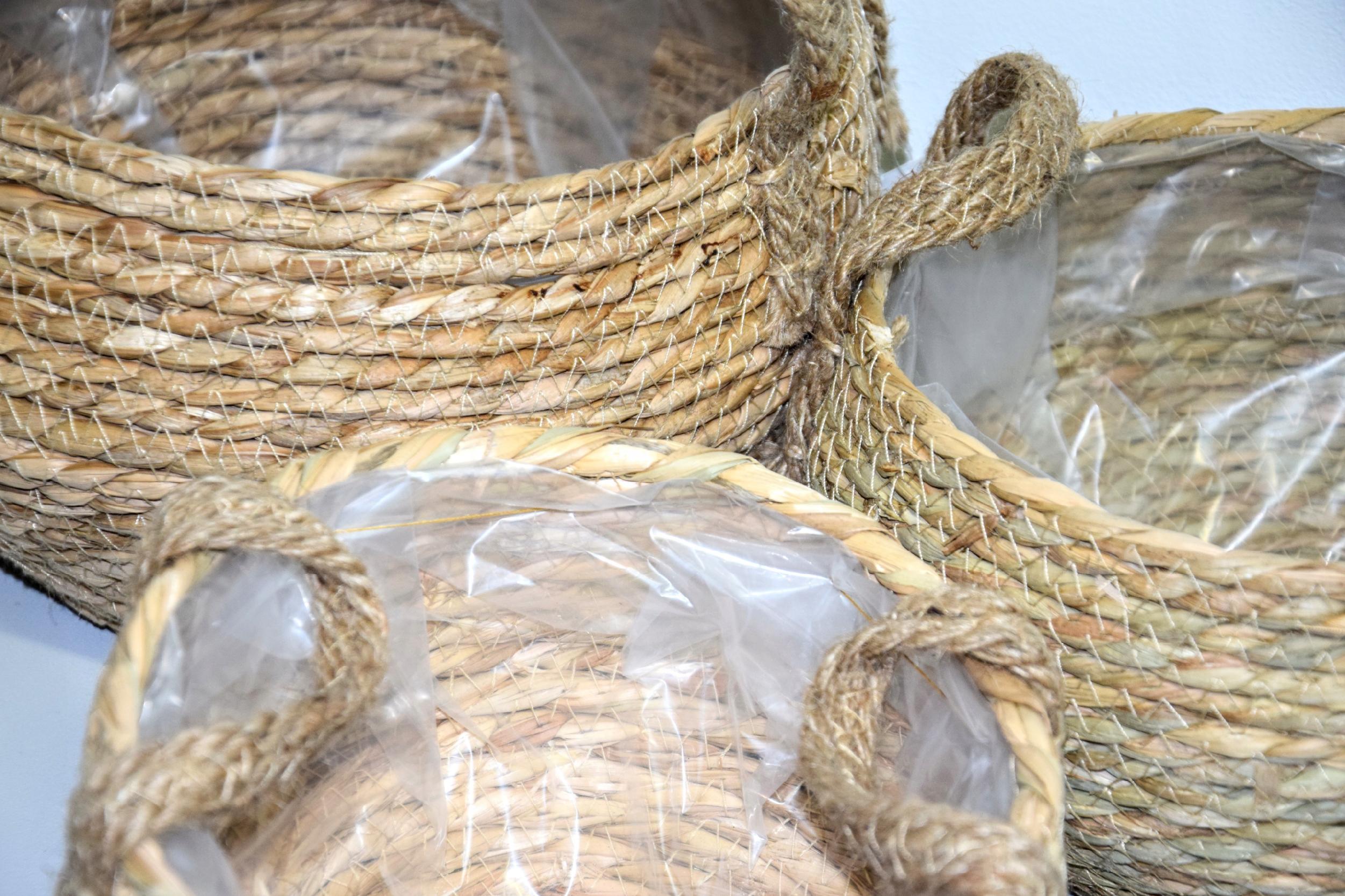 Komplet 3 plecionych koszyków wyściełanych folią. W razie potrzeby, folię można z łatwością odpruć.