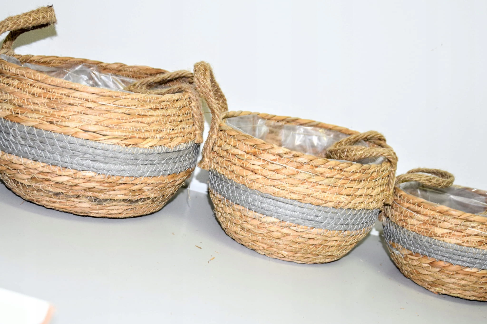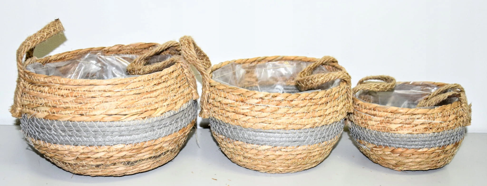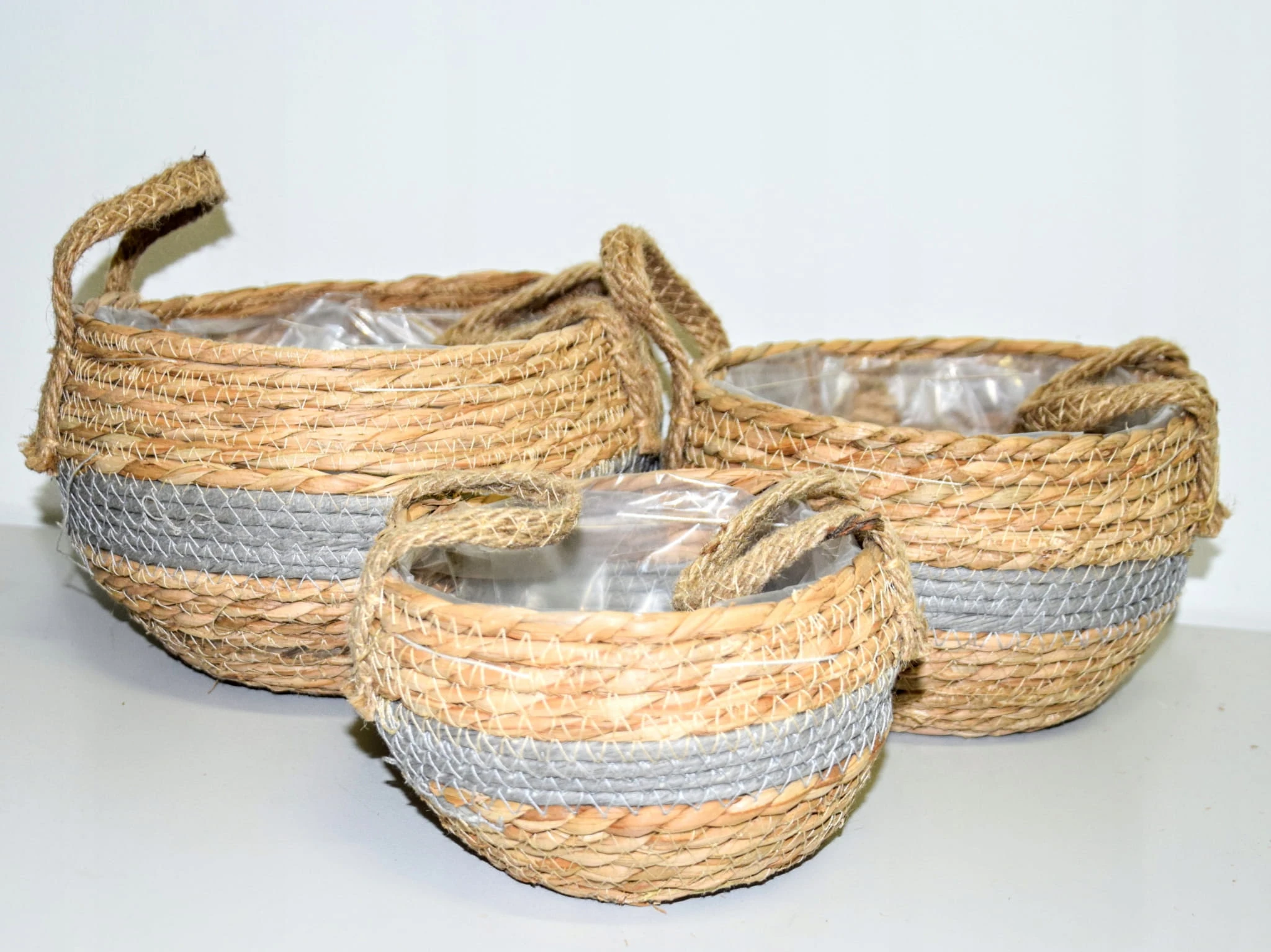 Komplet 3 plecionych koszyków wyściełanych folią. W razie potrzeby, folię można z łatwością odpruć.