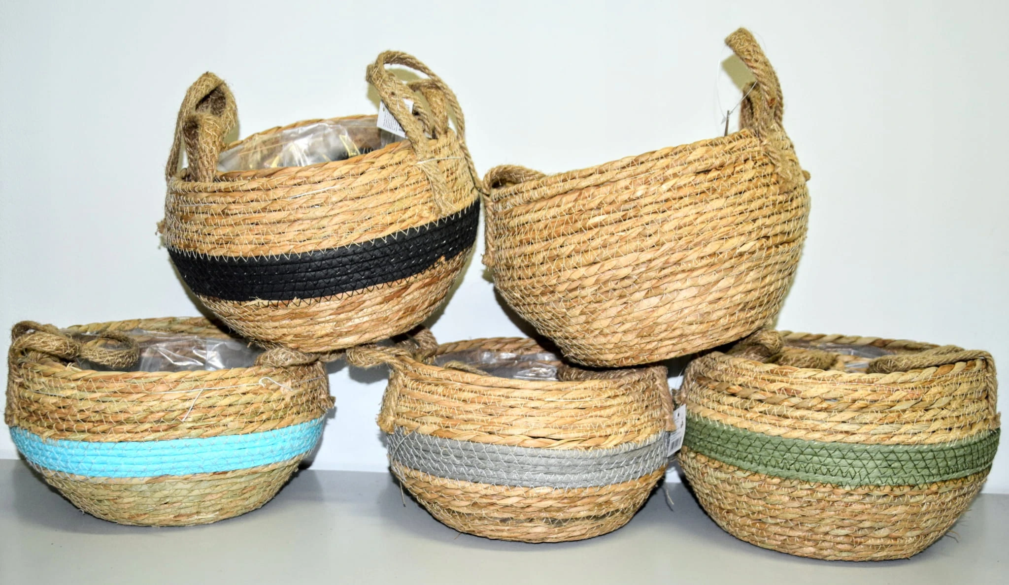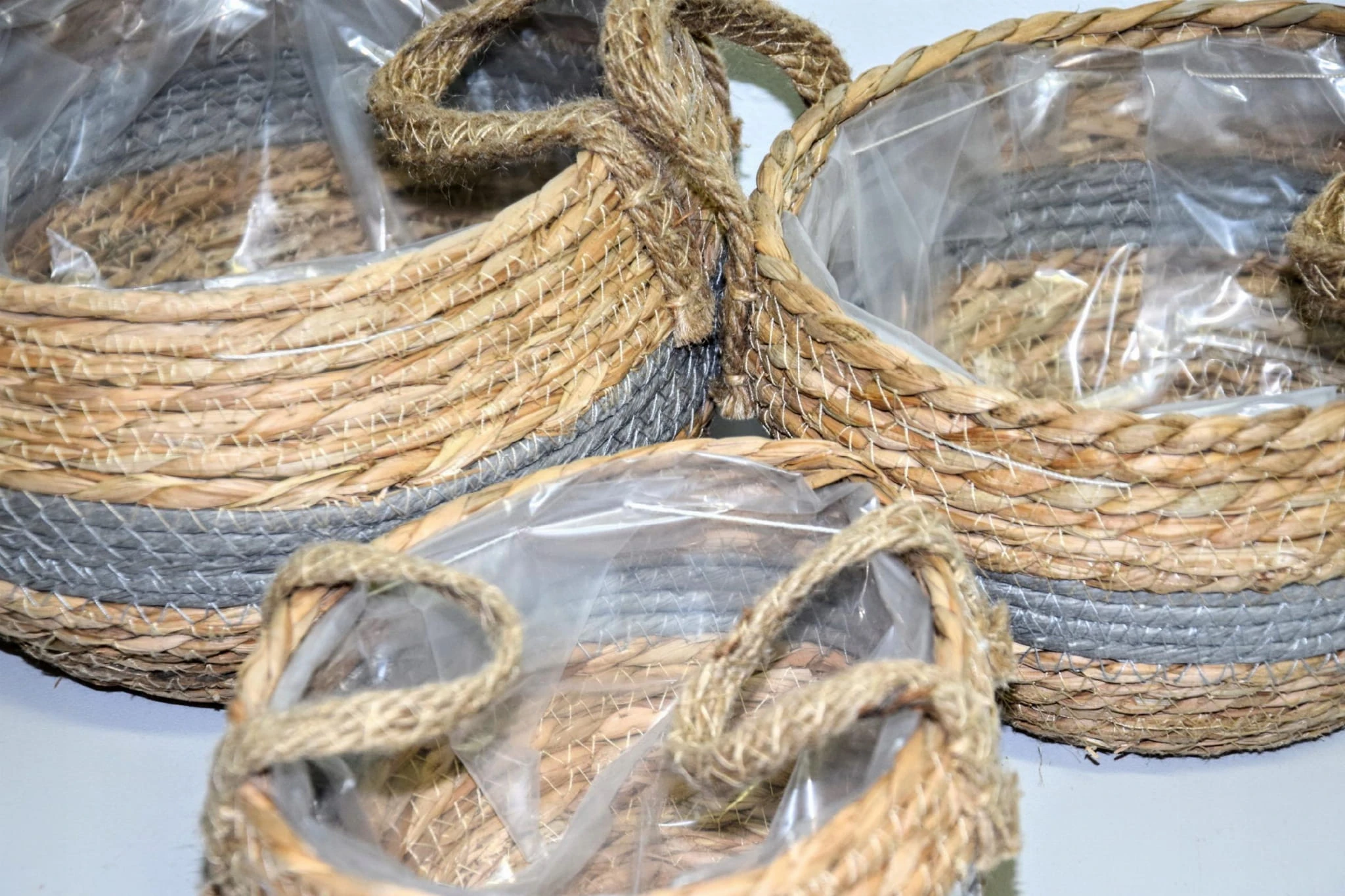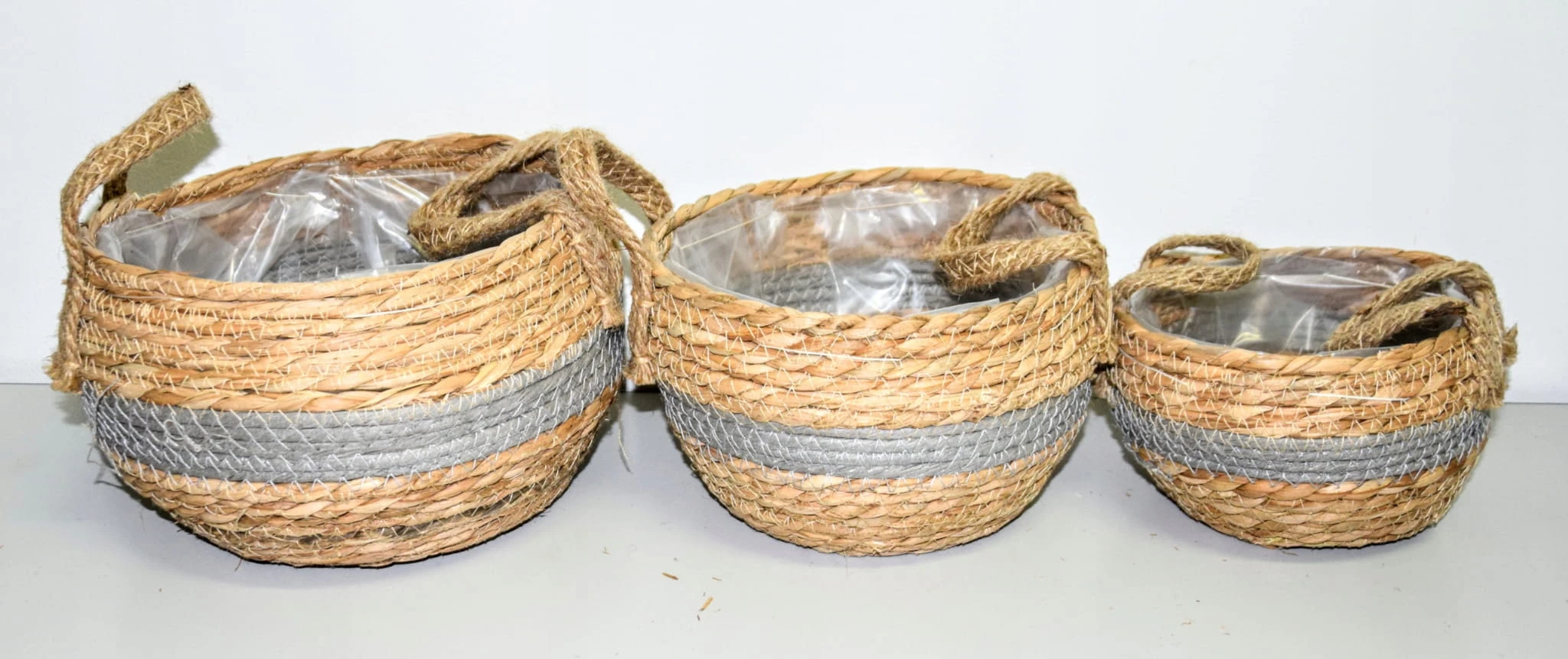 Komplet 3 plecionych koszyków wyściełanych folią. W razie potrzeby, folię można z łatwością odpruć.