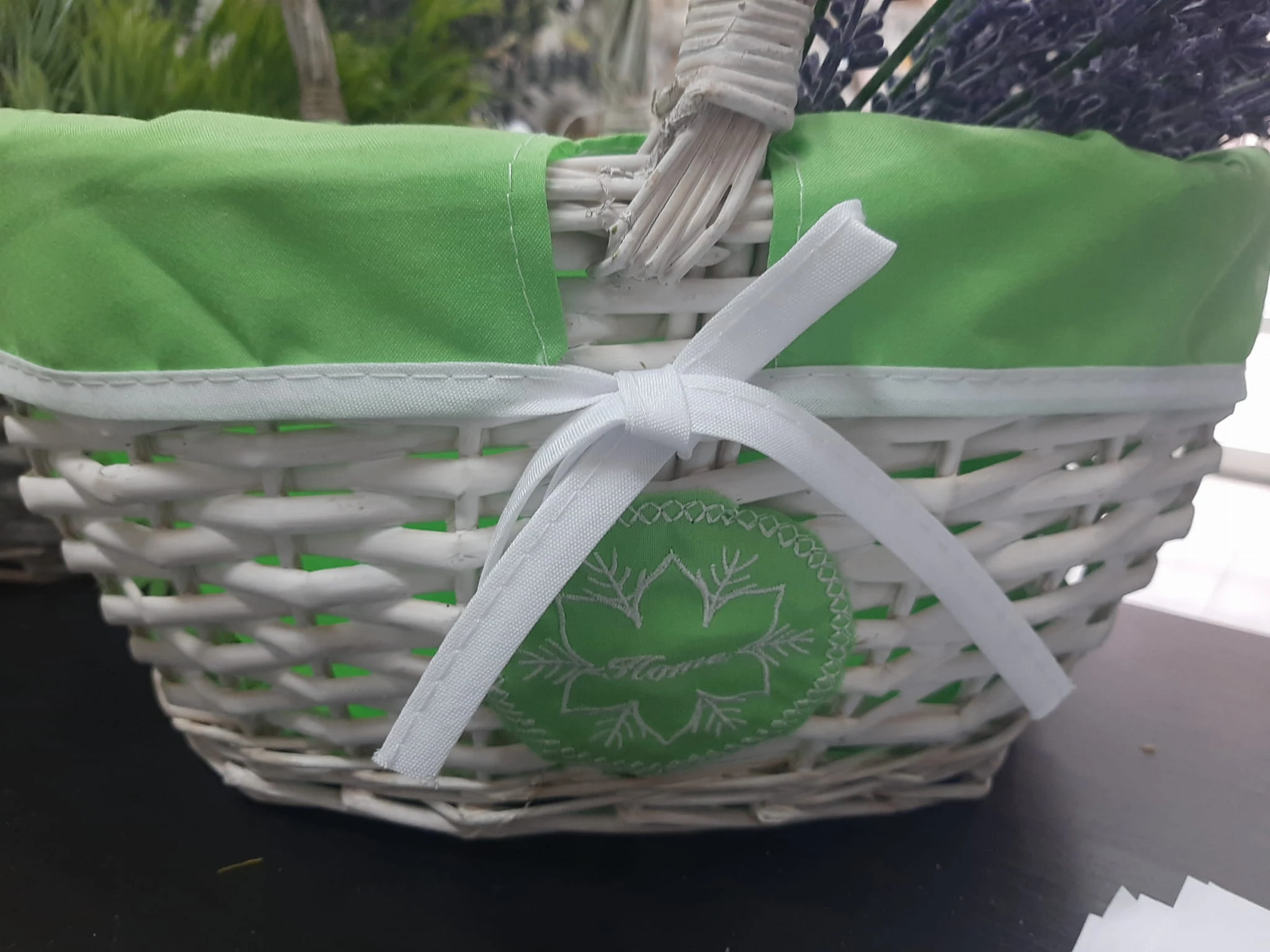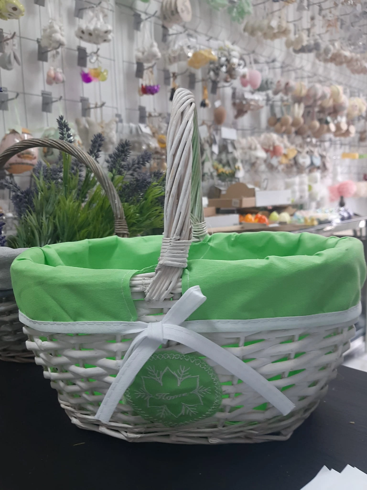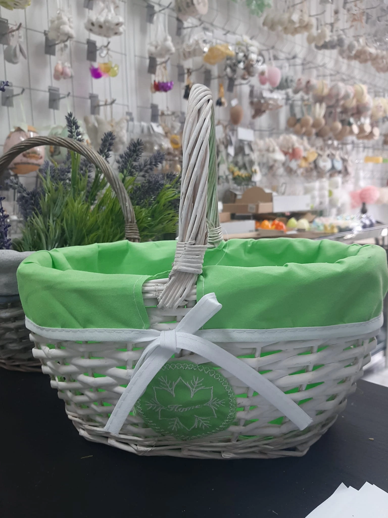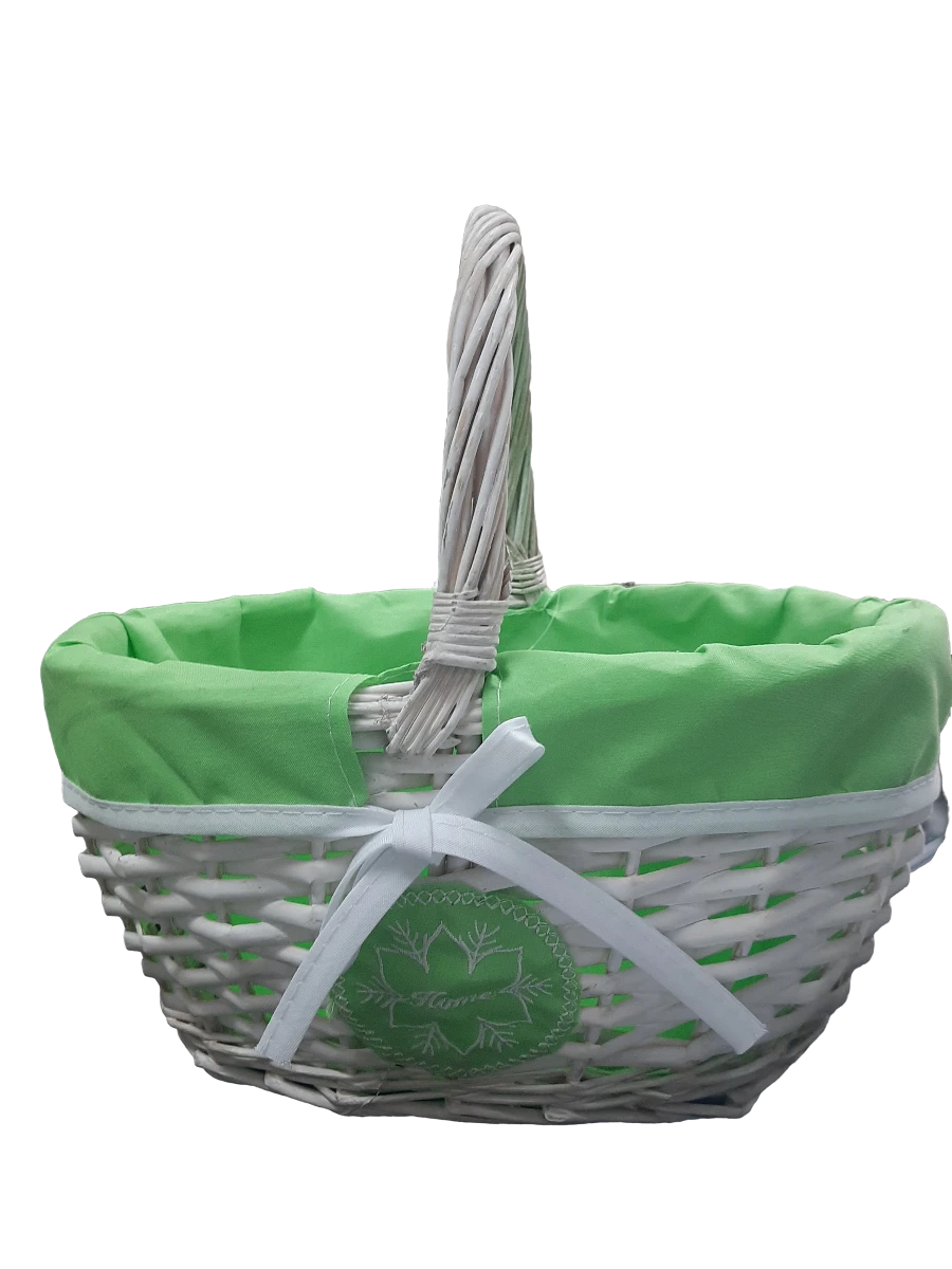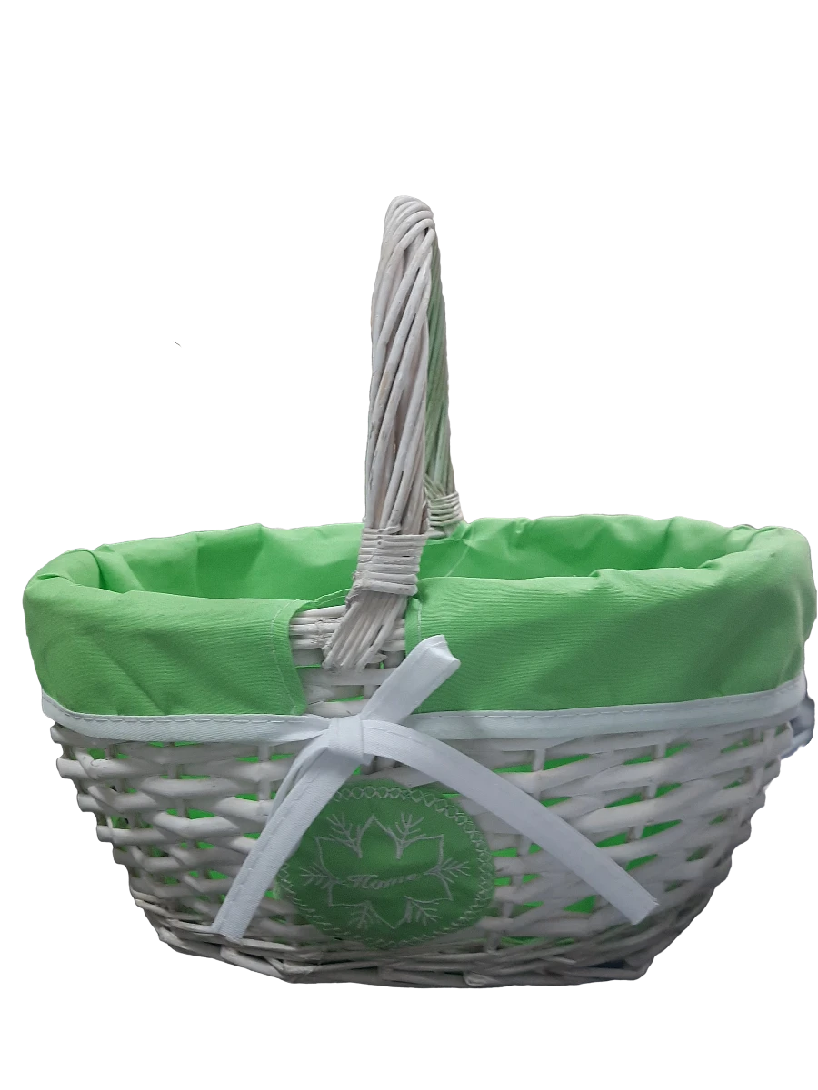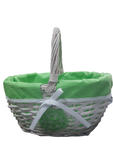 koszyk z poręcznym uchwytem. Wnętrze wyściełane jest zielonym, miękkim materiałem. Na zewnątrz znajduje się biała kokardka a pod nią zielone kółeczko z napisem. Modny koszyk wiklinowy, z rączką można wstawić do każdego pomieszczenia w domu. Koszyk w białym kolorze sprawdzi się podczas wypadów piknikowych. Ozdobny koszyk doskonale prezentować się będzie również podczas święcenia potraw w okresie świątecznym.