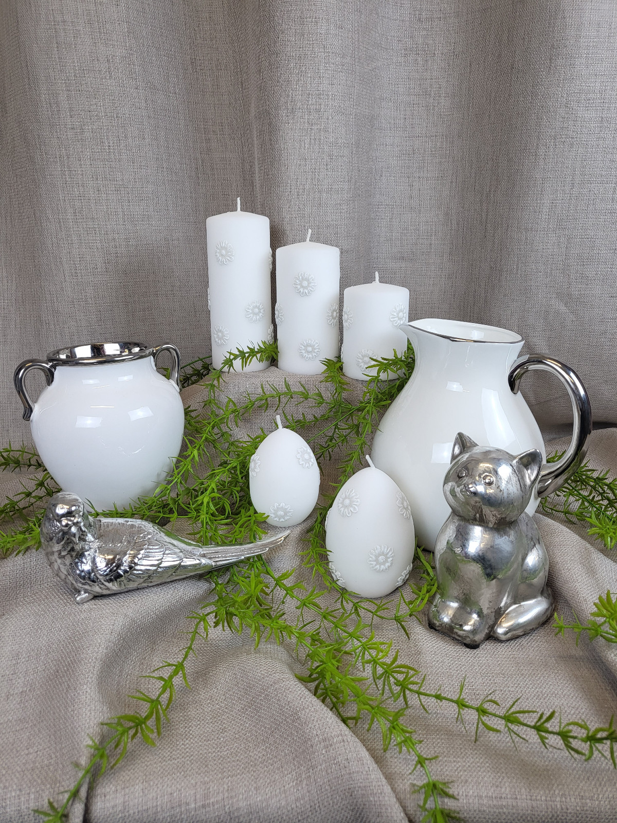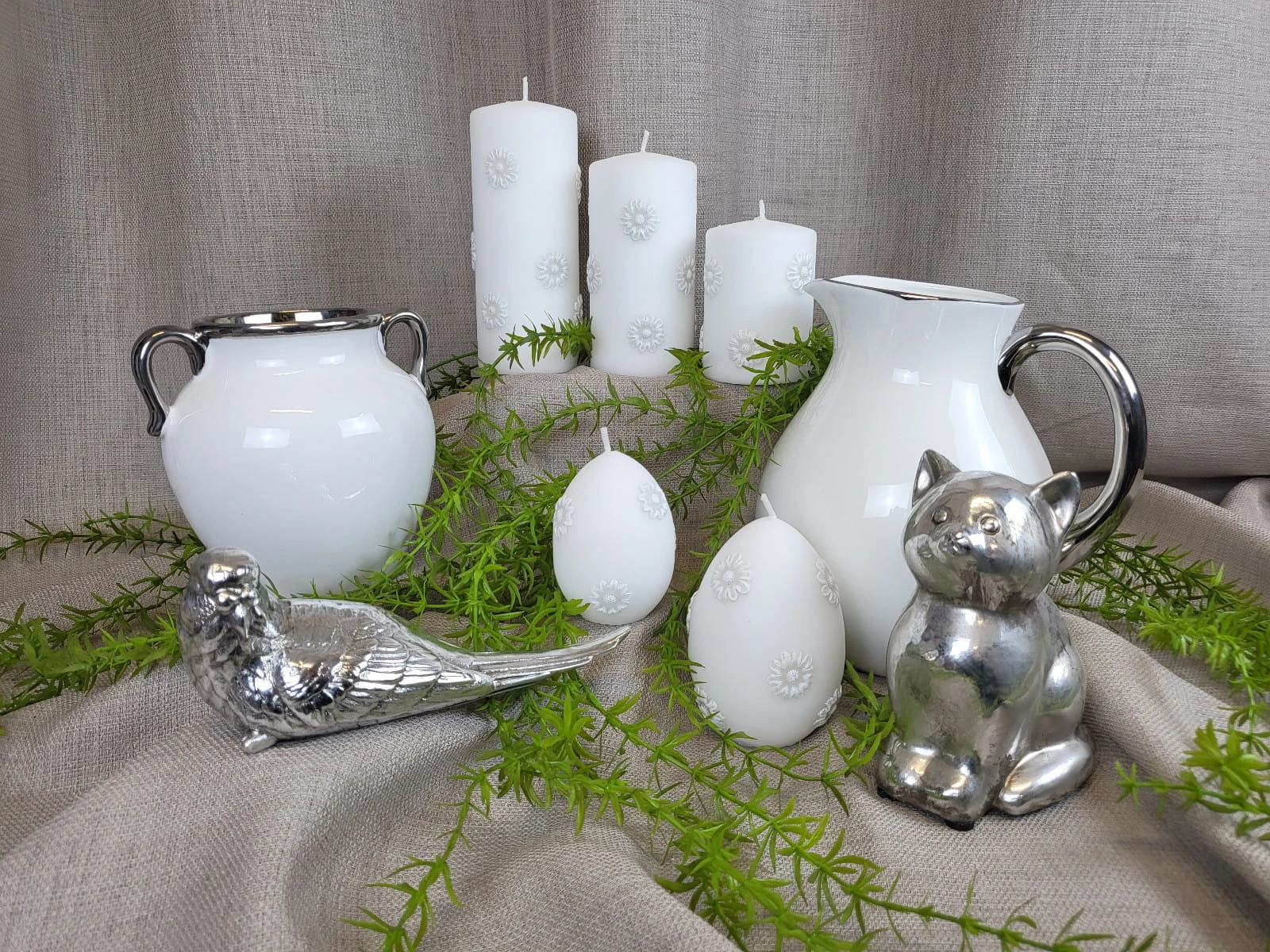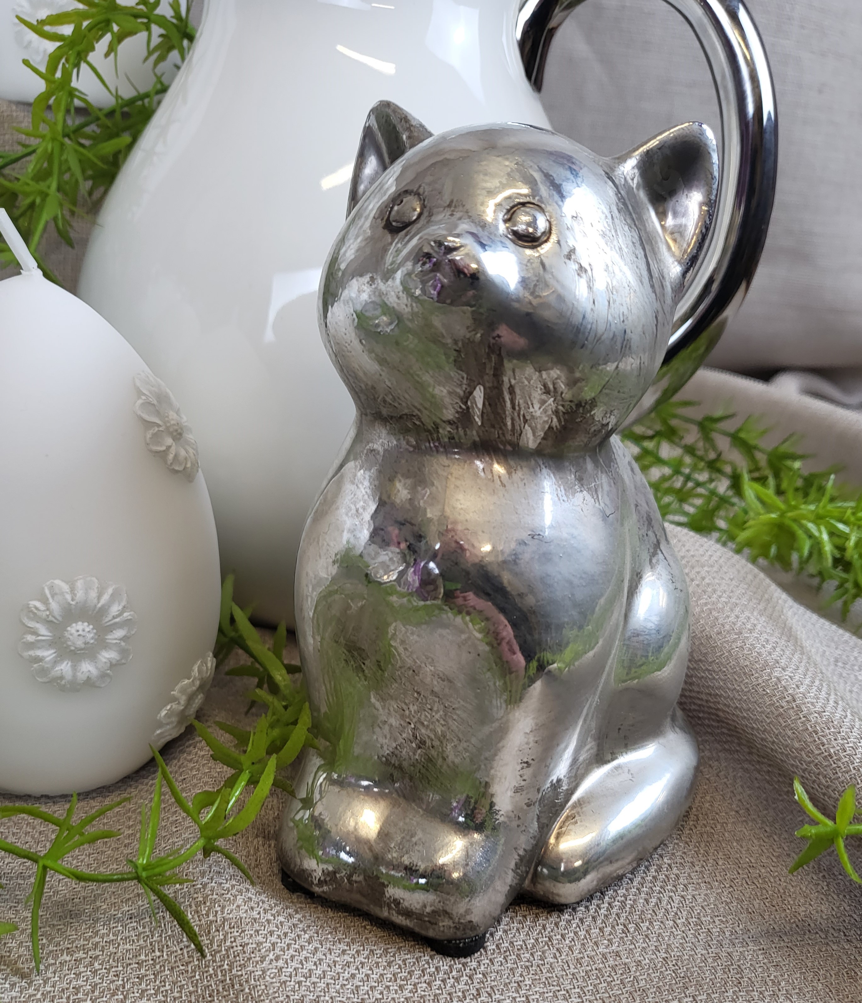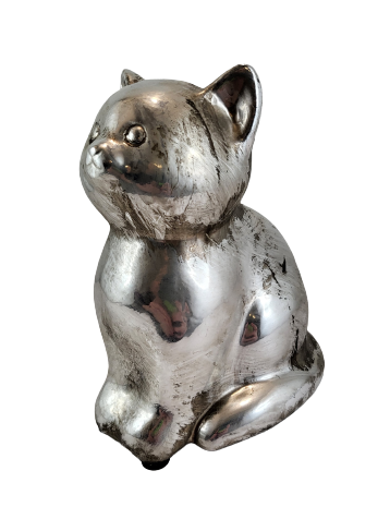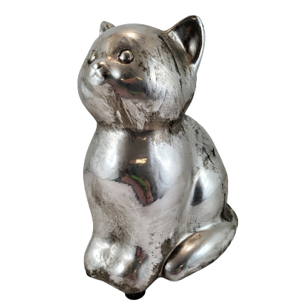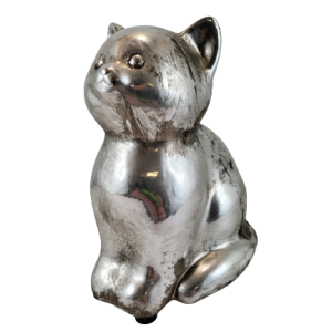 Ceramiczna figurka w kształcie uroczego kotka w srebrnym kolorze.