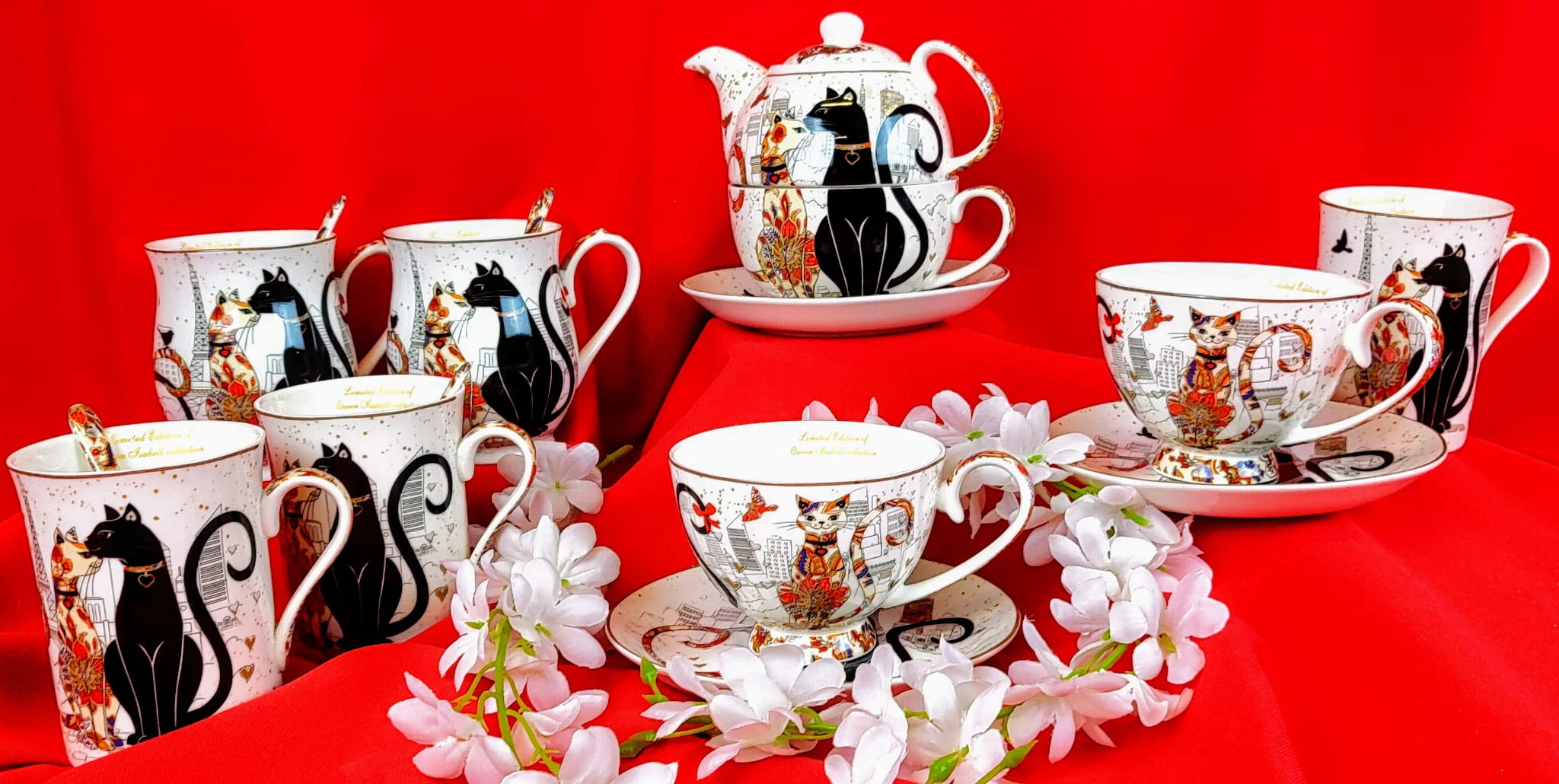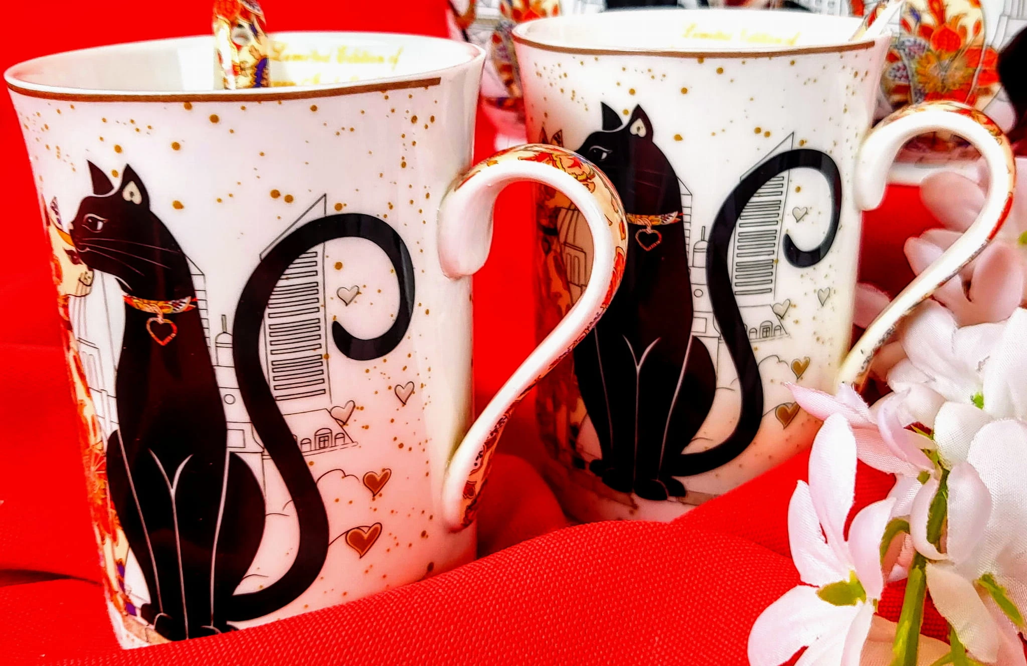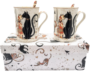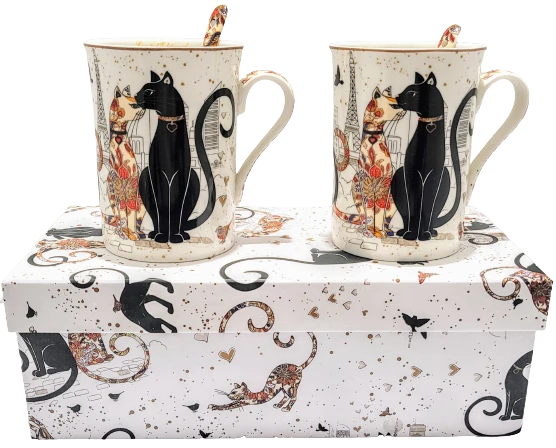 Elegancki zestaw kubków z motywem kotów w pudełku.