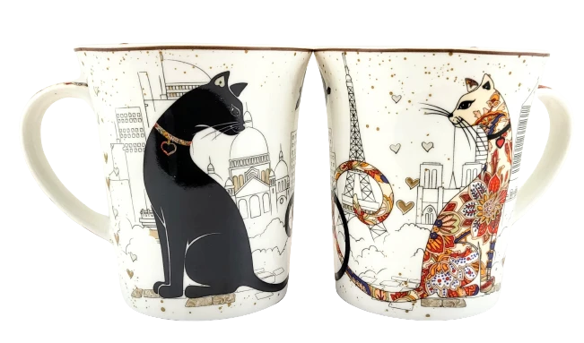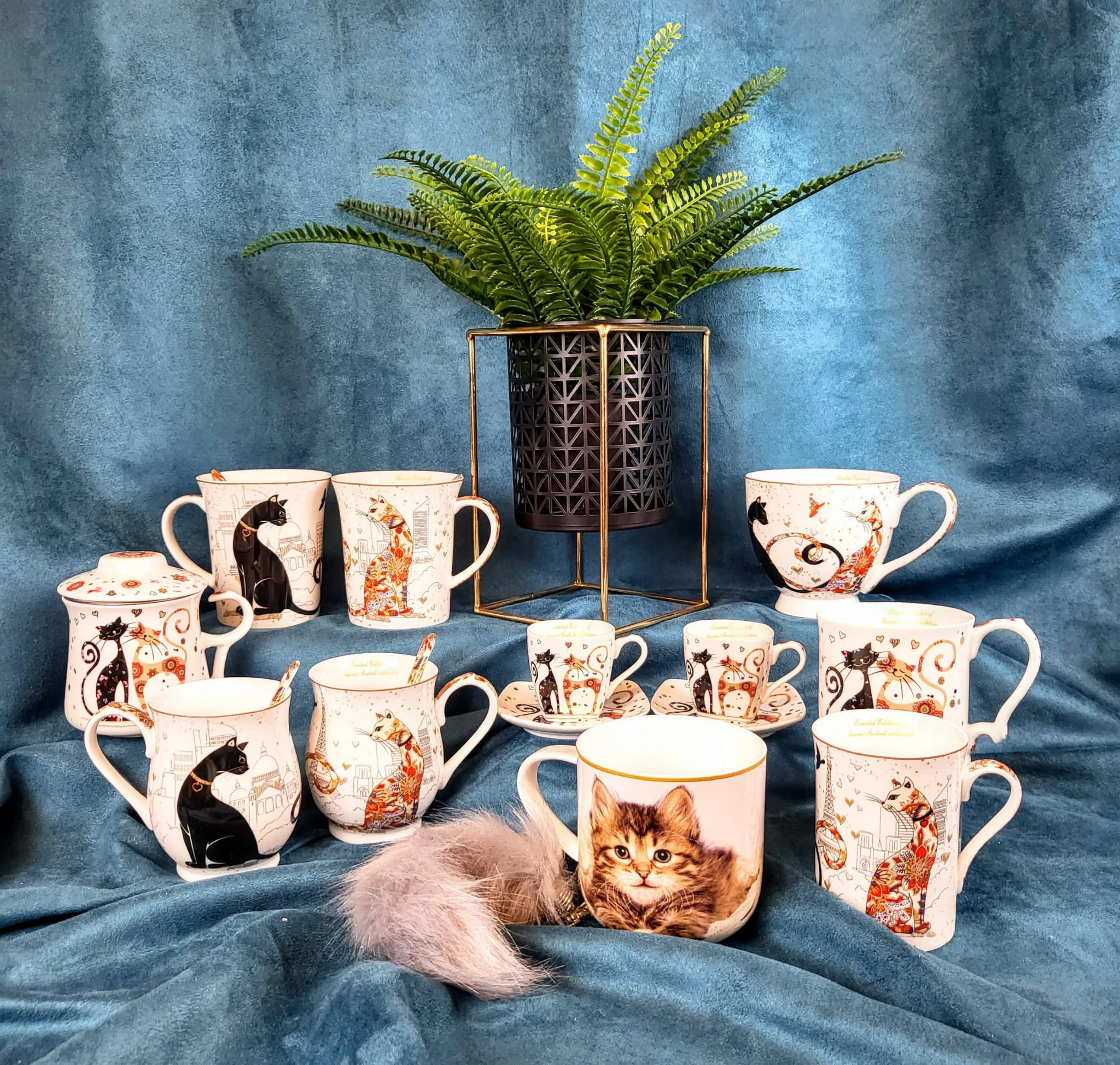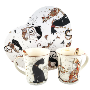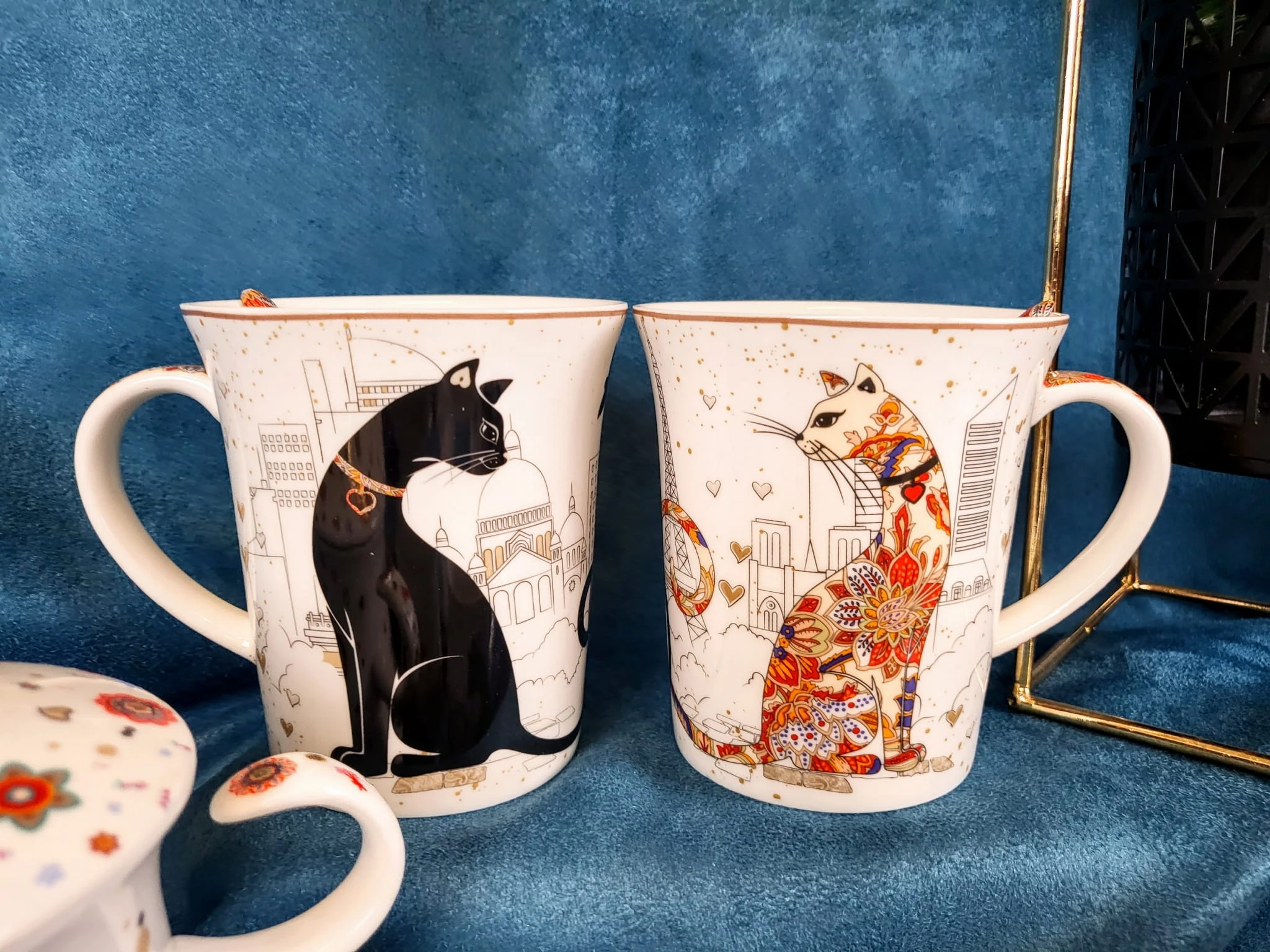 Elegancki zestaw kubków z motywem kotów w pudełku.