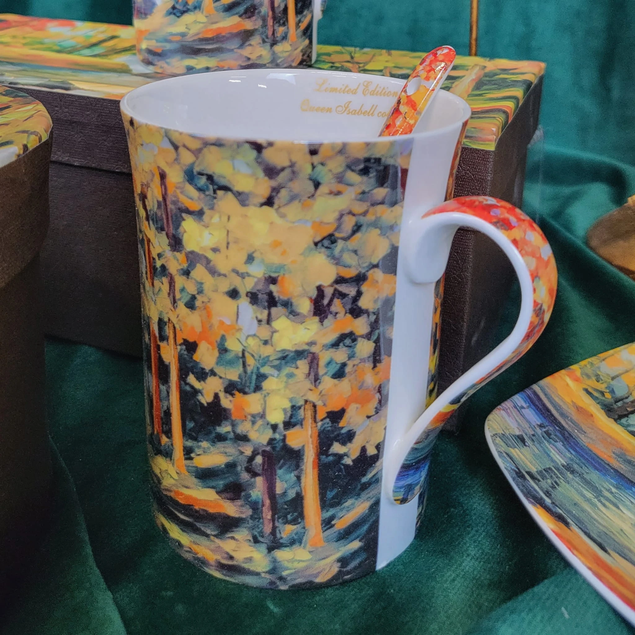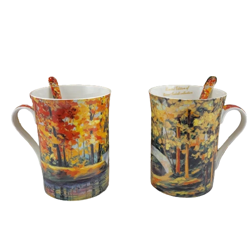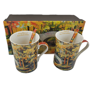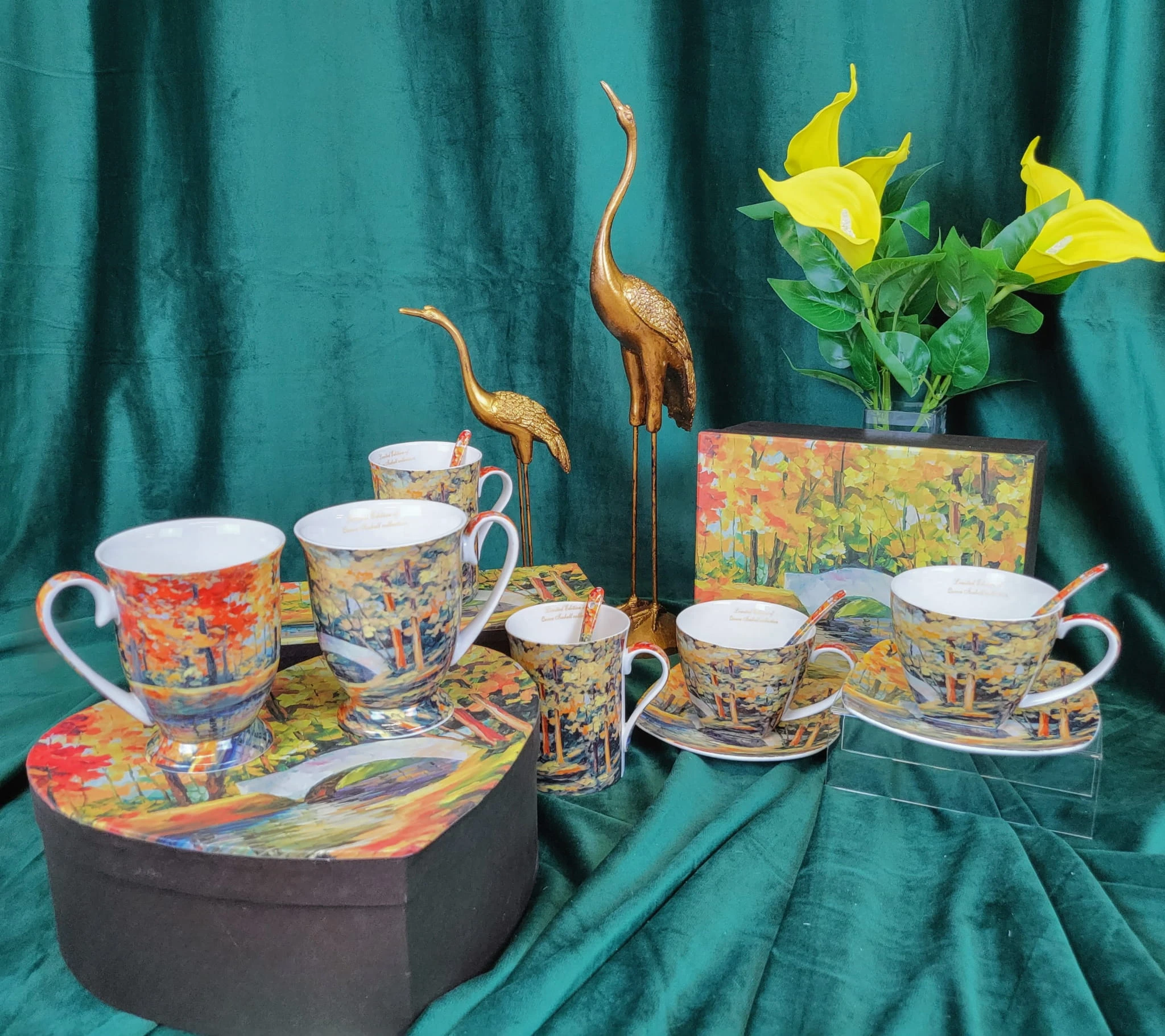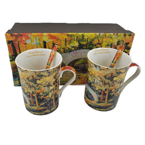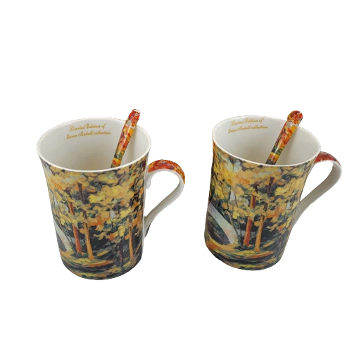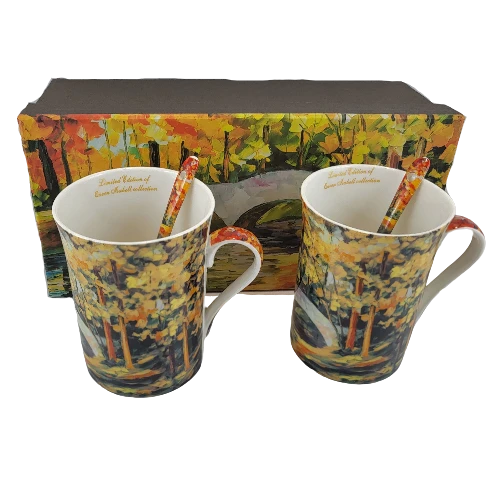 Elegancki zestaw dwóch kubków z łyżeczkami z motywem krajobrazu w pudełku. Idealny pomysł na upominek dla miłośników przyrody, sztuki czy też klasycznej elegancji.